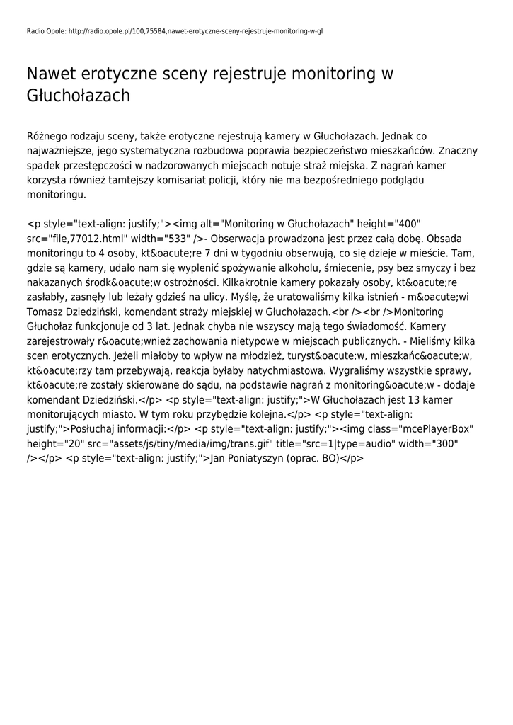 Radio Opole: http://radio.opole.pl/100,75584,nawet-erotyczne-sceny-rejestruje-monitoring-w-gl Nawet erotyczne sceny rejestruje monitoring w Głuchołazach Różnego rodzaju sceny, także erotyczne rejestrują kamery w Głuchołazach. Jednak co najważniejsze, jego systematyczna rozbudowa poprawia bezpieczeństwo mieszkańców. Znaczny spadek przestępczości w nadzorowanych miejscach notuje straż miejska. Z nagrań kamer korzysta również tamtejszy komisariat policji, który nie ma bezpośredniego podglądu monitoringu. <p style="text-align: justify;"><img alt="Monitoring w Głuchołazach" height="400" src="file,77012.html" width="533" />- Obserwacja prowadzona jest przez całą dobę. Obsada monitoringu to 4 osoby, które 7 dni w tygodniu obserwują, co się dzieje w mieście. Tam, gdzie są kamery, udało nam się wyplenić spożywanie alkoholu, śmiecenie, psy bez smyczy i bez nakazanych środków ostrożności. Kilkakrotnie kamery pokazały osoby, które zasłabły, zasnęły lub leżały gdzieś na ulicy. Myślę, że uratowaliśmy kilka istnień - mówi Tomasz Dziedziński, komendant straży miejskiej w Głuchołazach.<br /><br />Monitoring Głuchołaz funkcjonuje od 3 lat. Jednak chyba nie wszyscy mają tego świadomość. Kamery zarejestrowały również zachowania nietypowe w miejscach publicznych. - Mieliśmy kilka scen erotycznych. Jeżeli miałoby to wpływ na młodzież, turystów, mieszkańców, którzy tam przebywają, reakcja byłaby natychmiastowa. Wygraliśmy wszystkie sprawy, które zostały skierowane do sądu, na podstawie nagrań z monitoringów - dodaje komendant Dziedziński.</p> <p style="text-align: justify;">W Głuchołazach jest 13 kamer monitorujących miasto. W tym roku przybędzie kolejna.</p> <p style="text-align: justify;">Posłuchaj informacji:</p> <p style="text-align: justify;"><img class="mcePlayerBox" height="20" src="assets/js/tiny/media/img/trans.gif" title="src=1|type=audio" width="300" /></p> <p style="text-align: justify;">Jan Poniatyszyn (oprac. BO)</p>