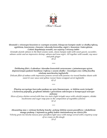 Uramaki z różowym łososiem w czarnym sezamie, klasyczne kampio maki ze słodką tykwą, ogórkiem, kawiorem z łososia i okazałą krewetką, nigiri z łososiem i tuńczykiem. Całość dopełniają wasabi, sos sojowy i różowy imbir Uramaki of pink salmon in the black sesame seeds, classic kampio maki with sweet gourd, cucumber, salmon caviar and an impressive shrimp, salmon and tuna nigiri. All together with wasabi, soy sauce and pink ginger 28 zł **** Delikatny filet z Labraksa i dorodne kreweteki serwowane z jaśminowym ryżem doprawionym pędami bambusa i tykwą z sosem słodko - kwaśnym oraz żółtą fasolką otuloną marchewką tagliatelle Delicate fillet of seabass with impressive prawns served with jasmine rice tossed bamboo shoots with sweet & sour sauce and yellow runner beans wrapped carrot tagliatelle 43 zł **** Plastry soczystego kurczaka podane na ryżu limonowym , w lekkim sosie teriyaki z kolorową papryką, grzybami shitake i groszkiem cukrowym w kompozycji warzyw julienne Slices of juicy chicken served with lime rice and a light teriyaki sauce with colorful peppers, shitake mushrooms and sugar snap peas in the composition of vegetables julienne 32 zł **** Aksamitny mus z zielonej herbaty Sencha polany lekkim sosem passiflora z dodatkiem mango podany z tajemniczą gałką lodów śmietankowy na cieście filo Velvety green tea Sencha mousse pour passiflora light sauce with mango served with a mystery scoop of ice cream on filo dough 19 zł