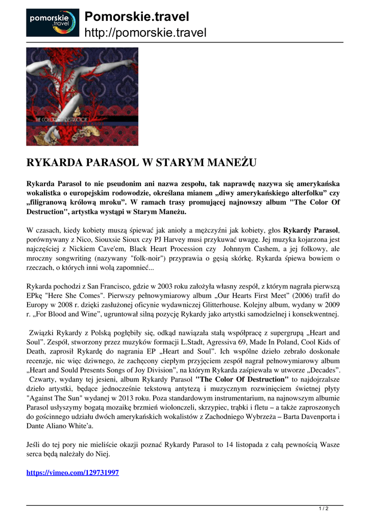 Pomorskie.travel http://pomorskie.travel RYKARDA PARASOL W STARYM MANEŻU Rykarda Parasol to nie pseudonim ani nazwa zespołu, tak naprawdę nazywa się amerykańska wokalistka o europejskim rodowodzie, określana mianem „diwy amerykańskiego alterfolku” czy „filigranową królową mroku”. W ramach trasy promującej najnowszy album "The Color Of Destruction", artystka wystąpi w Starym Maneżu. W czasach, kiedy kobiety muszą śpiewać jak anioły a mężczyźni jak kobiety, głos Rykardy Parasol, porównywany z Nico, Siouxsie Sioux czy PJ Harvey musi przykuwać uwagę. Jej muzyka kojarzona jest najczęściej z Nickiem Cave'em, Black Heart Procession czy Johnnym Cashem, a jej folkowy, ale mroczny songwriting (nazywany "folk-noir") przyprawia o gęsią skórkę. Rykarda śpiewa bowiem o rzeczach, o których inni wolą zapomnieć... Rykarda pochodzi z San Francisco, gdzie w 2003 roku założyła własny zespół, z którym nagrała pierwszą EPkę "Here She Comes". Pierwszy pełnowymiarowy album „Our Hearts First Meet” (2006) trafił do Europy w 2008 r. dzięki zasłużonej oficynie wydawniczej Glitterhouse. Kolejny album, wydany w 2009 r. „For Blood and Wine”, ugruntował silną pozycję Rykardy jako artystki samodzielnej i konsekwentnej. Związki Rykardy z Polską pogłębiły się, odkąd nawiązała stałą współpracę z supergrupą „Heart and Soul”. Zespół, stworzony przez muzyków formacji L.Stadt, Agressiva 69, Made In Poland, Cool Kids of Death, zaprosił Rykardę do nagrania EP „Heart and Soul”. Ich wspólne dzieło zebrało doskonałe recenzje, nic więc dziwnego, że zachęcony ciepłym przyjęciem zespół nagrał pełnowymiarowy album „Heart and Sould Presents Songs of Joy Division”, na którym Rykarda zaśpiewała w utworze „Decades”. Czwarty, wydany tej jesieni, album Rykardy Parasol "The Color Of Destruction" to najdojrzalsze dzieło artystki, będące jednocześnie tekstową antytezą i muzycznym rozwinięciem świetnej płyty "Against The Sun" wydanej w 2013 roku. Poza standardowym instrumentarium, na najnowszym albumie Parasol usłyszymy bogatą mozaikę brzmień wiolonczeli, skrzypiec, trąbki i fletu – a także zaproszonych do gościnnego udziału dwóch amerykańskich wokalistów z Zachodniego Wybrzeża – Barta Davenporta i Dante Aliano White’a. Jeśli do tej pory nie mieliście okazji poznać Rykardy Parasol to 14 listopada z całą pewnością Wasze serca będą należały do Niej. https://vimeo.com/129731997 1/2 Pomorskie.travel http://pomorskie.travel 14 listopada 2015 (sobota) godz. 20:00 STARY MANEŻ, ul. Słowackiego 23, Garnizon, Gdańsk Wrzeszcz BILETY: 40 PLN miejsca nienumerowane, 50 PLN w dniu koncertu Od 160 PLN loże Zapraszamy! PCIT 2/2 Powered by TCPDF (www.tcpdf.org)