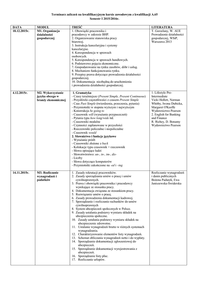 Terminarz zaliczeń na kwalifikacyjnym kursie zawodowym z kwalifikacji A.65 Semestr I 2015/2016r. DATA 18.12.2015r. MODUŁ M1. Organizacja działalności gospodarczej TREŚĆ 1. Obowiązki pracownika i pracodawcy w zakresie BHP. 2. Organizowanie stanowiska pracy biurowej. 3. Instrukcja kancelaryjna i systemy kancelaryjne. 4. Korespondencja w sprawach osobowych. 5. Korespondencja w sprawach handlowych. 6. Podstawowe pojęcia ekonomiczne. 7. Gospodarowanie na rynku zasobów, dóbr i usług. 8. Mechanizm funkcjonowania rynku. 9. Przepisy prawa dotyczące prowadzenia działalności gospodarczej. 10. Dokumentacja niezbędną do uruchomienia i prowadzenia działalności gospodarczej. LITERATURA T. Gorzelany, W. AUE Prowadzenie działalności gospodarczej, WSiP, Warszawa 2013 4.12.2015r. M2. Wykorzystanie języka obcego w branży ekonomicznej 1. Gramatyka - Czasy teraźniejsze (Present Simple, Present Continuous) - Przysłówki częstotliwości z czasem Present Simple - Czas Past Simple (twierdzenia, przeczenia, pytania) - Przymiotniki w stopniu wyższym i najwyższym - Konstrukcja be going to - Czasownik will (wyrażanie przypuszczeń) - Pytania typu how long/wide itd. - Czasowniki modalne - Czynności zaplanowane w przyszłości - Rzeczowniki policzalne i niepoliczalne - Czasownik would 2. Słownictwo i funkcje językowe - Wyrażanie próśb - Czasowniki złożone z back - Kolokacje typu czasownik + rzeczownik - Słowa opisujące ludzi - Słowotwórstwo: un-, in-, im-, dis- Liczby - Słowa dotyczące komputerów - Przymiotniki zakończone na -ed i –ing 1. Lifestyle PreIntermediate Vicki Hollett, Norman Whitby, Iwona Dubicka, Margaret O'Keeffe Wydawnictwo Pearson 2. English for Banking and Finance R. Richey, D. Bonamy Wydawnictwo Pearson 14.11.2015r. M3. Rozliczanie wynagrodzeń i podatków 1. Zasady rekrutacji pracowników. 2. Zasady sporządzania umów o pracę i umów cywilnoprawnych. 3. Prawa i obowiązki pracownika i pracodawcy wynikające ze stosunku pracy. 4. Dokumentacja związana ze stosunkiem pracy. 5. Rozwiązanie umów o pracę. 6. Zasady prowadzenia dokumentacji kadrowej. 7. Sporządzanie i rozliczanie rachunków do umów cywilnoprawnych 8. System ubezpieczeń społecznych w Polsce. 9. Zasady ustalania podstawy wymiaru składek na ubezpieczenia społeczne. 10. Zasady ustalania podstawy wymiaru składek na ubezpieczenie zdrowotne. 11. Ustalanie wynagrodzeń brutto w różnych systemach wynagradzania. 12. Charakteryzowanie elementów listy wynagrodzeń. 13. Schemat obliczania wynagrodzeń netto i do wypłaty. 14. Sporządzanie dokumentacji zgłoszeniowej do ubezpieczeń. 15. Sporządzanie dokumentacji wyrejestrowania z ubezpieczeń. 16. Sporządzanie listy płac. 17. Rozliczanie urlopów. Rozliczanie wynagrodzeń i danin publicznych Bożena Padurek, Ewa Janiszewska-Świderska