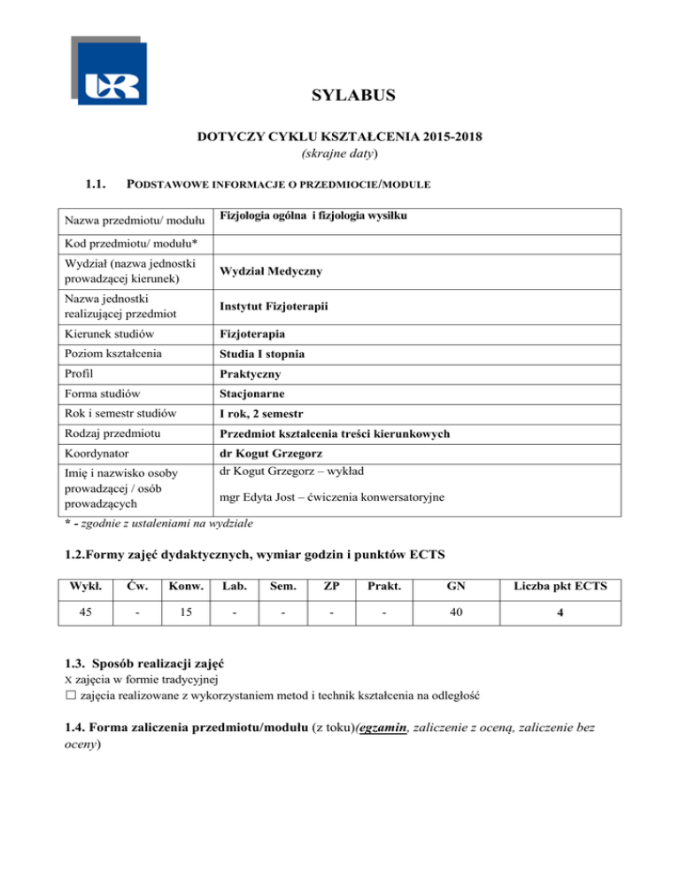 SYLABUS DOTYCZY CYKLU KSZTAŁCENIA 2015-2018 (skrajne daty) 1.1. PODSTAWOWE INFORMACJE O PRZEDMIOCIE/MODULE Nazwa przedmiotu/ modułu Fizjologia ogólna i fizjologia wysiłku Kod przedmiotu/ modułu* Wydział (nazwa jednostki prowadzącej kierunek) Wydział Medyczny Nazwa jednostki realizującej przedmiot Instytut Fizjoterapii Kierunek studiów Fizjoterapia Poziom kształcenia Studia I stopnia Profil Praktyczny Forma studiów Stacjonarne Rok i semestr studiów I rok, 2 semestr Rodzaj przedmiotu Przedmiot kształcenia treści kierunkowych Koordynator dr Kogut Grzegorz Imię i nazwisko osoby prowadzącej / osób prowadzących dr Kogut Grzegorz – wykład mgr Edyta Jost – ćwiczenia konwersatoryjne * - zgodnie z ustaleniami na wydziale 1.2.Formy zajęć dydaktycznych, wymiar godzin i punktów ECTS Wykł. Ćw. Konw. Lab. Sem. ZP Prakt. GN Liczba pkt ECTS 45 - 15 - - - - 40 4 1.3. Sposób realizacji zajęć zajęcia w formie tradycyjnej ☐ zajęcia realizowane z wykorzystaniem metod i technik kształcenia na odległość X 1.4. Forma zaliczenia przedmiotu/modułu (z toku)(egzamin, zaliczenie z oceną, zaliczenie bez oceny) 2.WYMAGANIA WSTĘPNE Znajomość fizjologii człowieka w zakresie szkoły średniej. Podstawy anatomii, biologii komórki i biochemii. 3. CELE, EFEKTY KSZTAŁCENIA , TREŚCI PROGRAMOWE I STOSOWANE METODY DYDAKTYCZNE 3.1. Cele przedmiotu/modułu C1 Poznanie fizjologii człowieka jako podstawy do zrozumienia przedmiotów klinicznych. C2 C3 Poznanie fizjologii wysiłku fizycznego z oceną wydolności fizycznej, organizmu. Rola treningu fizycznego i wpływ wysiłku fizycznego na pracę poszczególnych układów. Zrozumienie mechanizmów warunkujących prawidłowe funkcjonowanie poszczególnych układów i narządów organizmu człowieka. 3.2 EFEKTY KSZTAŁCENIA DLA PRZEDMIOTU/ MODUŁU EK ( efekt kształcenia) EK_01 Treść efektu kształcenia zdefiniowanego dla przedmiotu (modułu) Odniesienie do efektów kierunkowych (KEK) Rozumie i rozpoznaje mechanizm powstawania, modulacji K1P_W05 (++) i percepcji bólu. EK_02 Posiada ogólną wiedzę dotyczącą funkcjonowania K1P_W07 (+++) poszczególnych układów człowieka: krążenia, oddychania, wydalniczego, endokrynologicznego, narządów zmysłu, oraz narządu ruchu człowieka. EK_03 Potrafi wykorzystać wiedzę z zakresu funkcjonowania układów K1P_U01 (++) człowieka związanych z poruszaniem się, sterowaniem ruchami i wysiłkiem fizycznym dla wyjaśnienia ich struktury i funkcji. EK_04 Samodzielnie wykonuje powierzone i właściwie organizuje prace własne. 3.3 mu zadania K1P_K08 (++) TREŚCI PROGRAMOWE A. Problematyka wykładu Treści merytoryczne Przedstawienie charakterystyki przedmiotu i realizowanych zagadnień oraz formy zaliczenia przedmiotu. Przedstawienie wymaganego piśmiennictwa podstawowego i uzupełniającego. UKŁAD ODDECHOWY – Oddychanie a wentylacja. Budowa i funkcja poszczególnych odcinków układu oddechowego, Mechanizmy wentylacji. – wdech i wydech Rola opłucnej i jamy opłucnowej. Pojemności i objętości oddechowe, spirometria. Wymiana gazowa, dyfuzja, gazometria. Surfaktant. Regulacja oddychania. Ośrodek oddechowy. Zmiany parametrów układu oddechowego w czasie wysiłku. UKŁAD POKARMOWY – Budowa i czynność poszczególnych odcinków układu trawiennego : jamy ustnej, przełyku, żołądka i jelit Motoryka, Gruczoły przewodu pokarmowego, wydzielanie – enzymy trawienne i ich aktywność, wchłanianie. Regulacja funkcji przewodu pokarmowego – nerwowa i hormonalna – hormony miejscowe. Funkcje wątroby KREW – Skład i znaczenie krwi. Morfologia krwi. Hematopoeza. Erytrocyty –transport gazów, hemoglobina, rodzaje hemoglobiny. Obrót żelazem, Grupy krwi, próba krzyżowa. Leukocyty – mechanizmy ochronne i obronne ustroju. Funkcj poszczególnych rodzajów białych ciałek krwi. Rola granulocytów Odpowiedź immunologiczna ustroju. Rola monocytów w odpowiedzi immunologicznej. Odpowiedź pierwotna i wtórna, komórkowa i humoralna. Przeciwciała. Trombocyty – rola w hemostazie. Układ krzepnięcia i fibrynoliza. Osocze krwi – skład i rola poszczególnych frakcji. UKŁAD WEWNĄTRZWYDZIELNICZY - Regulacja wydzielaniai. Układy sprzężeń zwrotnych, rodzaje regulacji – hormonalna, nerwowa i metaboliczna, Mechanizmy działania różnych receptorów ; błonowych, cytoplazmatycznych i jądrowych. Rodzaje hormonów, synteza i unieczynnianie. Podwzgórze i przysadka – hormony. Układ wrotny. Obwodowe gruczoły dokrewne. Działanie i mechanizmy regulujące produkcję i uwalnianie poszczególnych hormonów SERCE - Budowa i czynność bioelektryczna mięśnia sercowego. Czynność i rola serca. Aktywność elektryczna serca. EKG – istota, odprowadzenia, kształt krzywej i interpretacja . Czynność mechaniczna serca – cykl sercowy. Ciśnienia w jamach serca. Fazy cyklu sercowego w odniesieniu do zmian elektrycznych Praca zastawek – tony serca. Echokardiografia. Zmiany parametrów pracy serca w czasie wysiłku. Prawo serca Starlinga. KRĄŻENIE – Budowa poszczególnych odcinków łożyska naczyniowego. Zbiornik żylny, tętniczy i kapilarny. Funkcja i właściwości poszczególnych części układu krążenia. Najważniejsze prawa hemodynamiczne. Ciśnienie krwi, tętno. Odrębność krążenia płucnego, mózgowego i wieńcowego. Zmiany zachodzące w układzie krążenia w czasie wysiłku. NERKA i GOSPODARKA WODNO – ELEKTROLITOWA Przestrzenie wodne. Bilans wodny organizmu, elektrolity. Mechanizmy odpowiedzialne za utrzymanie równowagi wodno-elektrolitowej ustroju. Nerka – budowa i funkcja. Nefron – jako jednostka czynnościowa nerki – budowa i mechanizm powstawania moczu. Filtracja kłębuszkowa, resorpcja i sekrecja kanalikowa. Funkcja endokrynna nerki, układ Renina – angiotensyna – aldosteron. Rola pozostałych odcinków układu moczowego. Mechanizm mikcji i podstawowe wartości urodynamiczne. UKŁAD ROZRODCZY i PROKREACJA – Żeński narząd rodny - rola po