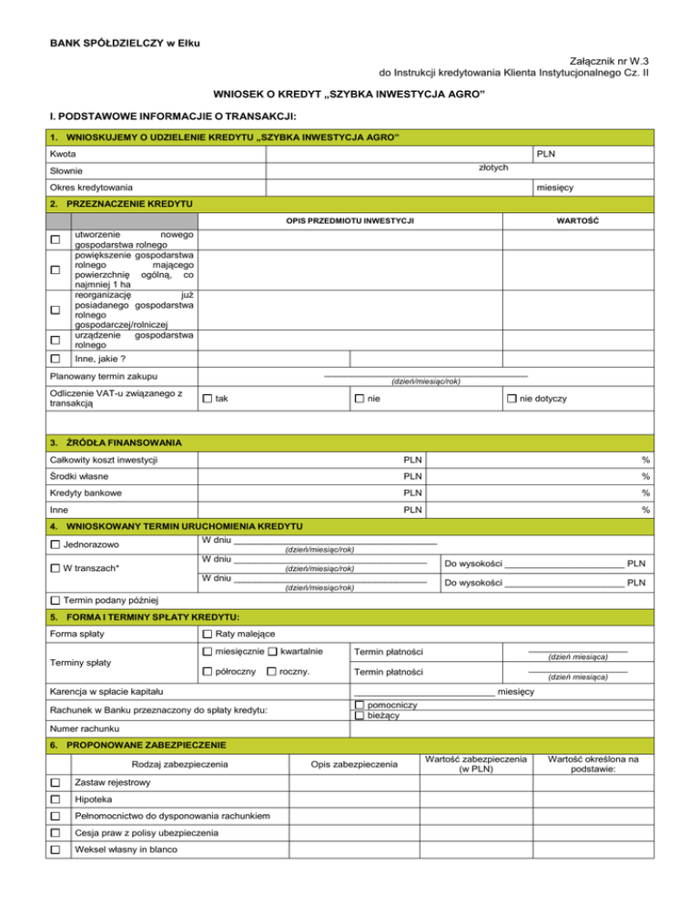 BANK SPÓŁDZIELCZY w Ełku Załącznik nr W.3 do Instrukcji kredytowania Klienta Instytucjonalnego Cz. II WNIOSEK O KREDYT „SZYBKA INWESTYCJA AGRO” I. PODSTAWOWE INFORMACJIE O TRANSAKCJI: 1. WNIOSKUJEMY O UDZIELENIE KREDYTU „SZYBKA INWESTYCJA AGRO” Kwota PLN złotych Słownie miesięcy Okres kredytowania 2. PRZEZNACZENIE KREDYTU WARTOŚĆ OPIS PRZEDMIOTU INWESTYCJI utworzenie nowego gospodarstwa rolnego powiększenie gospodarstwa rolnego mającego powierzchnię ogólną, co najmniej 1 ha reorganizację już posiadanego gospodarstwa rolnego gospodarczej/rolniczej urządzenie gospodarstwa rolnego Inne, jakie ? _______________________________________ Planowany termin zakupu Odliczenie VAT-u związanego z transakcją (dzień/miesiąc/rok) tak nie nie dotyczy 3. ŹRÓDŁA FINANSOWANIA Całkowity koszt inwestycji PLN % Środki własne PLN % Kredyty bankowe PLN % Inne PLN % 4. WNIOSKOWANY TERMIN URUCHOMIENIA KREDYTU W dniu _______________________________________ Jednorazowo (dzień/miesiąc/rok) W dniu _____________________________________ (dzień/miesiąc/rok) W transzach* W dniu _____________________________________ (dzień/miesiąc/rok) Do wysokości _______________________ PLN Do wysokości _______________________ PLN Termin podany później 5. FORMA I TERMINY SPŁATY KREDYTU: Forma spłaty Raty malejące Terminy spłaty miesięcznie kwartalnie półroczny roczny. Karencja w spłacie kapitału Rachunek w Banku przeznaczony do spłaty kredytu: Termin płatności ___________________ Termin płatności ___________________ (dzień miesiąca) (dzień miesiąca) ___________________________ miesięcy pomocniczy bieżący Numer rachunku 6. PROPONOWANE ZABEZPIECZENIE Rodzaj zabezpieczenia Zastaw rejestrowy Hipoteka Pełnomocnictwo do dysponowania rachunkiem Cesja praw z polisy ubezpieczenia Weksel własny in blanco Opis zabezpieczenia Wartość zabezpieczenia (w PLN) Wartość określona na podstawie: Inne Łączna wartość zabezpieczeń II. INFORMACJE O WNIOSKODAWCY 1. WNIOSKODAWCA Nazwa / Imię i Nazwisko Siedziba / Adres REGON / PESEL/ Nr dowodu osobistego NIP Telefon E-mail OSOBA UPOWAŻNIONA DO KONTAKTÓW Z BANKIEM Imię i nazwisko Telefon GŁÓWNI UDZIAŁOWCY FIRMY Imię i Nazwisko / Nazwa Wielkość posiadanych udziałów (%) POWIĄZANIA KAPITAŁOWE Z INNYMI PODMIOTAMI: Nr dowodu tożsamości / PESEL / REGON / NIP Imię i nazwisko / Nazwa 2. Rodzaj powiązania INFORMACJE O PROWADZONEJ DZIAŁALNOŚCI: Księgi rachunkowe Podatkowa książka przychodów i rozchodów Ryczałt od przychodów ewidencjonowanych lub Karta podatkowa Inna forma Forma prowadzonej księgowości Okres prowadzenia działalności: _____________________________ miesięcy Rodzaj prowadzonej działalności nie tak ___________________________________________________ Działalność podlega sezonowości na czym polega ______________________________________________________ W ciągu ostatnich 12 miesięcy nastąpiła zmiana branży prowadzonej działalności Stopień uzależnienia od rynku 3. nie tak ___________________________________________________ podać poprzednią branżę ______________________________________________________ niski – wielu dostawców i odbiorców żaden nie przekracza 5% wartości dostaw lub sprzedaży przeciętny – 5 – 20% wartości dostaw lub sprzedaży zależna od jednego podmiotu wysoki – powyżej 20% wartości dostaw lub sprzedaży zależna od jednego podmiotu bardzo wysoki – dostawy lub sprzedaż uzależniona od jednego podmiotu INFORMACJE FINANSOWE Dane dotyczące roku poprzedzającego ostatni rok fiskalny Przychody ze sprzedaży Zysk / strata netto Amortyzacja* W przypadku prowadzenia księgowości w formie ksiąg rachunkowych oraz podatkowej księgi przychodów i rozchodów Strona 2 z 5 Dane dotyczące ostatniego roku fiskalnego III. Oświadczenia Wnioskodawcy 1) Oświadczam/y, że posiadam/y nie posiadam/y* zaległości wobec Zakładu Ubezpieczeń Społecznych i Urzędu Skarbowego, Kasy Rolniczego Ubezpieczenia Społecznego i Urzędu Gminy objętych / nie objętych ugodą*. 2) Oświadczam/y, że posiadamy/ nie posiadamy* zaległości wobec innych banków lub towarzystw leasingowych. 3) Oświadczam/y, że wobec nas toczą się/ nie toczą się* lub grożą / nie grożą* nam postępowania sądowe, administracyjne i inne mogące mieć wpływ na prowadzoną działalność lub zdolność do spłaty zaciągniętych zobowiązań. 4) Oświadczam/y, że została/ nie została* ogłoszona upadłość lub został / nie został* rozpoczęty proces likwidacji lub naprawczego lub zawieszenia działalności firmy. 5) Oświadczamy, że w okresie ostatnich 12 m-cy zostały / nie zostały* wystawione lub wygasły / nie wygasły* przekraczającej 1.000 PLN. postępowania tytuły egzekucyjne w kwocie 6) Oświadczam, że pozostaję / nie pozostaję* we wspólności majątkowej ze współmałżonkiem/współmałżonką** 7) Oświadczam/y, że jesteśmy/ nie jesteśmy* udziałowcami Banku Spółdzielczego w Ełku 8) Oświadczam/y, że następujące podmioty lub osoby powiązane, organizacyjnie, personalnie są / nie są* udziałowcami Banku Spółdzielczego w Ełku lub osobami zajmującymi w Banku kierownicze stanowiska lub funkcje w radzie nadzorczej lub w zarządzie Banku. 9) Oświadczam/y pod rygorem odpowiedzialności karnej przewidzianej w art. 297 § 1 Kodeksu karnego, że informacje podane w tym wniosku są zgodne ze stanem faktycznym. IV. Zgody Wnioskodawcy § 1. (stosuje się w przypadku Klientów nie będących os. fiz.)* 1. Oświadczam, że dobrowolnie wyrażam zgodę/nie wyrażam zgody* na przesyłanie informacji handlowej za pomocą środków komunikacji elektronicznej w rozumieniu ustawy o świadczeniu usług drogą elektroniczną z dnia 18 lipca 2002 r. (tj. Dz. U. 2014r. poz. 1422) w tym celu wskazuje adres poczty elektronicznej:……………………..………… 2. Oświadczam, że dobrowolnie wyrażam zgodę/ nie wyrażam zgody* na wykorzystanie podanych we wniosku kredytowym da