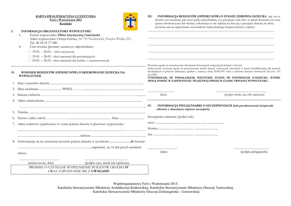 KARTA KWALIFIKACYJNA UCZESTNIKA Ferii z Wartościami 2013 Koninki I. 1. INFORMACJA ORGANIZATORA WYPOCZYNKU 4. II. Forma wypoczynku: Obóz turystyczny/narciarski Adres wypoczynku: Ostoja Górska, 34-735 Niedźwiedź, Poręba Wielka 251, Tel. 48 18 33 17 580 Czas trwania (prosimy zaznaczyć odpowiednio): 19.01. – 26.01. - obóz turystyczny 19.01. – 26.01.- obóz narciarski dla początkujących – 26.01.- obóz narciarski dla średnio- i zaawansowanych WNIOSEK RODZICÓW (OPIEKUNÓW) O SKIEROWANIE DZIECKA NA WYPOCZYNEK 1. Imię i nazwisko dziecka ........................................................................................................................... 2. Data urodzenia .............................. PESEL ………............................................................................... 3. Imiona rodziców………………………………………………………………………................ III. INFORMACJA RODZICÓW (OPIEKUNÓW) O STANIE ZDROWIA DZIECKA (np. na co dziecko jest uczulone, jak znosi jazdę samochodem, czy przyjmuje stale leki i w jakich ilościach, czy nosi aparat ortodontyczny lub okulary; informacje te nie wpłyną na decyzję o przyjęciu dziecka na obóz, pozwolą one na zapewnienie uczestnikowi maksymalnego bezpieczeństwa i opieki): .............................................................................................................................................................................................. .............................................................................................................................................................................................. .............................................................................................................................................................................................. .............................................................................................................................................................................................. .............................................................................................................................................................................................. Wyrażam zgodę na otrzymywanie informacji dotyczących wakacyjnych kolonii i obozów. Jednocześnie wyrażam zgodę na przetwarzanie moich danych osobowych zawartych w karcie kwalifikacyjnej dla potrzeb niezbędnych w procesie rekrutacji, zgodnie z ustawą z dnia 29.08.1997 roku o ochronie danych osobowych (dz.u.nr. 133 poz.883). STWIERDZAM, ŻE PODAŁAM(EM) WSZYSTKIE ZNANE MI INFORMACJE O DZIECKU, KTÓRE MOGĄ POMÓC W ZAPEWNIENIU WŁAŚCIWEJ OPIEKI W CZASIE TRWANIA WYPOCZYNKU. ....................................... (data) .......................................................................... (podpis matki, ojca lub opiekuna) 4. Adres zamieszkania ................................................................................................................................. ……………………………………………………………………………………………….... IV. 5. Telefon .......................................................................................................................................................... INFORMACJA PIELĘGNIARKI O SZCZEPIENIACH (lub przedstawienie książeczki zdrowia z aktualnym wpisem szczepień) 6. Nazwa i adres szkoły ……………….......................................................... klasa ................................. Szczepienia ochronne (podać rok): tężec ............................. ............................. ............................., 7. Adres rodziców (opiekunów) w czasie pobytu dziecka w placówce wypoczynku: ............................................................................................................................................. …………….... błonica ................. ............................. ............................., ...................................................................................telefon:......................................................................... dur ....................... ............................. ............................., 8. Zobowiązuję się do uiszczenia kosztów pobytu dziecka w wysokości ………………zł słownie: …..........................................................................................., najpóźniej na 14 dni przed terminem obozu. ....................................... (data) ............................................... (podpis pielęgniarki) ..................................................... ........................................................ (miejscowość, data) (podpis ojca, matki lub opiekuna) PROSIMY O CZYTELNE WYPEŁNIENIE PUKNTÓW OD I DO IV ORAZ ZAPOZNANIE SIĘ Z UWAGAMI! Współorganizatorzy Ferii z Wartościami 2013: Katolickie Stowarzyszenie Młodzieży Archidiecezji Krakowskiej, Katolickie Stowarzyszenie Młodzieży Diecezji Tarnowskiej, Katolickie Stowarzyszenie Młodzieży Diecezji Zielonogórsko - Gorzowskiej V. INFORMACJA WYCHOWAWCY KLASY O DZIECKU (w przypadku braku możliwości uzyskania opinii wychowawcy klasy wypełnia rodzic lub opiekun) VIII. INFORMACJA O STANIE ZDROWIA W CZASIE TRWANIA WYPOCZYNKU (dane o zachowaniach, urazach, leczeniu itp.) ................................................................................................................................................ ....................................................... (pieczęć szkoły) ................................................................................................................................................ ................................................................................................................................................ ....................................................................