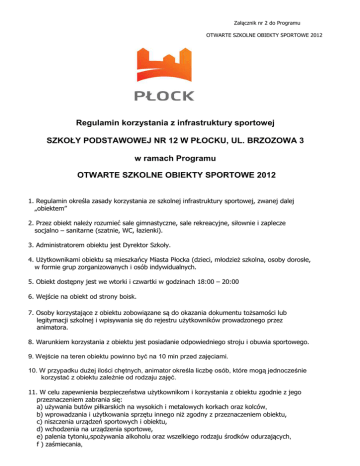 Załącznik nr 2 do Programu OTWARTE SZKOLNE OBIEKTY SPORTOWE 2012 Regulamin korzystania z infrastruktury sportowej SZKOŁY PODSTAWOWEJ NR 12 W PŁOCKU, UL. BRZOZOWA 3 w ramach Programu OTWARTE SZKOLNE OBIEKTY SPORTOWE 2012 1. Regulamin określa zasady korzystania ze szkolnej infrastruktury sportowej, zwanej dalej „obiektem” 2. Przez obiekt należy rozumieć sale gimnastyczne, sale rekreacyjne, siłownie i zaplecze socjalno – sanitarne (szatnie, WC, łazienki). 3. Administratorem obiektu jest Dyrektor Szkoły. 4. Użytkownikami obiektu są mieszkańcy Miasta Płocka (dzieci, młodzież szkolna, osoby dorosłe, w formie grup zorganizowanych i osób indywidualnych. 5. Obiekt dostępny jest we wtorki i czwartki w godzinach 18:00 – 20:00 6. Wejście na obiekt od strony boisk. 7. Osoby korzystające z obiektu zobowiązane są do okazania dokumentu tożsamości lub legitymacji szkolnej i wpisywania się do rejestru użytkowników prowadzonego przez animatora. 8. Warunkiem korzystania z obiektu jest posiadanie odpowiedniego stroju i obuwia sportowego. 9. Wejście na teren obiektu powinno być na 10 min przed zajęciami. 10. W przypadku dużej ilości chętnych, animator określa liczbę osób, które mogą jednocześnie korzystać z obiektu zależnie od rodzaju zajęć. 11. W celu zapewnienia bezpieczeństwa użytkownikom i korzystania z obiektu zgodnie z jego przeznaczeniem zabrania się: a) używania butów piłkarskich na wysokich i metalowych korkach oraz kolców, b) wprowadzania i użytkowania sprzętu innego niż zgodny z przeznaczeniem obiektu, c) niszczenia urządzeń sportowych i obiektu, d) wchodzenia na urządzenia sportowe, e) palenia tytoniu,spożywania alkoholu oraz wszelkiego rodzaju środków odurzających, f ) zaśmiecania, g) przeszkadzania w zajęciach lub grze, h) zakłócania porządku i używania słów wulgarnych, i) wprowadzania zwierząt, j) korzystania z obiektu bez zgody animatora, k) przebywania i korzystania z obiektu poza godzinami otwarcia 12. Nad prawidłowym korzystaniem z obiektu czuwa animator sportu i pracownik obsługi. 13. Osoby korzystające z obiektu mogą korzystać z pomieszczeń socjalnych w porozumieniu z animatorem lub pracownikiem obsługi. 14. Za rzeczy pozostawione w szatni administrator obiektu nie ponosi odpowiedzialności. 15. Wyposażenie i sprzęt sportowy znajdujący się na obiekcie należy użytkować zgodnie z przeznaczeniem. 16. Sprzęt sportowy wydaje animator. 17. Pobierający sprzęt po skończonych zajęciach zobowiązany jest do jego zwrotu w stanie niezniszczonym. 18. Za zniszczenia powstałe w wyniku korzystania z obiektu oraz pomieszczeń socjalno sanitarnych odpowiedzialność materialną ponoszą osoby korzystające, a w przypadku osób niepełnoletnich - ich prawni opiekunowie. 19. Korzystanie z obiektu jest bezpłatne. 20. Administrator obiektu nie ponosi odpowiedzialności za wypadki powstałe w trakcie korzystania z obiektu. 21. Użytkownicy korzystają z obiektu na własną odpowiedzialność i odpowiadają materialnie za wyrządzone szkody w 100% wartości zniszczeń. 22. Korzystający z obiektu są zobowiązani do bezwzględnego przestrzegania regulaminu, przepisów bhp i p. poż., a w szczególności zastosowania się do uwag animatora lub pracowników obiektu. 23. Administrator zastrzega sobie prawo czasowego wyłączenia obiektu z użytkowania z uwagi na organizowane imprezy lub niekorzystne warunki techniczne. Wszelkie informacje o zmianach dostępne będą na stronie internetowej szkoły – www.sp12plock.pl i w szkole. 24. Niezastosowanie się do niniejszego regulaminu rozpatrywane będzie w drodze postępowania karno - administracyjnego, a w szczególnych wypadkach w drodze postępowania karnego. TELEFONY ALARMOWE POGOTOWIE RATUNKOWE - 999 STRAŻ POŻARNA - 998 POLICJA - 997 STRAŻ MIEJSKA - 986 ALARMOWY dla tel. komórkowych - 112 Administrator: Dyrektor Szkoły Podstawowej nr 12 w Płocku. ul. Brzozowa 3, 24 364 31 90