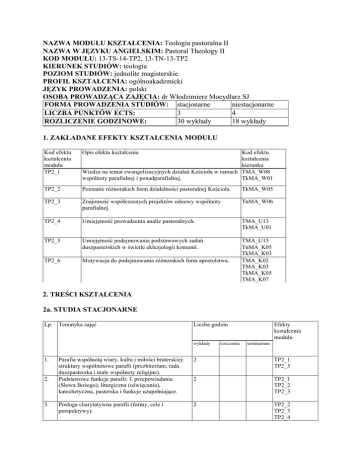 NAZWA MODUŁU KSZTAŁCENIA: Teologia pastoralna II NAZWA W JĘZYKU ANGIELSKIM: Pastoral Theology II KOD MODUŁU: 13-TS-14-TP2, 13-TN-13-TP2 KIERUNEK STUDIÓW: teologia POZIOM STUDIÓW: jednolite magisterskie PROFIL KSZTAŁCENIA: ogólnoakademicki JĘZYK PROWADZENIA: polski OSOBA PROWADZĄCA ZAJĘCIA: dr Włodzimierz Mocydlarz SJ FORMA PROWADZENIA STUDIÓW: stacjonarne niestacjonarne LICZBA PUNKTÓW ECTS: 3 4 ROZLICZENIE GODZINOWE: 30 wykłady 18 wykłady 1. ZAKŁADANE EFEKTY KSZTAŁCENIA MODUŁU Kod efektu kształcenia modułu TP2_1 Opis efektu kształcenia Kod efektu kształcenia kierunku Wiedza na temat ewangelizacyjnych działań Kościoła w ramach TMA_W08 wspólnoty parafialnej i ponadparafialnej. TkMA_W01 TP2_2 Poznanie różnorakich form działalności pastoralnej Kościoła. TkMA_W05 TP2_3 Znajomość współczesnych projektów odnowy wspólnoty parafialnej. TnMA_W06 TP2_4 Umiejętność prowadzenia analiz pastoralnych. TMA_U13 TkMA_U01 TP2_5 Umiejętność podejmowania podstawowych zadań duszpasterskich w świetle eklezjologii komunii. TP2_6 Motywacja do podejmowania różnorakich form apostolstwa. TMA_U15 TnMA_K05 TkMA_K03 TMA_K02 TMA_K03 TkMA_K05 TMA_K07 2. TREŚCI KSZTAŁCENIA 2a. STUDIA STACJONARNE Lp. Tematyka zajęć Liczba godzin wykłady 1. 2. 3. ćwiczenia Efekty kształcenia modułu seminarium Parafia wspólnotą wiary, kultu i miłości braterskiej: struktury wspólnotowe parafii (prezbiterium, rada duszpasterska i małe wspólnoty religijne). Podstawowe funkcje parafii: f. przepowiadania (Słowa Bożego), liturgiczna (uświęcania), katechetyczna, pasterska i funkcje uzupełniające. 2 TP2_1 TP2_5 2 TP2_1 TP2_2 TP2_3 Posługa charytatywna parafii (formy, cele i perspektywy). 2 TP2_2 TP2_3 TP2_4 4. Parafia – wizyta duszpasterska zwana kolędą – jej rola, znaczenie, przebieg i współczesne wskazania. 2 5. Parafia: a) Kancelaria parafialna (urzędy w parafii) – wymiar duszpasterski i praktyczny; b) współczesne propozycje odnowy duszp. w parafii: projekty i metody. Duszpasterstwo nadzwyczajne: a) duszp. bezrobotnych; b) posługa duszpasterska w więzieniu (lub areszcie śledczym). 2 7. Duszpasterstwo nadzwyczajne: a) duszpasterstwo akademickie; b) duszp. pielgrzymkowe. 2 8. Duszpasterstwo nadzwyczajne: duszp. trzeźwości. 2 9. Duszpasterstwo nadzwyczajne: duszp. narkomanów. 2 10. Duszpasterstwo nadzwyczajne: duszp. osób uwikłanych w prostytucję. 2 11. Duszpasterstwo rodzin podstawową troską i drogą Kościoła: a) Rodzina jako „Kościół domowy” podstawowa droga i podmiot urzeczywistniania się Kościoła; b) Koncepcja, zadania i struktura duszpasterstwa rodzin oraz formacja współpracowników do duszpasterstwa rodzin. Duszpasterstwo par niesakramentalnych. 2 6. 12. 13. 14. 2 2 Apostolat społeczny katolików świeckich: a) udział 2 katolików świeckich w życiu politycznym i ich zaangażowanie w rozwój życia kulturalnego; b) zaangażowanie katolików świeckich w życie społeczno-gospodarcze i budowanie dobra wspólnego; c) rola świeckich w apostolacie medialnym. Duszpasterstwo indywidualne: a) poradnictwo 2 duszpasterskie; b) posługa „Ćwiczeń duchowych” i kierownictwo duchowe. TP2_1 TP2_2 TP2_3 TP2_4 TP2_1 TP2_2 TP2_3 TP2_4 TP2_1 TP2_2 TP2_3 TP2_4 TP2_5 TP2_6 TP2_1 TP2_2 TP2_3 TP2_4 TP2_5 TP2_6 TP2_1 TP2_2 TP2_3 TP2_4 TP2_5 TP2_6 TP2_1 TP2_2 TP2_3 TP2_4 TP2_5 TP2_6 TP2_1 TP2_2 TP2_3 TP2_4 TP2_5 TP2_6 TP2_1 TP2_2 TP2_3 TP2_4 TP2_5 TP2_6 TP2_1 TP2_2 TP2_3 TP2_4 TP2_5 TP2_6 TP2_1 TP2_2 TP2_3 TP2_4 TP2_5 TP2_6 TP2_1 TP2_2 TP2_3 TP2_4 15. Tematy uzupełniające i podsumowanie problematyki II semestru zajęć TP. TP2_5 TP2_6 TP2_1 TP2_2 TP2_3 TP2_4 TP2_5 TP2_6 2 2b. STUDIA NIESTACJONARNE Lp. Tematyka zajęć Liczba godzin wykłady 1. 2. 3. 4. 5. (I) Urzeczywistnianie się Kościoła dzisiaj: 1. w diecezji i parafii; 2. Zrzeszenia religijne miejscem urzeczywistniania się Kościoła: a. Określenie ruchów, stowarzyszeń, grup i wspólnot religijnych; b. Uczestnictwo chrześcijan w zrzeszeniach religijnych; c. Kryteria eklezjalności zrzeszeń religijnych; d. Niebezpieczeństwa grożące zrzeszeniom religijnym. (II) Urzeczywistnianie się Kościoła dzisiaj: 3. Rodzina Kościołem domowym: realizacja jej funkcji nauczycielskiej, kapłańskiej i pasterskiej; 4. Zasada pomocniczości w życiu Kościoła: a. Ogólna ważność zasady pomocniczości; b. Kościół jako widzialna wspólnota Ludu Bożego; c. Struktury pośrednie w Kościele; d. Kościół a opinia publiczna; e. Kościół a świat. (III) Urzeczywistnianie się Kościoła dzisiaj: 1. Rola dialogu w życiu Kościoła: a. Pojęcie dialogu, jego rodzaje i uwarunkowania; b. Cywilizacyjne i teologiczne impulsy dialogu kościelnego; c. Dialog Kościoła - dialogiem zbawienia; d. Dialog zbawienia w Kościele; e. Dialog apostolski Kościoła; f. Trudności i przeszkody na drodze dialogu zbawienia; 2. Środki społecznego przekazu w duszpasterstwie: a. Schemat komunikacji społecznej; b. Środki komunikacji społecznej, c. Dokumenty Kościoła dotyczące środków komunikacji społecznej; d. Funkcje środków społecznego przekazu w działalności duszpasterskiej Kościoła; e. Wybrane decyzje szczegółowe Kościoła. Znaki czasu i ich rozpoznawanie: 1. Znaczenie biblijnego wyrażenia "znaki czasów"; 2. Znaki czasu w nauczaniu Kościoła współczesnego: a. Znaki czasu wg Jana XXIII; b. Idea znaków czasów w dokumentach Soboru Watykańskiego II; c. Znaki czasu w nauczaniu Pawła VI; d. Jan Paweł II interpretatorem znaków czasu; 3. Charakterystyka znaków czasu; 4. Rozpoznawanie znaków czasu. Stosunek Kościoła do świata: 1. Inkulturacja Kościoła: Pojęcie, przedmiot, zasady i dziedziny zastosowania inkulturacji; 2. Uniwersalne i narodowe korzenie Kościoła; 3. Zasady partycypacji Kościoła w rozwoju świata; 4. Zagrożenia wiary i religijności płynące ze strony świata: a. Kontestacja. ćwiczenia Efekty kształcenia modułu seminarium 2 TP2_1 TP2_2 TP2_3 2 TP2_1 TP2_2 TP2_3