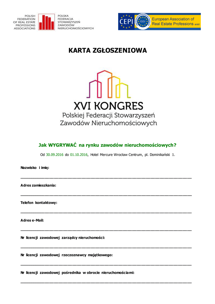 KARTA ZGŁOSZENIOWA Jak WYGRYWAĆ na rynku zawodów nieruchomościowych? Od 30.09.2016 do 01.10.2016, Hotel Mercure Wrocław Centrum, pl. Dominikański 1. Nazwisko i imię: ___________________________________________________________________________ Adres zamieszkania: ___________________________________________________________________________ Telefon kontaktowy: ___________________________________________________________________________ Adres e-Mail: ___________________________________________________________________________ Nr licencji zawodowej zarządcy nieruchomości: ___________________________________________________________________________ Nr licencji zawodowej rzeczoznawcy majątkowego: ___________________________________________________________________________ Nr licencji zawodowej pośrednika w obrocie nieruchomościami: ___________________________________________________________________________ Dane do wystawienia faktury Nazwa firmy ___________________________________________________________________________ Adres ___________________________________________________________________________ NIP ___________________________________________________________________________ Za uczestnictwo w XVI Kongresie PFSZN zobowiązuję się do dokonania wpłaty kwoty (zaznaczyć odpowiednie) do dnia 10 września b.r. • - 444,00 zł./os. - członkowie Stowarzyszeń zrzeszonych w PFSZN • - 494,00 zł./os. - pozostali uczestnicy • - 255,00 zł./os. - uczestnictwo jedynie w bankiecie Na podane niżej konto bankowe: Dolnośląskie Stowarzyszenie Zarządców Nieruchomości, ul. Piłsudskiego 74, 50-020 Wrocław. KONTO BANKOWE NR: 93 1090 2398 0000 0006 0802 8343 - w tytule przelewu uprzejmie proszę podać imię oraz nazwisko uczestnika. Zgłoszenia przyjmujemy do dnia 10.09.2016r. Więcej informacji o XVI Kongresie PFSZN na stronie: kongres.dszn.org Wyrażam zgodę na wykorzystanie i przetwarzanie moich danych osobowych do celów marketingowych (zgodnie z ustawą z dnia 29.08.1997 r. o ochronie danych osobowych Dz. U. Nr 133, poz. 883, z późn. zm.) W przypadku rezygnacji z uczestnictwa w XVI Kongresie PFSZN, bezzwłocznie telefonicznie, mailem lub faksem zawiadomię o tym fakcie Dolnośląskie Stowarzyszenie Zarządców Nieruchomości. W przypadku nie powiadomienia o rezygnacji z uczestnictwa w terminie do dn. 12.09.2016r. uczestnik zobowiązany do pokrycia kosztów w całości. Karta zgłoszeniowa bez podpisu uczestnika jest kartą nieważną. ................................................................................ data i podpis uczestnika Wypełnioną kartę zgłoszeniową należy odesłać e-mail [email protected] lub faxem 71/ 361-97-13 Dla uczestników XVI Kongresu pfszn zostały wynegocjowane specjalne rabaty od obowiązującej w danym dniu cen na usługi noclegowe w przypadku dostępności pokoi typu standard. Uczestnicy Kongresu chcący skorzystać z rabatowych cen w celu dokonania rezerwacji powinni skontaktować się z nw. Hotelami do dnia 28 września 2016r. i powołać się na hasło : „XVI Kongres PFSZN Wrocław 2016r.” Hotel Mercure Wrocław Centrum, pl. Dominikańs ki 1, tel.: +48 71/32-32-742 lub e-mail: [email protected] / Hotel Mercure Wrocław Centrum udziela 15 % rabatu Hotel Ibis Wrocław Centrum, ul. Powstańców Śl. 7A, tel.: + 48 71/722-49-50 lub e-mail: [email protected] / Hotel Ibis Wrocław Centrum udziela 10 % rabatu Goście będący członkami LeClub Accor Hotels otrzymają 10 % rabatu w Hotelu Ibis Styles Wrocław, pl. Konstytucji 3 Maja 3, tel.: +48 71/ 733- 48- 00, dokonując rezerwacji bez podawania ww. hasła na stronie www.accorhotels.com