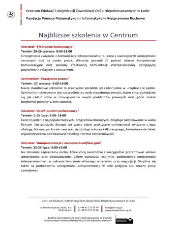 Najbliższe szkolenia w Centrum Warsztat "Efektywna komunikacja" Termin: 25-26 czerwca- 9:00-15:00 Umiejętności związane z komunikacją interpersonalną to jedne z ważniejszych umiejętności cenionych dziś na rynku pracy. Warsztat pozwoli Ci poznać własne kompetencje komunikacyjne oraz sposoby efektywnej komunikacji interpersonalnej, sprzyjającej pozytywnym relacjom z otoczeniem. Seminarium "Praktyczne prawo" Termin: 27 czerwca- 9:00-14:00 Nasze dwudniowe szkolenie to praktyczny poradnik jak radzić sobie w urzędzie i w sądzie. Seminarium skierowane jest szczególnie do osób niepełnosprawnych, które chcą dowiedzieć się jak radzić sobie w rozwiązywaniu swych problemów prawnych oraz gdzie szukać bezpłatnej pomocy w tym zakresie. Szkolenie "Excel- poziom podstawowy" Termin: 1-15 lipca- 9:00- 14:00 Excel to jeden z najpopularniejszych programów biurowych. Znajduje zastosowanie w wielu firmach i instytucjach, dlatego też warto nabyć praktyczne umiejętności związane z jego obsługą. Na naszym kursie nauczysz się obsługi arkusza kalkulacyjnego, formatowania tabel, wykorzystywania podstawowych funkcji i formuł obliczeniowych. Warsztat "Autoprezentacja i rozmowa kwalifikacyjna" Termin: 22-23 lipca- 9:00-15:00 Na szkolenie zapraszamy osoby, które chcą swobodnie i wiarygodnie prezentować własne umiejętności oraz doświadczenie. Celem warsztatu jest m.in. podniesienie umiejętności interpersonalnych w zakresie tworzenia własnego wizerunku oraz negocjacji. Skupimy się także na podniesieniu umiejętności autoprezentacji w celu podjęcia lub zmiany pracy zawodowej. Siedziba Główna; ul. Wiśniowa 40b lok.8; 02-520 Warszawa; telefon: 22 697 87 84; fax: 22 697; e-mail: [email protected]; www.aktywizacja.org.pl; KRS: 0000049694; NIP: 527-13-11-973; REGON: 006229672