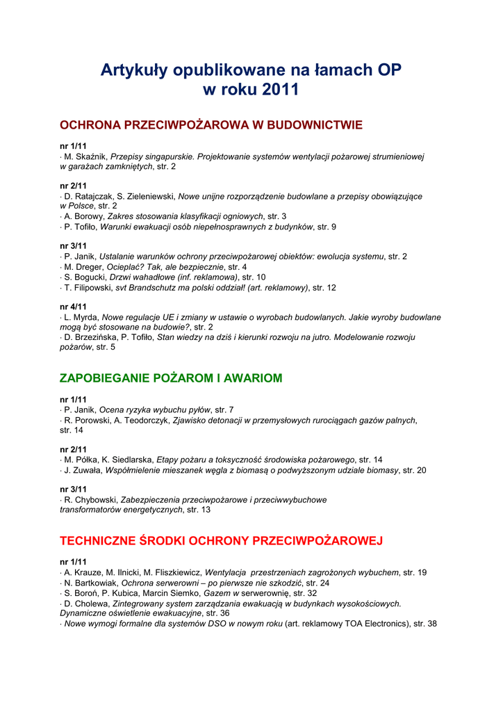 Artykuły opublikowane na łamach OP w roku 2011 OCHRONA PRZECIWPOŻAROWA W BUDOWNICTWIE nr 1/11 ⋅ M. Skaźnik, Przepisy singapurskie. Projektowanie systemów wentylacji pożarowej strumieniowej w garażach zamkniętych, str. 2 nr 2/11 ⋅ D. Ratajczak, S. Zieleniewski, Nowe unijne rozporządzenie budowlane a przepisy obowiązujące w Polsce, str. 2 ⋅ A. Borowy, Zakres stosowania klasyfikacji ogniowych, str. 3 ⋅ P. Tofiło, Warunki ewakuacji osób niepełnosprawnych z budynków, str. 9 nr 3/11 ⋅ P. Janik, Ustalanie warunków ochrony przeciwpożarowej obiektów: ewolucja systemu, str. 2 ⋅ M. Dreger, Ocieplać? Tak, ale bezpiecznie, str. 4 ⋅ S. Bogucki, Drzwi wahadłowe (inf. reklamowa), str. 10 ⋅ T. Filipowski, svt Brandschutz ma polski oddział! (art. reklamowy), str. 12 nr 4/11 ⋅ L. Myrda, Nowe regulacje UE i zmiany w ustawie o wyrobach budowlanych. Jakie wyroby budowlane mogą być stosowane na budowie?, str. 2 ⋅ D. Brzezińska, P. Tofiło, Stan wiedzy na dziś i kierunki rozwoju na jutro. Modelowanie rozwoju pożarów, str. 5 ZAPOBIEGANIE POŻAROM I AWARIOM nr 1/11 ⋅ P. Janik, Ocena ryzyka wybuchu pyłów, str. 7 ⋅ R. Porowski, A. Teodorczyk, Zjawisko detonacji w przemysłowych rurociągach gazów palnych, str. 14 nr 2/11 ⋅ M. Półka, K. Siedlarska, Etapy pożaru a toksyczność środowiska pożarowego, str. 14 ⋅ J. Zuwała, Współmielenie mieszanek węgla z biomasą o podwyższonym udziale biomasy, str. 20 nr 3/11 ⋅ R. Chybowski, Zabezpieczenia przeciwpożarowe i przeciwwybuchowe transformatorów energetycznych, str. 13 TECHNICZNE ŚRODKI OCHRONY PRZECIWPOŻAROWEJ nr 1/11 ⋅ A. Krauze, M. Ilnicki, M. Fliszkiewicz, Wentylacja przestrzeniach zagrożonych wybuchem, str. 19 ⋅ N. Bartkowiak, Ochrona serwerowni – po pierwsze nie szkodzić, str. 24 ⋅ S. Boroń, P. Kubica, Marcin Siemko, Gazem w serwerownię, str. 32 ⋅ D. Cholewa, Zintegrowany system zarządzania ewakuacją w budynkach wysokościowych. Dynamiczne oświetlenie ewakuacyjne, str. 36 ⋅ Nowe wymogi formalne dla systemów DSO w nowym roku (art. reklamowy TOA Electronics), str. 38 nr 2/11 ⋅ M. Skaźnik, Obiekty produkcyjne i magazynowe. Samoczynne urządzenia oddymiające a brak samoczynnych urządzeń gaśniczych wodnych, str. 25 ⋅ W. Markowski, Nowy standard SITP. Systemy sygnalizacji pożarowej – wytyczne projektowania, str. 32 ⋅ D. Damps, Adresowalne głośniki – rewolucja w systemach DSO (art. reklamowy), str. 36 ⋅ W. Ciemiński, M. Borkowski, Nawadnianie suchych pionów (art. reklamowy), str. 38 nr 3/11 ⋅ M. Sawczuk, Platformy parkingowe i ochrona urządzeniem tryskaczowym – problem czy nie?, str. 16 ⋅ P. Kubica, R. Krupa, Odciążenie w pomieszczeniach chronionych SUG gazowymi, str. 21 ⋅ J. Świetnicki, Stałe urządzenia gaśnicze pianowe: projektowanie, instalacja i dozowanie środków pianotwórczych, str. 26 ⋅ W. Łącki, D. Brzezińska, Próby odbiorowe wentylacji strumieniowej z gorącym dymem (artykuł reklamowy), str. 36 ⋅ M. Chmieliński, Nowy japoński dźwiękowy system ostrzegawczy na rynku polskim (artykuł reklamowy), str. 37 nr 4/11 ⋅ M. Skaźnik, Urządzenia do usuwania dymu z przestrzeni klatek schodowych, str. 15 ⋅ M. Ilnicki, M. Fliszkiewicz, A. Krauze, Analizy skuteczności systemów oddymiania w symulacji CFD – wybrane problemy, str. 22 ⋅ S. Bogucki, Przejścia transportowe (art. reklamowy), str. 28 INFORMACJA NAUKOWO-TECHNICZNA nr 1/11 ⋅ P. Królikowski, Aktualności prawne, nowe normy i standardy, str. 40 nr 2/11 ⋅ P. Królikowski, Aktualności prawne, nowe normy i standardy, str. 40 ⋅ Ogólnopolskie Stowarzyszenie Producentów Zabezpieczeń Przeciwpożarowych i Sprzętu ratowniczego: to już 15 lat!, str. 44 ⋅ Certyfikaty wydane przez Ośrodek Certyfikacji Usług Przeciwpożarowych w Poznaniu, str. 48 nr 3/11 ⋅ P. Królikowski, Aktualności prawne, nowe normy i standardy, str. 40 ⋅ L. Myrda, Certyfikacja firm usługowych zyska własną normę europejską EN!, str. 42 ⋅ J.W. Sobstel, Komitet Techniczny CEN/TC72 obraduje w Polsce!, str. 44 nr 4/11 ⋅ P. Królikowski, Aktualności prawne, nowe normy i standardy, str. 30 ⋅ StaMa, Oddział Małopolski SITP nie zwalnia tempa. Ochrona przeciwpożarowa w budownictwie, str. 31 ⋅ St. Mazur, W trosce o bezpieczeństwo dóbr kultury, str. 33 ⋅ P. Smardz, Forum dyskusyjne IAFSS, str. 36 ⋅ St. Mazur, Sukces na przekór trudnościom. Rozmowa z Józefem Sewerynem, prezesem zarządu rodzinnej spółki SUPO Cerber, str. 37 DZIAŁANIA RATOWNICZE nr 4/11 ⋅ P. Spodniewski, P. Tuzimek, Najtwardszy z najtwardszych: zawody w ogniu Pyromagic, str. 41 OCHRONA PRZECIWPOŻAROWA ZA GRANICĄ nr 1/11 ⋅ T. Kaspruś, T. Karolak, Ewakuacja z obiektów sportowo-widowiskowych w Wielkiej Brytanii, str. 42 ⋅ W. Jaskółowski, M. Fijołek, P. Gromek, Przegląd prasy. Ewakuacja ludzi w sytuacjach zagrożenia, str. 48 nr 2/11 ⋅ W. Jaskółowski, M. Fijołek, P. Gromek, Przegląd prasy zagranicznej, str. 50 nr 3/11 ⋅ W. Jaskółowski, M. Fijołek, P. Gromek, Przegląd prasy zagranicznej, str. 45 nr 4/11 ⋅ W. Jaskółowski, M. Fijołek, P. Gromek, Przegląd prasy zagranicznej, str. 42 AKTUALNOŚCI SITP nr 1/11 ⋅ StaMa, Piąta konferencja OCUP. Zagrożenia wybuchowe stwarzane przez pyły, str. 50 nr 2/11 ⋅ StaMa, Międzynarodowe seminarium dla rzeczoznawców: Ochrona Przeciwpożarowa – Zakopane, wiosna 2011, str. 52 ⋅ W. Jaskółowski, Międzynarodowa konferencja projektu BeSeCu w SGSP. Raz jeszcze o ewakuacji z budynków, str. 53 nr 3/11 ⋅ DK, W Katowicach: tradycyjna majowa konferencja. Zarządzanie bezpieczeństwem pożarowym budynków po nowelizacji przepisów, str. 48 ⋅ K. Dąbrowski, W Warszawie: II warsztaty szkoleniowe „Projektowanie wentylacji pożarowej”. Tego jeszcze nie było!, str. 49 nr 4/11 ⋅ St. Mazur, To były owocne lata. Rozmowa z prezesem SITP Bronisławem Skaźnikiem, str. 46 ⋅ Z. Kiedio, SITP w przededniu VII Zebrania Delegatów Oddziałów, str. 