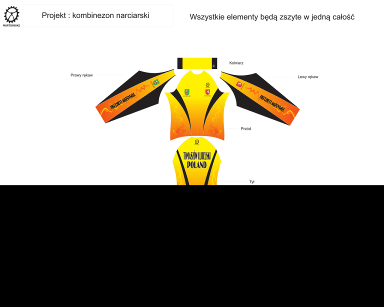 Projekt : kombinezon narciarski Wszystkie elementy bêd¹ zszyte w jedn¹ ca³oœæ Ko³nierz Prawy rêkaw Lewy rêkaw Przód Ty³ Nogawka lewa Nogawka prawa Ty³