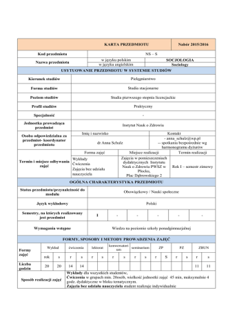 KARTA PRZEDMIOTU Nabór 2015/2016 NS – S Kod przedmiotu w języku polskim w języku angielskim Nazwa przedmiotu SOCJOLOGIA Sociology USYTUOWANIE PRZEDMIOTU W SYSTEMIE STUDIÓW Kierunek studiów Pielęgniarstwo Forma studiów Studia stacjonarne Poziom studiów Studia pierwszego stopnia licencjackie Profil studiów Praktyczny Specjalność - Jednostka prowadząca przedmiot Instytut Nauk o Zdrowiu Imię i nazwisko Kontakt - [email protected] dr Anna Schulz -- spotkania bezpośrednie wg harmonogramu dyżurów Forma zajęć Miejsce realizacji Termin realizacji Zajęcia w pomieszczeniach Wykłady Termin i miejsce odbywania dydaktycznych Instytutu Ćwiczenia zajęć Nauk o Zdrowiu PWSZ w Rok I – semestr zimowy Zajęcia bez udziału Płocku, nauczyciela Plac Dąbrowskiego 2 Osoba odpowiedzialna za przedmiot- koordynator przedmiotu OGÓLNA CHARAKTERYSTYKA PRZEDMIOTU Status przedmiotu/przynależność do modułu Obowiązkowy / Nauki społeczne Język wykładowy Polski Semestry, na których realizowany jest przedmiot - I - - - - Wiedza na poziomie szkoły ponadgimnazjalnej Wymagania wstępne FORMY, SPOSOBY I METODY PROWADZENIA ZAJĘĆ Formy zajęć Liczba godzin Wykład ćwiczenia rok s r s 20 20 14 14 Sposób realizacji zajęć lektorat r s konwersatori seminarium um r s r s ZP r PZ S r ZBUN s r s 11 11 Wykłady dla wszystkich studentów, Ćwiczenia w grupach min. 20osób, wielkość jednostki zajęć 45 min, maksymalnie 4 godz. dydaktyczne w bloku tematycznym. Zajęcia bez udziału nauczyciela student realizuje indywidualnie Zaliczenie z oceną po I semestrze obecność na zajęciach i aktywny udział w ćwiczeniach. prezentacja pracy multimedialnej na określony temat, zgodnie z programem nauczania przedmiotu. zaliczenie pracy multimedialnej zleconej przez nauczyciela prowadzącego ćwiczenia zgodnie z programem ZBUN. ocena podsumowująca po zakończeniu wykonanej pracy przez studenta, nie później niż przed zaliczeniem końcowym. Sposób zaliczenia zajęć Zarówno wykład jak i ćwiczenia kończą się zaliczeniem z oceną. Weryfikacja efektów kształcenia dokonana zostanie na podstawie kolokwiów pisemnych (testy z przedziałami punktowymi) z zakresu omawianej problematyki (odrębny test z ćwiczeń i wykładów). W przypadku ćwiczeń – ocena z testu stanowić będzie 75% uzyskanej oceny – pozostałą część stanowić będzie ocena pracy studenta podczas zajęć (25%) – w szczególności aktywny udział w dyskusjach i pracach w grupach, posługiwanie się poznanymi terminami, umiejętność stosowania ich w analizie zjawisk społecznych, umiejętność argumentowania oraz rozpatrywania poruszanych podczas zajęć kwestii z różnych punktów widzenia Treści realizowane w ramach samokształcenia (ZBUN) zweryfikowane będą poprzez zaliczenie pracy pisemnej polegającej na zaprojektowaniu badań socjologicznych z zakresu szeroko rozumianej problematyki zdrowia i choroby i przedstawieniu propozycji wykorzystania ich wyników w sytuacjach związanych z pracą pielęgniarki. Praca kwalifikowana jest zaliczeniem bez oceny. Na ocenę końcową z przedmiotu składa się ocena z ćwiczeń (50%) i z zaliczenia z oceną (50%). Warunkiem zaliczenia przedmiotu są pozytywne oceny z ćwiczeń i zaliczenia przedmiotu oraz pozytywne zaliczenie samokształcenia (ZBUN) Metody dydaktyczne Przedmioty powiązane/moduł Podstawowa Wykaz literatury Wykłady: Wykład informacyjny, Wykład problemowy, Ćwiczenia: Dyskusja dydaktyczna, Pogadanka, Studium przypadku. Zajęcia bez udziału nauczyciela: Studiowanie literatury, Prezentacja multimedialna, Dyskusja dydaktyczna. Psychologia, Pedagogika 1. Majchrowska A. (red.), Wybrane elementy socjologii, Wyd.Czelej, Lublin 2003 2. Szacka B., Wprowadzenie do socjologii, Oficyna Naukowa, Warszawa 2013 3. Tobiasz-Adamczyk B., Wybrane elementy socjologii zdrowia i choroby, Wydawnictwo Uniwersytetu Jagiellońskiego, Kraków 2000 1. Uzupełni ająca Błuszkowski J., Paradoksy normalności i dewiacji, w: Paradoksy polityki, pod. red. M. Karwat, Warszawa 2005. 2. Pospiszyl I., Patologie społeczne, Warszawa 2008 3. Taranowicz I., Majchrowska A., Kawczyńska –Butrym Z.(red.), Elementy socjologii dla pielęgniarek, Wyd. Czelej, Lublin 2000 CELE, TREŚCI I EFEKTY KSZTAŁCENIA Cele przedmiotu (ogólne, szczegółowe) Student: pozna terminologię i przedmiot zainteresowań socjologii ogólnej, podstawowe teorie socjologiczne i metody modelowania zachowań oraz obszary i teorie interakcji społecznych, wyłoni obszary odrębności kulturowych , wyjaśni proces socjalizacji jego uwarunkowania, zinterpretuje wybrane nierówności społeczne i zjawisko dyskryminacji oraz scharakteryzuje patologie dzieci i młodzieży, sposoby ich zwalczania i profilaktyki. Student : C1 rozumie podstawowe pojęcia socjologii ogólnej, C2 wyjaśnia przydatność teorii socjologicznych w analizie problemów społecznych, C3 dostrzega i diagnozuje zjawiska społeczne, w tym patologię społeczną wśród dzieci i młodzieży, C4 rozróżnia pojęcia – grupy, zbiorowości społeczne i populacji, C5 dostrzega i różnicuje zachowania prawidłowe od zaburzonych i patologicznych, C6 inicjuje i koordynuje działania mające na celu zwalczanie i zapobieganie patologii wśród dzieci i młodzieży. Treści programowe a efekty kształcenia Efekty kształcenia (kody) Suma liczby godzin Liczba godzin Temat Forma zajęć kierunkowe przedmiotowe K_B.W9. NS – S_W01 K_B.W10. NS – S_W02 W CW. W K_B.W11. NS – S_W03 W W 3 +W4 W W4 8 8 CW.3 2 2 2+2 4 2 2 8+1 9 K_B.W12. NS – S_W04 W 2 + ĆW. 1 2+1 3 W 1 – W2 2+2 4 10 2+8 K_B.U15. NS – S_U01 CW. K_B.U16. NS – S_U02 W W 5. + ĆW. 4 K_B.W13 NS – S_W05 W W 6. K_B.W15. NS – S_W07 W W4+CW.2 K_D.K2. NS – S_K01 W CW ZBUN K_D.K10. NS – S_K02 CW ZBUN K_B.W9K_B.W15 K_B.U.15 K_B.U.16 K_D.K2 K_D.K10 K_D.K2. od NS – S_W01 do NS – W5+W 7. 2+2 CW.1+CW.4+CW. 1+2+2+2 6+CW7 11 ZBUN 1 CW.5 2 ZBUN 1 11 22 13 S_W07 od NS – S_U01 do NS – S_U02 NS – S