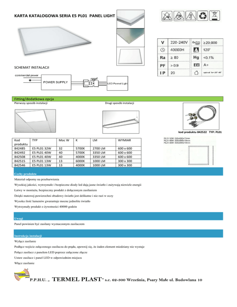 KARTA KATALOGOWA SERIA E5 PL01 PANEL LIGHT SCHEMAT INSTALACJI Fitting/dodatkowa opcja Pierwszy sposób instalacji Drugi sposób instalacji kod produktu 842522 TYP: PL01 Kod produktu 842485 842492 842508 842515 842546 TYP Moc W K LM WYMIAR E5 PL01 32W E5 PL01 40W E5 PL01 40W E5 PL01 13W E5 PL01 13W 32 40 40 13 13 5700K 5700K 4000K 6000K 4000K 2700 LM 3350 LM 3350 LM 1000 LM 1000 LM 600 x 600 600 x 600 600 x 600 300 x 300 300 x 300 Cechy produktu Materiał odporny na przebarwienia Wysokiej jakości, wytrzymałe i bezpieczne diody led dają jasne światło i zużywają niewiele energii Łatwy w montażu, bezpieczny produkt z dołączonym zasilaniem Dzięki matowej powierzchni obudowy światło jest delikatne i nie razi w oczy Wysoka ilość lumenów gwarantuje mocne jednolite światło Wytrzymały produkt o żywotności 40000 godzin Uwagi Panel powinien być zasilany wyznaczonym zasilaczem Instrukcja instalacji Wyłącz zasilanie Podłącz wejście załączonego zasilacza do prądu, upewnij się, że żaden element miedziany nie wystaje Połącz zasilacz z panelem LED poprzez załączone złącze Ustaw zasilacz i panel LED w odpowiednim miejscu Włącz zasilanie P.P.H.U. „ TERMEL PLAST” s.c. 62-300 Września, Psary Małe ul. Budowlana 10