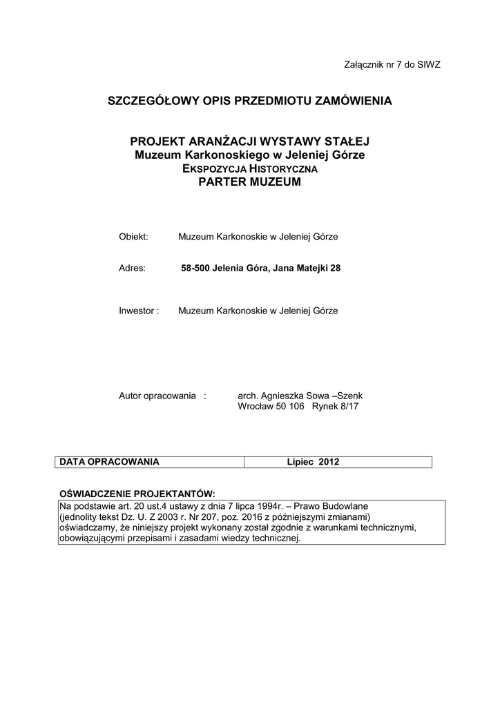 Załącznik nr 7 do SIWZ SZCZEGÓŁOWY OPIS PRZEDMIOTU ZAMÓWIENIA PROJEKT ARANŻACJI WYSTAWY STAŁEJ Muzeum Karkonoskiego w Jeleniej Górze EKSPOZYCJA HISTORYCZNA PARTER MUZEUM Obiekt: Muzeum Karkonoskie w Jeleniej Górze Adres: 58-500 Jelenia Góra, Jana Matejki 28 Inwestor : Muzeum Karkonoskie w Jeleniej Górze Autor opracowania : DATA OPRACOWANIA arch. Agnieszka Sowa –Szenk Wrocław 50 106 Rynek 8/17 Lipiec 2012 OŚWIADCZENIE PROJEKTANTÓW: Na podstawie art. 20 ust.4 ustawy z dnia 7 lipca 1994r. – Prawo Budowlane (jednolity tekst Dz. U. Z 2003 r. Nr 207, poz. 2016 z późniejszymi zmianami) oświadczamy, że niniejszy projekt wykonany został zgodnie z warunkami technicznymi, obowiązującymi przepisami i zasadami wiedzy technicznej. SPIS ZAWARTOŚCI PROJEKTU Strona tytułowa Spis zawartości projektu Nr str. 1 2 A. CZĘŚĆ OPISOWA 1. Przeznaczenie i program użytkowy 2. Forma architektoniczna i funkcja 3. Rozwiązania materiałowe 4. Specyfikacja techniczna urządzeń B. KOSZTORYS SZACUNKOWY 3 3 4 9 13 C. CZĘŚĆ GRAFICZNA: Rys Nr Nazwa Skala 1 Parter, Układ zabudowy ekspozycyjnej 1:100 2 Parter , GABLOTA 01 1:50 3 Parter , GABLOTA 02 1:25 4 Parter , GABLOTA 03 1:25 5 Parter , GABLOTA 04 1:25 6 Parter , GABLOTA 05 1:25 7 Parter , GABLOTA 06 1:25 8 Parter , GABLOTA 07 1:25 9 Parter , GABLOTA 08 10 Parter , GABLOTA 09 1:25 11 Parter , GABLOTA 10 1:25 12 Parter , GABLOTA 11 1:25 13 Parter, GABLOTA 12 1:25 14 Parter, GABLOTA 13 1:100 15 Parter , GABLOTA 15 1:25 16 Parter , GABLOTA 16 1:25 17 Parter , GABLOTA 17 1:25 18 Parter , POSTUMENT 19 1:25 1. DANE OGÓLNE 1.1 OBIEKT: Sala wystawowa na parterze Muzeum 1.2 Powierzchnia opracowania około 350 m2 2. ZAKRES I PODSTAWA OPRACOWANIA Zakresem opracowania jest: Projekt aranżacji stałej wystawy historycznej - Muzeum Karkonoskiego w Jeleniej Górze. Podstawami opracowania są: - Scenariusz merytoryczny Projekt koncepcji wystawy A. CZĘŚĆ OPISOWA: 1. PRZEZNACZENIE I PROGRAM UZYTKOWY Zakres wystawy obejmuje ekspozycję historyczną Muzeum Karkonoskiego. Przestrzeń ekspozycyjna dostępna jest z klatki schodowej łączącej ją z pozostałymi poziomami muzeum jak i bezpośrednio z holu głównego. Zakłada się iż wejście główne na wystawę stanowi strefa wejściowa Muzeum, co zapewni bezkolizyjny dostęp zwiedzającym z dysfunkcją ruchu. Opierając się na wytycznych Inwestora zaplanowano przeznaczenie sal parteru na cele ekspozycyjne dostosowane do organizacji wystawy stałej. Wystawa posiadać będzie elementy o charakterze multimedialnym – jako system infomatów zaaranżowanych na ekspozycji. Ścieżka zwiedzania wyznacza tematyczny układ ekspozycji , oparty na opracowaniach działów historycznych , archeologicznego ,sztuki i etnograficznego . 2. FORMA ARCHITEKTONICZNA I FUNKCJA Aranżacja wystaw wykorzystuje architektoniczny układ przestrzeni sal. Ściany i sufity wykończone będą w tonacji jasnej. Eksponaty zabytkowe eksponowane będą w zróżnicowanych gabarytowo i funkcjonalnie – przestrzennych gablotach, wyposażonych w system dostosowany do eksponowania rzemiosła, dokumentów, tkanin i mebli. Wybrane typy gablot posiadają odpowiednie oświetlenie górne(reflektorki LED z regulacją kąta świecenia), natomiast ekspozycje rzemiosła eksponowane na podestach gablot zostaną doświetlone, dodatkowo światłem ze źródeł zewnętrznych znajdujących się na szynoprzewodach. Informacja wizualna zostanie opracowana jako prezentacja multimedialna i w formie graficznej w postaci drukowanych graficznych kolaży. Dzieci stanowią specyficzną grupę odbiorców , dla nich dostosowana zostanie treść merytoryczna jednego z sześciu typów infomatu wprowadzająca najmłodszych odbiorców w tematy eksponowane na wystawie. Zwiedzający z zagranicy posłużą się informatorami z tekstami tłumaczonymi na trzy języki. informatory znajdować się będą w kieszeniach zintegrowanych z zabudowa ekspozycyjną. 3. ROZWIĄZANIA MATERIAŁOWE. Sprzęt ekspozycyjny Lp. Przedmiot 1 GABLOTA 01 Ekspozycja Historii Najnowszej SZTUK 2 Wymagane warunki Konstrukcja wykonana z płyty MDF ognioodpornej w Euroklasie B-s2, pomalowanej jednostronnie farbą akrylową ścienną do wnętrz w kolorze wskazanym przez Zamawiającego. Proponowany jest kolor złamany –szary lub biały – po wykonaniu trzech próbek wskazanych przez projektanta, Zleceniodawca wybierze ostatecznie intensywność koloru. Powierzchnia panelu tylnego dostosowana do projekcji prezentacji – malowana farbą białą stosowaną jako powierzchnia ekranów o dużym współczynniku odbicia (odpowiednik ekranów białych matt white). Postument podstawy wypoziomowany poprzez stopki regulowane -zasłonięte cokołem. Krawędzie boczne łączone pod kątem 45 stopni. Panel tylni wyposażony w system do zawieszania obrazów – składający się z linek uchwytów mocujących i elementów do zawieszania obrazów. Listwy służą do zawieszania obrazów na linkach. Listwy są montowane do ściany za pomocą kołków rozporowych. W przypadku montażu listew na ścianie z cegły pełnej, klasy 100, dopuszczalne obciążenie listwy wynosi 40kg/mb, przy założeniu montażu za pomocą kołków rozporowych 10x100/30 lub kołków równoważnych. Handlowe długości listew wynoszą 2 i 2,5mb. W przypadku montażu listew o łącznej długości powyżej 2,5mb wskazane jest zastosowanie łącznika, który pozwala na dokładne dopasowanie osi łączonych listew. W przypadku podwieszania obrazów, gdy na jeden hak przypada większe obciążenie niż 5 kg, należy zastosować element mocowany pod hakiem pozwalający do zwiększenia obciążenia na jeden hak do 15 kg. 2 GABLOTA 02 W skład systemu wchodzi listwa do zawieszania obrazów mocowana wzdłuż górnej krawędzi płyty oraz osiem zestawów linkowych składających się z elementów : mocowanie linki do szyny linka stalowa o grubości 2 mm o długości 2,5 mb 4 haki do zawieszania obrazów. 8 elementów do zawieszania antyram w uchwytac
