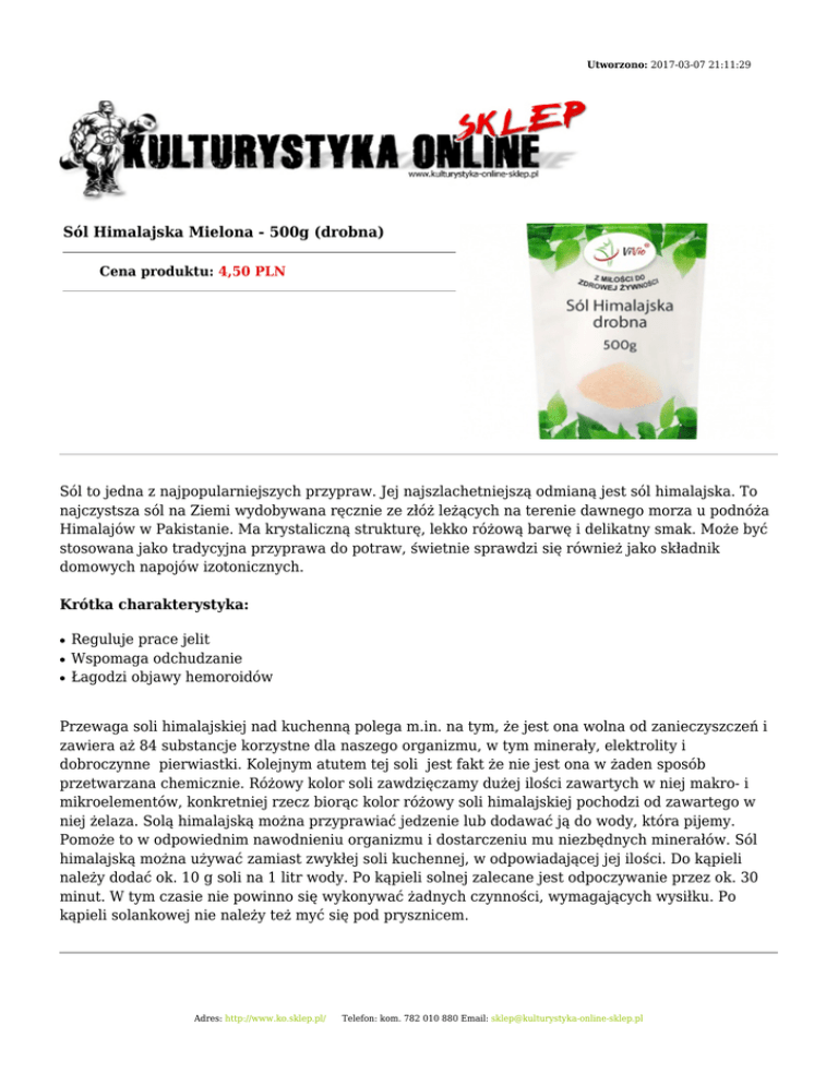 Utworzono: 2017-03-07 21:11:29 Sól Himalajska Mielona - 500g (drobna) Cena produktu: 4,50 PLN Sól to jedna z najpopularniejszych przypraw. Jej najszlachetniejszą odmianą jest sól himalajska. To najczystsza sól na Ziemi wydobywana ręcznie ze złóż leżących na terenie dawnego morza u podnóża Himalajów w Pakistanie. Ma krystaliczną strukturę, lekko różową barwę i delikatny smak. Może być stosowana jako tradycyjna przyprawa do potraw, świetnie sprawdzi się również jako składnik domowych napojów izotonicznych. Krótka charakterystyka: ● ● ● Reguluje prace jelit Wspomaga odchudzanie Łagodzi objawy hemoroidów Przewaga soli himalajskiej nad kuchenną polega m.in. na tym, że jest ona wolna od zanieczyszczeń i zawiera aż 84 substancje korzystne dla naszego organizmu, w tym minerały, elektrolity i dobroczynne pierwiastki. Kolejnym atutem tej soli jest fakt że nie jest ona w żaden sposób przetwarzana chemicznie. Różowy kolor soli zawdzięczamy dużej ilości zawartych w niej makro- i mikroelementów, konkretniej rzecz biorąc kolor różowy soli himalajskiej pochodzi od zawartego w niej żelaza. Solą himalajską można przyprawiać jedzenie lub dodawać ją do wody, która pijemy. Pomoże to w odpowiednim nawodnieniu organizmu i dostarczeniu mu niezbędnych minerałów. Sól himalajską można używać zamiast zwykłej soli kuchennej, w odpowiadającej jej ilości. Do kąpieli należy dodać ok. 10 g soli na 1 litr wody. Po kąpieli solnej zalecane jest odpoczywanie przez ok. 30 minut. W tym czasie nie powinno się wykonywać żadnych czynności, wymagających wysiłku. Po kąpieli solankowej nie należy też myć się pod prysznicem. Adres: http://www.ko.sklep.pl/ Telefon: kom. 782 010 880 Email: [email protected]