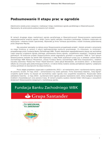 Stowarzyszenie "Odnowa Wsi Wawrzeńczyce" Podsumowanie II etapu prac w ogrodzie Zakończone zostały prace związane z realizacją II etapu rewitalizacji ogrodu parafialnego w Wawrzeńczycach. Zapraszamy do przeczytania podsumowania tych działań. W ramach drugiego etapu rewitalizacji ogrodu parafialnego w Wawrzeńczycach Stowarzyszenie zaplanowało zagospodarowanie wnętrza ogrodu, dzięki czemu ogród nabrałby charakteru parkowego. Działania rozpoczęto od wytyczenia i ułożenia ścieżki spacerowej. Wykonała ją firma Tomasza Jęczmionka z kostki brukowej podarowanej przez Zbigniewa Mączkę. Aby pozyskać pieniądze na dalsze prace Stowarzyszenie przygotowało projekt i złożyło wniosek o przyznanie na niego funduszy w ramach II edycji ogólnopolskiego konkursu grantowego „Tu mieszkam, tu zmieniam” prowadzonego przez Fundację Banku Zachodniego WBK. Projekt obejmował zagospodarowanie skarpy we wschodniej części poprzez urządzenie ogrodu skalnego, plantowanie terenu ogrodu, uzupełnienie nasadzeń i instalację ławek parkowych. W konkursie projekt Stowarzyszenia został nagrodzony grantem w wysokości 7000 zł. Tym samym Stowarzyszenie znalazło się wśród 300 organizacji z całej Polski wybranych przez jury w składzie: prezes Banku Zachodniego WBK Mateusz Morawiecki, prezes Fundacji Banku Zachodniego WBK Eliza Dzwonkiewicz, redaktor naczelny dziennika "Polska the Times" Paweł Siennicki i aktor Jakub Wesołowski. 16 września 2015 r. w Warszawie odbyła się uroczysta gala podsumowująca konkurs, w trakcie której rozdane zostały pamiątkowe dyplomy i podpisano umowy grantowe ze zwycięzcami tej edycji konkursu. Prace objęte projektem rozpoczęto w październiku 2015 r. od nawiezienia ziemi i wyrównania terenu ogrodu do poziomu ścieżki. W maju 2016 r. zamontowano trzy ławki parkowe. Firma Stanisława Adamka „Twój Ogród” urządziła ogród skalny na skarpie we wschodniej części ogrodu oraz uzupełniła nasadzenia. Rozpoczęto także zakładanie trawnika – w maju 2016 r. wyrównano teren ogrodu poprzez nawiezienie ziemi, którą następnie skropiono środkiem chwastobójczym oraz posiano trawę. W ramach projektu wydano również folder informujący o wszystkich działaniach Stowarzyszenia związanych z rewitalizacją ogrodu. 1