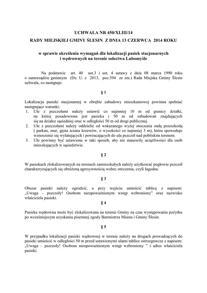 UCHWAŁA NR 450/XLIII/14 RADY MIEJSKIEJ GMINY ŚLESIN Z DNIA 13 CZERWCA 2014 ROKU w sprawie określenia wymagań dla lokalizacji pasiek stacjonarnych i wędrownych na terenie sołectwa Lubomyśle Na podstawie art. 40 ust.3 i ust. 4 ustawy z dnia 08 marca 1990 roku o samorządzie gminnym (Dz. U. z 2013, poz.594 ze zm.) Rada Miejska Gminy Ślesin uchwala, co następuje: §1 Lokalizacja pasieki stacjonarnej w obrębie zabudowy mieszkaniowej powinna spełniać następujące warunki: 1. Ule z pszczołami należy ustawić co najmniej 10 m od granicy działki, na której posadowiona jest pasieka i 50 m od zabudowań znajdujących się na działce sąsiedniej oraz w odległości 50 m od drogi publicznej. 2. Ule z pszczołami należy oddzielić od wskazanego wyżej otoczenia stałą przeszkodą ( parkan, mur, gęsta ściana krzewów, o wysokości co najmniej 3 m), która spowoduje wznoszenie się wylatujących i powracających do ula pszczół nad pobliskim terenem. 3. Ule powinny być ustawione w taki sposób, aby nie stanowiły uciążliwości dla osób mieszkających w sąsiedztwie. §2 W pasiekach zlokalizowanych na terenach zamieszkałych należy użytkować pogłowie pszczół charakteryzujących się obniżoną agresywnością wobec otoczenia, czyli łagodne. §3 Obszar pasieki należy ogrodzić, a przy wejściu umieścić tablicę z napisem: „Uwaga – pszczoły! Osobom nieupoważnionym wstęp wzbroniony” oraz nazwisko właściciela pasieki. §4 Pasieka wędrowna może być zlokalizowana na terenie Gminy na czas występowania pożytku po wcześniejszym uzyskaniu pisemnej zgody Burmistrza Miasta i Gminy Ślesin. §5 W przypadku lokalizacji pasieki wędrownej w terenie należy na drogach prowadzących do pasieki umieścić w odległości 50 m przed ustawionymi ulami tablice ostrzegawcze z napisem: „Uwaga – pszczoły! Osobom nieupoważnionym wstęp wzbroniony ” i adres właściciela pasieki. §6 Naruszenie przepisów uchwały zagrożone jest karą grzywny na zasadach określonych w Kodeksie wykroczeń. §7 Uchwała wchodzi w życie po 14 dniach od dnia ogłoszenia w Dzienniku Urzędowym Województwa Wielkopolskiego. Uzasadnienie do uchwały nr 450/XLIII/14 Rady Miejskiej Gminy Ślesin z dnia 13 czerwca 2014 roku w sprawie określenia wymagań dla lokalizacji pasiek stacjonarnych i wędrownych na terenie sołectwa Lubomyśle W ostatnim okresie do Urzędu Miasta i Gminy w Ślesinie wpływa coraz więcej skarg sąsiedzkich mieszkańców sołectwa Lubomyśle związanych z pożądleniem przez pszczoły, które utrzymywane są w bliskim sąsiedztwie. Ponieważ część skarg jest uzasadniona, a inne przepisy nie regulują kwestii odległości pasiek od budynków sąsiedzkich postanowiono sprawę lokalizacji rozwiązać aktem prawa miejscowego. Przyjęcie uchwały pozwoli na uporządkowanie lokalizacji pasiek stacjonarnych i obwoźnych celem uniknięcia w przyszłości sytuacji konfliktowych na linii pszczelarz - mieszkańcy wsi. W ostatnim czasie doszło do kilkunastu przypadków ukąszeń przez pszczoły dorosłych i dzieci, co dla niektórych z poszkodowanych zakończyło się hospitalizacją, zaś w przypadku osób uczulonych spowodowało bezpośrednie zagrożenie ich zdrowia i życia. Niniejsza uchwała służy ochronie zdrowia i życia ludzkiego mieszkańców sołectwa Lubomyśle.