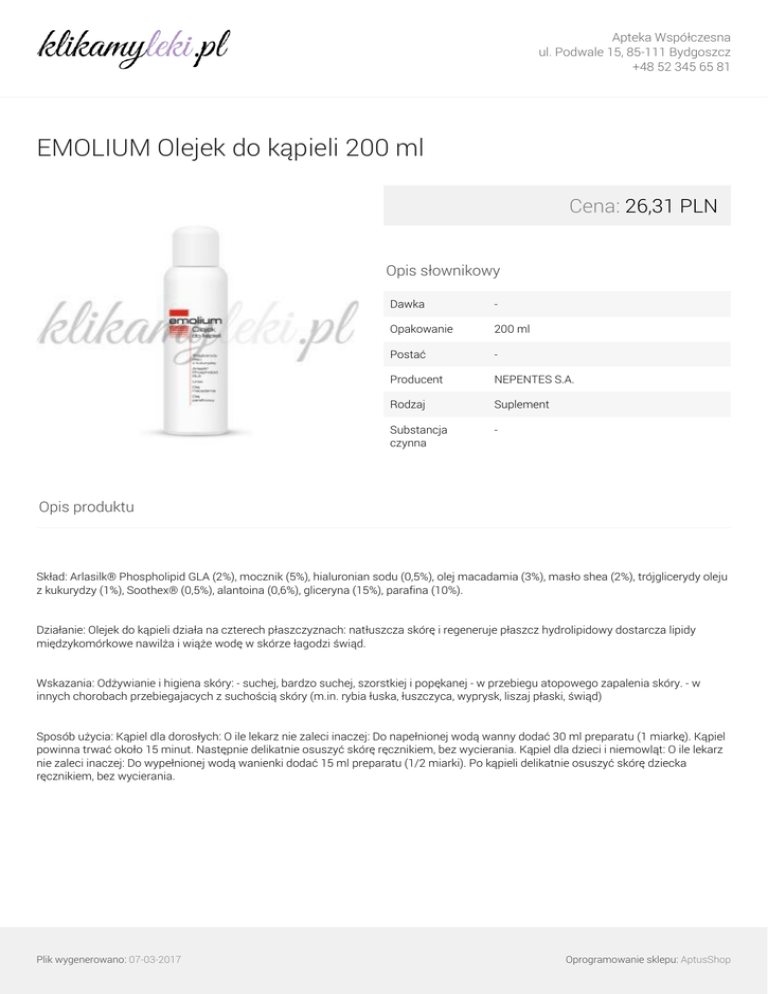 Apteka Współczesna ul. Podwale 15, 85-111 Bydgoszcz +48 52 345 65 81 EMOLIUM Olejek do kąpieli 200 ml Cena: 26,31 PLN Opis słownikowy Dawka - Opakowanie 200 ml Postać - Producent NEPENTES S.A. Rodzaj Suplement Substancja czynna - Opis produktu Skład: Arlasilk® Phospholipid GLA (2%), mocznik (5%), hialuronian sodu (0,5%), olej macadamia (3%), masło shea (2%), trójglicerydy oleju z kukurydzy (1%), Soothex® (0,5%), alantoina (0,6%), gliceryna (15%), parafina (10%). Działanie: Olejek do kąpieli działa na czterech płaszczyznach: natłuszcza skórę i regeneruje płaszcz hydrolipidowy dostarcza lipidy międzykomórkowe nawilża i wiąże wodę w skórze łagodzi świąd. Wskazania: Odżywianie i higiena skóry: - suchej, bardzo suchej, szorstkiej i popękanej - w przebiegu atopowego zapalenia skóry. - w innych chorobach przebiegajacych z suchością skóry (m.in. rybia łuska, łuszczyca, wyprysk, liszaj płaski, świąd) Sposób użycia: Kąpiel dla dorosłych: O ile lekarz nie zaleci inaczej: Do napełnionej wodą wanny dodać 30 ml preparatu (1 miarkę). Kąpiel powinna trwać około 15 minut. Następnie delikatnie osuszyć skórę ręcznikiem, bez wycierania. Kąpiel dla dzieci i niemowląt: O ile lekarz nie zaleci inaczej: Do wypełnionej wodą wanienki dodać 15 ml preparatu (1/2 miarki). Po kąpieli delikatnie osuszyć skórę dziecka ręcznikiem, bez wycierania. Plik wygenerowano: 07-03-2017 Powered by TCPDF (www.tcpdf.org) Oprogramowanie sklepu: AptusShop