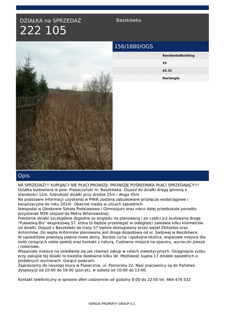 DZIAŁKA na SPRZEDAŻ Baszkówka 222 105 156/1880/OGS ResidentalBuilding 25 45.31 Rectangle Opis NA SPRZEDAŻ!!! KUPUJĄCY NIE PŁACI PROWIZJI, PROWIZJĘ POŚREDNIKA PŁACI SPRZEDAJĄCY!!! Działka budowlana w pow. Piaseczyński m. Baszkówka. Dojazd do działki drogą gminną o szerokości 12m. Szerokość działki przy drodze 25m i długa 45m. Na podstawie informacji uzyskanej w PWiK zostaną zabudowane przyłącza wodociągowe i kanalizacyjne do roku 2014r. Obecnie media w ulicach sąsiednich. Nieopodal w Głoskowie Szkoła Podstawowa i Gimnazjum oraz nieco dalej przedszkole ponadto przystanek MZK (dojazd do Metra Wilanowskiej). Położenie działki szczególnie dogodne ze względu na planowaną i po części już budowaną drogę "Puławską-Bis" ekspresową S7, która to będzie przebiegać w odległości zaledwie kilku kilometrów od działki. Dojazd z Baszkówki do trasy S7 będzie obsługiwany przez węzeł Złotokłos oraz Antoninów. Do węzła Antoninów planowana jest droga dojazdowa od ul. Sadowej w Baszkówce. W sąsiedztwie powstają piękne nowe domy. Bardzo cicha i spokojna okolica, wspaniałe miejsce dla osób ceniących sobie spokój oraz kontakt z naturą. Cudowne miejsce na spacery, wycieczki piesze i rowerowe. Wspaniałe miejsce na osiedlenie się jak również zakup w celach inwestycyjnych. Osiągnięcie zysku przy zakupie tej działki to kwestia dosłownie kilku lat. Możliwość kupna 17 działek sąsiednich o podobnych wymiarach. Gorąco polecam. Zapraszamy do naszego biura w Piasecznie, ul. Pomorska 22. Nasi pracownicy są do Państwa dyspozycji od 10:00 do 18:00 (pon-pt), w sobotę od 10:00 do 13:00. Kontakt telefoniczny w sprawie ofert codziennie od godziny 8:00 do 22:00 tel. 664 476 532 VERSUS PROPERTY GROUP S.C. W celu zapoznania się z naszą pełną ofertą nieruchomości zapraszamy na naszą stronę www.versusgroup.pl Niniejsze ogłoszenie nie stanowi oferty w rozumieniu przepisów Kodeksu Cywilnego oraz innych właściwych przepisów prawnych, a dane w niej zawarte mają jedynie charakter informacyjny. Jacek Gawin tel. 664 476 532 email: [email protected] VERSUS PROPERTY GROUP S.C. Powered by TCPDF (www.tcpdf.org)