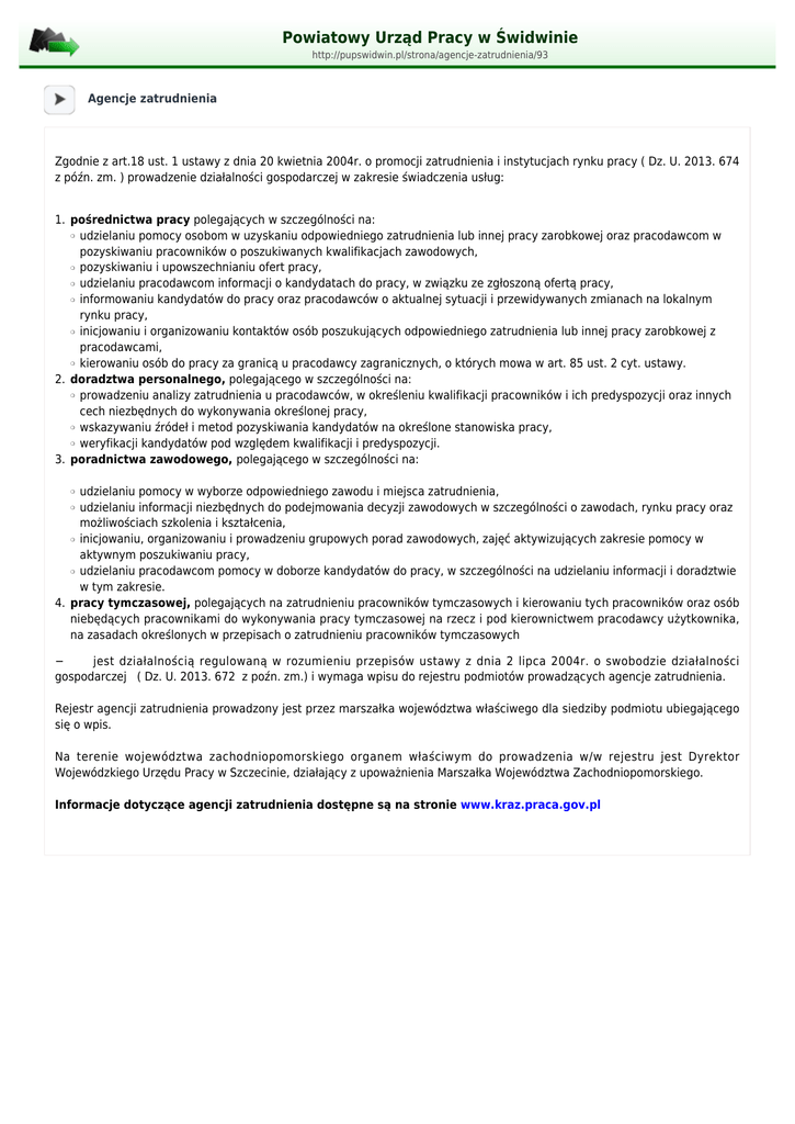 Powiatowy Urząd Pracy w Świdwinie http://pupswidwin.pl/strona/agencje-zatrudnienia/93 Agencje zatrudnienia Zgodnie z art.18 ust. 1 ustawy z dnia 20 kwietnia 2004r. o promocji zatrudnienia i instytucjach rynku pracy ( Dz. U. 2013. 674 z późn. zm. ) prowadzenie działalności gospodarczej w zakresie świadczenia usług: 1. pośrednictwa pracy polegających w szczególności na: udzielaniu pomocy osobom w uzyskaniu odpowiedniego zatrudnienia lub innej pracy zarobkowej oraz pracodawcom w pozyskiwaniu pracowników o poszukiwanych kwalifikacjach zawodowych, pozyskiwaniu i upowszechnianiu ofert pracy, udzielaniu pracodawcom informacji o kandydatach do pracy, w związku ze zgłoszoną ofertą pracy, informowaniu kandydatów do pracy oraz pracodawców o aktualnej sytuacji i przewidywanych zmianach na lokalnym rynku pracy, inicjowaniu i organizowaniu kontaktów osób poszukujących odpowiedniego zatrudnienia lub innej pracy zarobkowej z pracodawcami, kierowaniu osób do pracy za granicą u pracodawcy zagranicznych, o których mowa w art. 85 ust. 2 cyt. ustawy. 2. doradztwa personalnego, polegającego w szczególności na: prowadzeniu analizy zatrudnienia u pracodawców, w określeniu kwalifikacji pracowników i ich predyspozycji oraz innych cech niezbędnych do wykonywania określonej pracy, wskazywaniu źródeł i metod pozyskiwania kandydatów na określone stanowiska pracy, weryfikacji kandydatów pod względem kwalifikacji i predyspozycji. 3. poradnictwa zawodowego, polegającego w szczególności na: ❍ ❍ ❍ ❍ ❍ ❍ ❍ ❍ ❍ udzielaniu pomocy w wyborze odpowiedniego zawodu i miejsca zatrudnienia, udzielaniu informacji niezbędnych do podejmowania decyzji zawodowych w szczególności o zawodach, rynku pracy oraz możliwościach szkolenia i kształcenia, inicjowaniu, organizowaniu i prowadzeniu grupowych porad zawodowych, zajęć aktywizujących zakresie pomocy w aktywnym poszukiwaniu pracy, udzielaniu pracodawcom pomocy w doborze kandydatów do pracy, w szczególności na udzielaniu informacji i doradztwie w tym zakresie. 4. pracy tymczasowej, polegających na zatrudnieniu pracowników tymczasowych i kierowaniu tych pracowników oraz osób niebędących pracownikami do wykonywania pracy tymczasowej na rzecz i pod kierownictwem pracodawcy użytkownika, na zasadach określonych w przepisach o zatrudnieniu pracowników tymczasowych ❍ ❍ ❍ ❍ − jest działalnością regulowaną w rozumieniu przepisów ustawy z dnia 2 lipca 2004r. o swobodzie działalności gospodarczej ( Dz. U. 2013. 672 z poźn. zm.) i wymaga wpisu do rejestru podmiotów prowadzących agencje zatrudnienia. Rejestr agencji zatrudnienia prowadzony jest przez marszałka województwa właściwego dla siedziby podmiotu ubiegającego się o wpis. Na terenie województwa zachodniopomorskiego organem właściwym do prowadzenia w/w rejestru jest Dyrektor Wojewódzkiego Urzędu Pracy w Szczecinie, działający z upoważnienia Marszałka Województwa Zachodniopomorskiego. Informacje dotyczące agencji zatrudnienia dostępne są na stronie www.kraz.praca.gov.pl