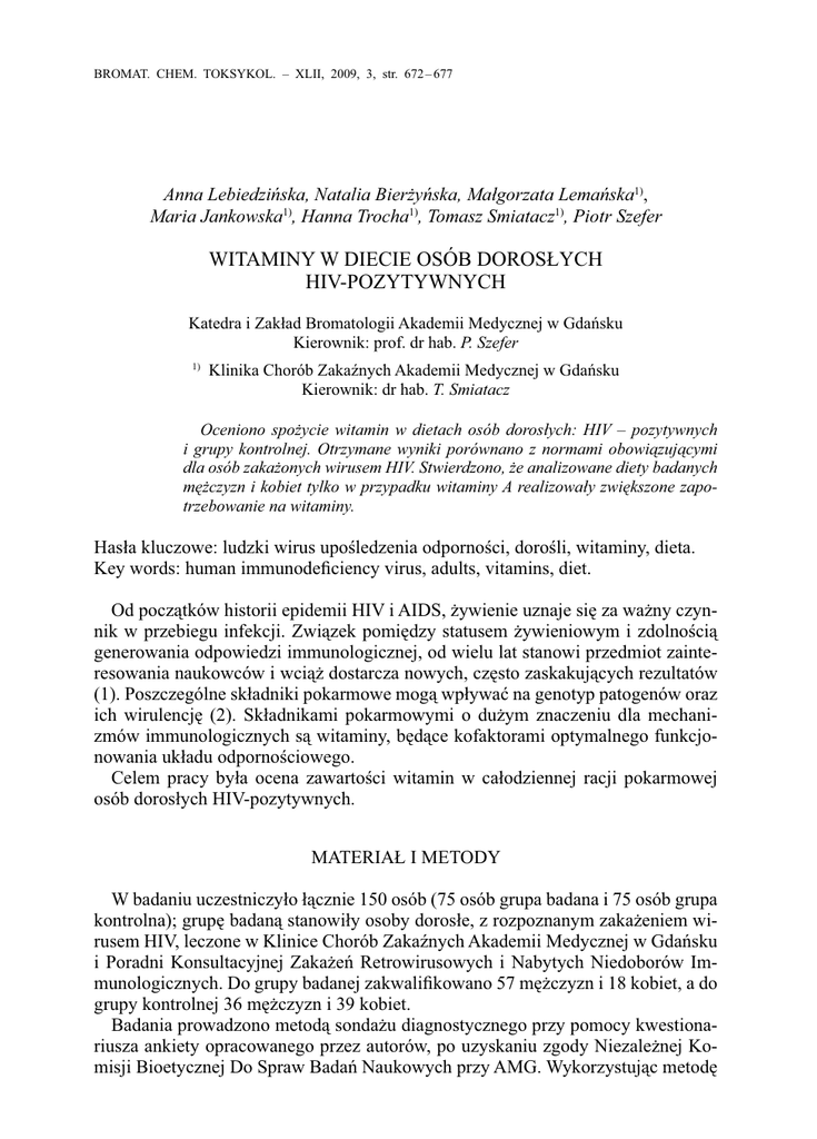 BROMAT. CHEM. TOKSYKOL. – XLII, 2009, 3, str. 672 – 677 Anna Lebiedzińska, Natalia Bierżyńska, Małgorzata Lemańska1), Maria Jankowska1), Hanna Trocha1), Tomasz Smiatacz1), Piotr Szefer WITAMINY W DIECIE OSÓB DOROSŁYCH HIV-POZYTYWNYCH Katedra i Zakład Bromatologii Akademii Medycznej w Gdańsku Kierownik: prof. dr hab. P. Szefer 1) Klinika Chorób Zakaźnych Akademii Medycznej w Gdańsku Kierownik: dr hab. T. Smiatacz Oceniono spożycie witamin w dietach osób dorosłych: HIV – pozytywnych i grupy kontrolnej. Otrzymane wyniki porównano z normami obowiązującymi dla osób zakażonych wirusem HIV. Stwierdzono, że analizowane diety badanych mężczyzn i kobiet tylko w przypadku witaminy A realizowały zwiększone zapotrzebowanie na witaminy. Hasła kluczowe: ludzki wirus upośledzenia odporności, dorośli, witaminy, dieta. Key words: human immunodeficiency virus, adults, vitamins, diet. Od początków historii epidemii HIV i AIDS, żywienie uznaje się za ważny czynnik w przebiegu infekcji. Związek pomiędzy statusem żywieniowym i zdolnością generowania odpowiedzi immunologicznej, od wielu lat stanowi przedmiot zainteresowania naukowców i wciąż dostarcza nowych, często zaskakujących rezultatów (1). Poszczególne składniki pokarmowe mogą wpływać na genotyp patogenów oraz ich wirulencję (2). Składnikami pokarmowymi o dużym znaczeniu dla mechanizmów immunologicznych są witaminy, będące kofaktorami optymalnego funkcjonowania układu odpornościowego. Celem pracy była ocena zawartości witamin w całodziennej racji pokarmowej osób dorosłych HIV-pozytywnych. MATERIAŁ I METODY W badaniu uczestniczyło łącznie 150 osób (75 osób grupa badana i 75 osób grupa kontrolna); grupę badaną stanowiły osoby dorosłe, z rozpoznanym zakażeniem wirusem HIV, leczone w Klinice Chorób Zakaźnych Akademii Medycznej w Gdańsku i Poradni Konsultacyjnej Zakażeń Retrowirusowych i Nabytych Niedoborów Immunologicznych. Do grupy badanej zakwalifikowano 57 mężczyzn i 18 kobiet, a do grupy kontrolnej 36 mężczyzn i 39 kobiet. Badania prowadzono metodą sondażu diagnostycznego przy pomocy kwestionariusza ankiety opracowanego przez autorów, po uzyskaniu zgody Niezależnej Komisji Bioetycznej Do Spraw Badań Naukowych przy AMG. Wykorzystując metodę Nr 3 Witaminy w diecie osób dorosłych HIV-pozytywnych 673 bezpośredniego wywiadu, prowadzono wywiad żywieniowy o spożyciu z ostatnich 24 godzin (3) z każdym z uczestników indywidualnie, posługując się Albumem fotografii potraw i produktów (4). Zawartość składników odżywczych w całodziennych racjach pokarmowych i ich wartość energetyczną oszacowano przy użyciu programu komputerowego „Wikt 1.3” bazującego na aktualnie obowiązujących tabelach wartości odżywczej produktów, opracowanych w Instytucie Żywności i Żywienia w Warszawie (5). Wyniki badań zostały poddane analizie statystycznej, przy wykorzystaniu programu „Statistica 7.1”. Za pomocą U-testu Manna-Whitneya sprawdzono statystycznie istotne różnice pomiędzy badanymi parametrami z 2 grup danych, tj. dla osób HIV – pozytywnych i osób HIV-negatywnych. WYNIKI I ICH OMÓWIENIE Niedobory podstawowych składników odżywczych, jak i witamin oraz składników mineralnych, upośledzają podstawowe funkcje układu immunologicznego: odporność komórkową, mechanizm fagocytozy, działanie układu dopełniacza, wytwarzanie przeciwciał oraz syntezę cytokin (6). Immunostymulujące własności witamin, zwłaszcza grupy B oraz witaminy A, E i C, których niskie poziomy często obserwujemy w infekcji HIV i chorobie AIDS, zostały potwierdzone w licznych badaniach z udziałem zwierząt i ludzi (7). Rekomendacje spożycia witamin dla osób zakażonych są znacząco wyższe w porównaniu z zaleceniami dla osób zdrowych, gdyż potwierdzono zmniejszenie ryzyka rozwoju pełnoobjawowego AIDS, w obserwacjach pacjentów HIV-pozytywnych, związane z suplementacją diety witaminami (1, 7–11). Uzyskane średnie zawartości analizowanych witamin przedstawiono w tabeli I. Witamina C wspomaga pracę układu immunologicznego, ze względu na właściwości przeciwwirusowe i antyoksydacyjne. Wysokie jej dawki mogą stymulować aktywność limfocytów T oraz komórek fagocytarnych. Diety mężczyzn grupy badanej dostarczają średnio 110 mg witaminy C, a grupy kontrolnej 162 mg omawianej witaminy. Diety badanych kobiet zawierały średnio 107 mg kwasu askorbinowego w przypadku grupy badanej oraz 168 mg w przypadku grupy kontrolnej. Biorąc pod uwagę rekomendacje dla osób zakażonych: od 200 mg do 500 mg (8, 11), spożycie witaminy C przez osoby HIV-pozytywne może okazać się niewystarczające. Kliniczne obserwacje dotyczące deficytu tiaminy w przypadku rozwoju AIDS wskazują na współistnienie zespołu Wernickiego-Korsakowa i mokrej postaci beriberi (12). Diety mężczyzn grupy badanej dostarczały średnio 1,62 mg tiaminy, a grupy kontrolnej 1,81 mg omawianej witaminy. W dietach kobiet średnia zawartość tiaminy wynosiła 1,36 mg w przypadku grupy badanej i 1,11 mg w przypadku grupy kontrolnej. Po uwzględnieniu aktualnej normy na witaminę B1 (1,1–1,3 mg), realizacja dziennego zapotrzebowania wynosi ponad 100%, natomiast w stosunku do rekomendacji dla osób HIV – pozytywnych, diety grupy badanych nie pokrywają dziennego zapotrzebowanie na tiaminę. Dostępne dane literaturowe, dotyczące rekomendacji żywieniowych dla osób żyjących z HIV, zalecają dzienne spożycie tiaminy na poziomie 2,60 mg (1) lub według innego źródła, nawet do 20 mg (8) dziennie. 674 Nr 3 A. Lebiedzińska i inni Ta b e l a I. Zawartość wybranych makroskładników i witamin w dietach badanych respondentów Ta b l e I. The content of basic nutrients and vitamins in respondents diets. Mężczyźni HIV pozytywny N=57 HIV negatywny N=36 Kobiety HIV pozytywny N=18 HIV negatywny N=39 Energia 11249 ± 4686 (3060–25622) 12219 ± 5408 (4832–23678) 10871 ± 8106 (