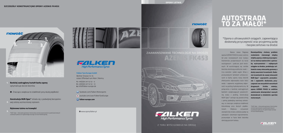 opony letnie szczegóły konstrukcyjne opony azenis fk453: AUTOstrada to za mało!* 3. 2. 3. 1. *Opona o ultrawysokich osiągach, zapewniająca doskonałą przyczepność oraz przyjemną jazdę i bezpieczeństwo na drodze zaawansowane technologie na drodze AZENIS FK453 1. Bardziej zaokrąglony kształt barku opony optymalizuje docisk bieżnika • Znacząco zwiększa to stabilność przy dużej prędkości Konstrukcja NUR-Spec* składa się z podwójnej bezspoino2. wej osłony wzmocnionej nylonem. 3. nowa flagowa Rozwiązaliśmy złożony problem opona AZENIS FK453 to owoc sześciu znalezienia lat prac rozwojowych oraz tysięcy miękką oponą o dobrej przyczepno- kilometrów przejechanych na torze ści na mokrej nawierzchni a potrze- wyścigowym i podczas jazd testo- bą wytrzymałości i najlepszych wych. W wyróżniającej się rzeźbie osiągów na drodze, produkując cał- bieżnika dominują wzdłużne rowki — kowicie nową mieszankę gumową o Falken Tyre Europe GmbH Berliner Strasse 74–76 63065 Offenbach am Main | Niemcy trzy szerokie i jeden wąski. Wraz z dużej zawartości krzemionki. Doda- przesuniętymi lamelami umieszczo- nie krzemionki do nowej mieszanki nymi w barku opony nowy bieżnik NUR-Spec* usprawniło prowadze- t. +49(0)69 247 52 52 - 0 f. +49(0)69 247 52 52 - 12 e. [email protected] efektywnie odprowadza duże ilości nie i zapewniło doskonałą przy- wody i zapewnia wyjątkową odpor- czepność we wszystkich warunkach ność na poślizg hydrodynamiczny. W drogowych. połączeniu z bardziej zaokrąglonym opona AZENIS FK453 to ambitne facebook.com/Falken.Motorsports barkiem zwiększającym powierzch- uwieńczenie dziesięcioleci naszych youtube.com/user/FalkenTyreEurope nię styku z jezdnią, konstrukcja doświadczeń w dziedzinie sportów NUR-Spec* cechuje się powierzchnią motorowych. falken-europe.com równowagi Krótko między mówiąc, z pełną podwójną warstwą osłonową, co znacząco zwiększa stabilność kierunkową przy dużych prędko- Nylonowa taśma na krawędzi *NUR-Spec - mieszanka gumowa i konstrukcja zostały opracowane na podstawie danych zyskanych podczas 24-godzinnego wyścigu na torze Nuerburgring. Nasza ściach. • www.oponyfalken.pl Większa sztywność zewnętrznej ściany ułatwia jazdę na zakrętach, natomiast naprzemienne, przesunięte w fazie bloki bieżnika obniżają poziom hałasu. Z toru wyścigowego na drogę *NUR-Spec - mieszanka gumowa i konstrukcja zostały opracowane na podstawie danych uzyskanych podczas 24-godzinnego wyścigu na torze Nuerburgring. azenis fk453 Rozmiary opon azenis fk453 Dopuszczalne felgi Szerokość obręczy pomiarowej FK453 SERIA 25 Y XL285/25ZR20 93Y XL 295/25ZR20 (95 Y) XL295/25ZR22 97Y 10.5J (11.0) 10.0 – 11.0J 10.0 – 11.0J (11.5) 10.5 10.5 10.5 FK453 SERIA 30 Y XL295/30ZR1898Y XL245/30ZR1989Y XL255/30ZR1991Y XL 265/30ZR19 (93Y) XL 275/30ZR19 (96Y) XL285/30ZR1998Y XL 295/30ZR19 (100 Y) XL 305/30ZR19 (102 Y) XL 235/30ZR20 (88Y) XL 245/30ZR20 (90Y) XL255/30ZR2092Y XL275/30ZR2097Y XL285/30ZR2099Y XL245/30ZR2292Y XL255/30ZR2295Y 10.0 - 11.0J (11.5) 8.0 - 9.0J 8.5 - 9.5J 9.0 - 10.0J (10.5) 9.0 - 10.0J (10.5) 9.5 - 10.5J 10.0 - 11.0J 10.5 - 11.5J 8.5J (9.0) 8.0 - 9.0J (9.5) 8.5 - 9.5J (10.0) 9.0 - 10.0J (10.5) 9.5 - 10.5J (11.0) 8.0 - 9.0J (9.5) 8.5 - 9.5J (10.0) 10.5 8.5 9.0 9.5 9.5 10.0 10.5 11.0 8.5 8.5 9.0 9.5 10.0 8.5 9.0 7.5 8.0 8.5 9.0 9.0 9.5 7.0 7.5 8.0 8.0 9.0 9.0 9.5 8.0 8.5 9.0 8.0 8.5 9.0 9.5 9.5 10.0 7.5 8.0 8.5 8.5 9.5 9.5 10.0 8.5 9.0 9.5 FK453 SERIA 35 Y XL225/35ZR18 87Y XL245/35ZR18 92Y XL255/35ZR18 94Y XL265/35ZR18 (97Y) XL275/35ZR18 99Y XL285/35ZR18 101Y XL215/35ZR19 85Y XL225/35ZR19 88Y XL 235/35ZR19(91Y) XL245/35ZR19 (93Y) XL265/35ZR19 98Y XL275/35ZR19 (100Y) 285/35ZR19 (99Y) XL245/35ZR20 95Y XL255/35ZR20 97Y XL275/35ZR20 102Y - 9.0J (9.5) - 9.5J (10.0) - 10.0J (10.5) - 10.5J (11.0) - 11.0J (11.5) - 11.0J (11.5) - 8.5J (9.0) - 9.0J (9.5) - 9.5J(10.0) - 9.5J (10.0) - 10.5J - 11.0J (11.5) - 11.0J (11.5) - 9.5J (10.0) - 10.0J (10.5) - 11.0J (11.5) Wszystkie rozmiary są wyposażone w system ochrony felgi przed uszkodzeniem. Rozmiary opon nowa opona o sportowym charakterze z ultrawysokimi osiągami Dopuszczalne felgi FK452 8.0 8.0 8.5 9.0 9.0 7.5 8.0 8.0 8.5 9.0 9.0 8.0 8.5 9.0 8.0 - 9.5J (10.0) - 9.5J (10.0) - 10.0J (10.5) - 10.5J (11.0) - 11.0J(11.5) - 9.0J (9.5) - 9.5J (10.0) - 9.5J (10.0) - 10.0J (10.5) - 10.5J - 11.0J (11.5) - 9.5J (10.0) - 10.0J (10.5) - 11.0J (11.5) - 9.5J (10.0) 8.5 8.5 9.0 9.5 9.5 8.0 8.5 8.5 9.0 9.5 9.5 8.5 9.0 9.5 8.5 FK453 SERIA 45 Y XL215/45ZR17 XL225/45ZR17 XL235/45ZR17 XL245/45ZR17 XL215/45ZR18 XL225/45ZR18 XL235/45ZR18 XL245/45ZR18 XL255/45ZR18 XL225/45ZR19 XL245/45ZR19 7.0 7.0 7.5 7.5 7.0 7.0 7.5 7.5 8.0 7.0 7.5 - - - - - - - - - - - 7.0 7.5 8.0 8.0 7.0 7.5 8.0 8.0 8.5 7.5 8.0 8.0J (8.5) 8.5J (9.0) 9.0J (9.5) 9.0J (9.5) 8.0J 8.5J (9.0) 9.0J 9.0J (9.5) 9.5J (10.0) 8.5J 9.0J (9.5) Szerokość obręczy podana w nawiasach jest także dopuszczalna zgodnie z potwierdzeniem od firmy Falken Tyre Europe GmbH. AZENIS FK453 2. 3. 4. FK452 • NOWOŚĆ • AZENIS FK453 cechy opony azenis fk453: cechy: •doskonała sterowność •niski poziom hałasu przy każdej prędkości •maksymalne bezpieczeństwo i stabilność •bezpieczne zmiany pasa ruchu •duża stabilność przy szybkim pokonywaniu zakrętów FK453 SERIA 50 Y XL 205/50ZR1793Y XL225/50ZR17 98Y 5.5 - 7.5J(8.0) 6.0 - 8.0J 1. Szerokość obręczy pomiarowej FK453 SERIA 40 Y XL235/40ZR17 94Y XL245/40ZR17 95Y XL255/40ZR17 98Y XL265/40ZR17 100Y 275/40ZR1798Y XL225/40ZR18 92Y XL235/40ZR18 95Y XL245/40ZR18 97Y XL255/40ZR18 (99Y) XL265/40ZR18 (101Y) 275/40ZR1899Y XL245/40ZR19 98Y XL255/40ZR19 100Y 275/40ZR19101Y XL245/40ZR20 99Y 91Y 94Y 97Y 99Y 93Y 95Y 98Y 100Y 103Y 96Y 102Y azenis fk453 — szczegóły bieżnika: 6.5 7.0 •wyjątkowa odporność na poślizg hydrodynamiczny •usprawnione prowadzenie na mokrej nawierzchni •krótsza droga hamowania szeroka gama rozmiarów: indeks prędkości: 62 r