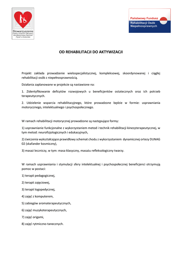OD REHABILITACJI DO AKTYWIZACJI Projekt zakłada prowadzenie wielospecjalistycznej, kompleksowej, skoordynowanej i ciągłej rehabilitacji osób z niepełnosprawnością. Działania zaplanowane w projekcie są nastawione na: 1. Zidentyfikowanie deficytów rozwojowych u beneficjentów ostatecznych oraz ich potrzeb terapeutycznych. 2. Udzielenie wsparcia rehabilitacyjnego, które prowadzone będzie w formie: usprawniania motorycznego, intelektualnego i psychospołecznego. W ramach rehabilitacji motorycznej prowadzone są następujące formy: 1) usprawnianie funkcjonalne z wykorzystaniem metod i technik rehabilitacji kinezyterapeutycznej, w tym metod: neurofizjologicznych i edukacyjnych, 2) ćwiczenia wykształcające prawidłowy schemat chodu z wykorzystaniem dynamicznej ortezy DUNAG 02 (skafander kosmiczny), 3) masaż leczniczy, w tym: masa klasyczny, masażu refleksologiczny twarzy. W ramach usprawniania i stymulacji sfery intelektualnej i psychospołecznej beneficjenci otrzymują pomoc w postaci: 1) terapii pedagogicznej, 2) terapii zajęciowej, 3) terapii logopedycznej, 4) zajęć z komputerem, 5) zabiegów aromaterapeutycznych, 6) zajęć muzykoterapeutycznych, 7) zajęć origami, 8) zajęć rytmiczno-tanecznych.