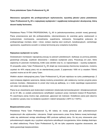 Piana pistoletowa Tytan Professional O2 65 Stworzona specjalnie dla profesjonalnych wykonawców, wysokiej jakości piana pistoletowa Tytan Professional O2 65 o najwyższej wydajności i wyjątkowej izolacyjności akustycznej, którą doceni każdy fachowiec. Pistoletowa Piana TYTAN PROFESSIONAL O2 65 to jednokomponentowy produkt nowej generacji. Piana przeznaczona jest dla profesjonalistów, rekomendowana do szerokiej gamy zastosowań w budownictwie: montowania, uszczelniania, wypełniania, izolowania. Szczególnie polecana do profesjonalnego montażu okien i drzwi, izolacji cieplnej sieci wodnych, kanalizacyjnych, centralnego ogrzewania, wypełniania szczelin w izolacji termicznej przy ocieplaniu budynków. Najwyższa wydajność na rynku Doświadczeni montażyści najczęściej pracują na pianach pistoletowych. Aplikacja za pomocą pistoletu gwarantuje precyzję, szybkość stosowania i zwiększa wydajność piany. Poszukują oni pian, które zapewnią im pewność montażową, krótki czas obróbki oraz to, co najważniejsze – wysoką wydajność. W przypadku piany Tytan Professional O2 65 dzięki jej nowoczesnej chemicznej recepturze, możemy uzyskać do 40% więcej piany niż ze standardowej puszki. Z pojemności 1000 ml (z wsadem 750ml) uzyskać można aż do 65 l piany Tytan. Wielkim atutem niskoprężnej piany Tytan Professional O2 65 jest najniższa na rynku postekspansja. Z racji mniejszej objętości spieniania, łatwiej możemy przewidzieć, jaki ostateczny rozmiar przyjmie piana podczas montażu. Zabezpiecza to przed zbyt dużą jej aplikacją, co z kolei zapobiega wypaczeniom ram okien lub ościeży drzwi. Piana ta po utwardzeniu jest doskonałym izolatorem (doskonała termoizolacyjność i dźwiękoszczelność aż do 61 dB), co zostało potwierdzone certyfikatem wydanym przez niemiecki instytut ift Rosenheim. Po zaschnięciu pianę można ciąć, piaskować, gipsować lub malować. Dodatkowo piana jest odporna na pleśnie i grzyby oraz na działanie wysokich i niskich temperatur (-60ºC to +100ºC). Bezpieczeństwo pracy Pistoletowa Piana Tytan Professional O2 65 należy do nowej generacji pian poliuretanowych bezpiecznych dla użytkownika i otoczenia. Dzięki opracowaniu przez firmę Selena nowej technologii, udało się zablokować emisję szkodliwego MDI podczas aplikacji piany. Do tej pory stosowanie pian poliuretanowych wiązało się z ryzykiem wdychania szkodliwych izocyjanianów, które działają drażniąco na układ oddechowy. Piana Tytan Professional O2 65 nie tylko zapewnia wygodne stosowanie, ale także gwarantuje bezpieczeństwo.