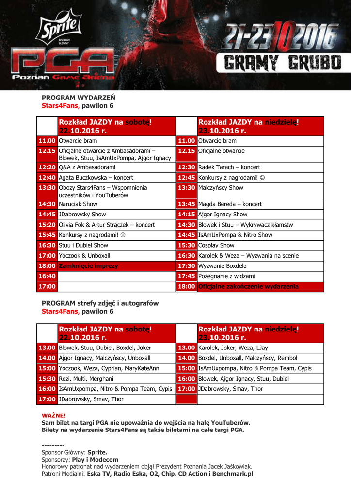 PROGRAM WYDARZEŃ Stars4Fans, pawilon 6 Rozkład JAZDY na sobotę! 22.10.2016 r. Rozkład JAZDY na niedzielę! 23.10.2016 r. 11.00 Otwarcie bram 11.00 Otwarcie bram 12.15 Oficjalne otwarcie z Ambasadorami – Blowek, Stuu, IsAmUxPompa, Ajgor Ignacy 12.15 Oficjalne otwarcie 12:20 Q&A z Ambasadorami 12:30 Radek Tarach – koncert 12:40 Agata Buczkowska – koncert 12:45 Konkursy z nagrodami! ☺ 13:30 Obozy Stars4Fans – Wspomnienia uczestników i YouTuberów 13:30 Malczyńscy Show 14:30 Naruciak Show 13:45 Magda Bereda – koncert 14:45 JDabrowsky Show 14:15 Ajgor Ignacy Show 15:20 Olivia Fok & Artur Strączek – koncert 14:30 Blowek i Stuu – Wykrywacz kłamstw 15:45 Konkursy z nagrodami! ☺ 14:45 IsAmUxPompa & Nitro Show 16:30 Stuu i Dubiel Show 15:30 Cosplay Show 17:00 Yoczook & Unboxall 16:30 Karolek & Weza – Wyzwania na scenie 18:00 Zamknięcie imprezy 17:30 Wyzwanie Boxdela 16:40 17:45 Pożegnanie z widzami 17:00 18:00 Oficjalne zakończenie wydarzenia PROGRAM strefy zdjęć i autografów Stars4Fans, pawilon 6 Rozkład JAZDY na sobotę! 22.10.2016 r. Rozkład JAZDY na niedzielę! 23.10.2016 r. 13.00 Blowek, Stuu, Dubiel, Boxdel, Joker 13.00 Karolek, Joker, Weza, LJay 14.00 Ajgor Ignacy, Malczyńscy, Unboxall 14.00 Boxdel, Unboxall, Malczyńscy, Rembol 15:00 Yoczook, Weza, Cyprian, MaryKateAnn 15:00 IsAmUxpompa, Nitro & Pompa Team, Cypis 15:30 Rezi, Multi, Merghani 16:00 Blowek, Ajgor Ignacy, Stuu, Dubiel 16:00 IsAmUxpompa, Nitro & Pompa Team, Cypis 17:00 JDabrowsky, Smav, Thor 17:00 JDabrowsky, Smav, Thor WAŻNE! Sam bilet na targi PGA nie upoważnia do wejścia na halę YouTuberów. Bilety na wydarzenie Stars4Fans są także biletami na całe targi PGA. --------Sponsor Główny: Sprite. Sponsorzy: Play i Modecom Honorowy patronat nad wydarzeniem objął Prezydent Poznania Jacek Jaśkowiak. Patroni Medialni: Eska TV, Radio Eska, O2, Chip, CD Action i Benchmark.pl