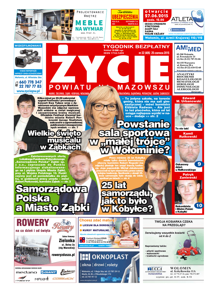 15 000 Kilka minut po 20.00 zabrzmiał sygnał Festiwalu i prowadząca koncert Ewa Tułacz wraz z dyrektorem artystycznym Markiem Wysockim (na zdjęciu) wprowadzili widzów w świat magicznej i zaczarowanej krainy musicali. Oficjalnie Festiwal otworzył burmistrz miasta Robert Perkowski życząc finalistom sukcesów a zgromadzonej publiczności niezapomnianych wrażeń. >> str. 7 Wielkie święto musicalu w Ząbkach – Zainteresowanych ofertą Lokalnego Funduszu Pożyczkowego „Samorządowa Polska” Ząbki sp. z o.o., zapraszam do Punktu Informacyjnego zlokalizowanego na I piętrze Urzędu Miasta Ząbki, przy ul. Wojska Polskiego 10. Punkt czynny jest od poniedziałku do piątku, w godzinach pracy urzędu – mówi Robert Perkowski, burmistrz Ząbek >> str. 3 nr 22 (405) 25 czerwca 2015 – To jedyna szkoła, na terenie gminy, która nie ma sali gimnastycznej – mówi burmistrz Elżbieta Radwan. – Ale jest to też placówka, która od lat osiąga najlepsze wyniki w nauce – dodaje >> str. 2 Powstanie sala sportowa w „małej trójce” w Wołominie? Samorządowa Polska a Miasto Ząbki Przez minione 25 lat Kobyłka miała tylko dwóch burmistrzów: obecny burmistrz Robert Roguski (na zdjęciu) piastuje ten urząd trzecią kadencję. Jego poprzednik- Michał Jakubowski pracował na tym stanowisku przez cztery kolejne kadencje. Spotkanie z okazji 25. lecia samorządu bylo okazją do wielu spotkań po latach >> str. 4 25 lat samorządu, jak to było w Kobyłce? Edward M. Urbanowski 3 To nie tak! Kamil Rutkowski 9 Oskarowy dzień u Nałkowskiego Patryk Zaniewski Rekordzista i Mistrz Polski z Kobyłki 10 2 więcej wiadomości na www.zyciepw.pl powiat 25 czerwca 2015 Możemy się tylko cieszyć, że mimo pojawiającej się informacji o braku środków w budżecie, Wołomina miasto wygospodarowało fundusze na nową salę gimnastyczną przy Szkole Podstawowej nr 3 imienia Marszałka Józefa Piłsudskiego. Jak się dowiedzieliśmy w najbliższych dniach ogłoszone zostanie postępowanie przetargowe na realizację inwestycji, której zakończenie zaplanowano na koniec sierpnia 2016 roku. Powstanie sala gimnastyczną w „małej trójce” w Wołominie? Historia wołomińskiej „trójki” sięga okresu międzywojennego, obecnie w placówce, która od 1 września 2000 roku mieści się w budynku przy ul. Piłsudskiego 51, w klasach 0-VI uczy się ponad trzystu trzydziestu uczniów. Do dyspozycji tak dużej grupy uczniów jest jedynie sześć sal lekcyjnych oraz niewielka sala gimnastyczna, świetlica i biblioteka. – To jedyna szkoła, na terenie gminy, która nie ma sali gimnastycznej – mówi burmistrz Elżbieta Radwan. – Ale jest to też placówka, która od lat osiąga najlepsze wyniki w nauce. Tak, jak obiecałam, na oświatę i poprawę warunków kształcenia wołomińskich dzieci zawsze znajdziemy pieniądze. Nie było łatwo, ale w porozumieniu z radą miejską wygospodarowaliśmy środki na tę inwestycję, z czego bardzo się cieszę – dodaje. Na tę inwestycję środowisko szkoły czeka od bardzo dawna. W poprzedniej kadencji rodzice głośno akcentowali potrzeby związane z edukacją w „małej trójce”. Wielokrotnie przychodzili na posiedzenia rady, składali też wizyty u burmistrza, angażowali w temat radnych. Nie dziwi więc, że entuzjazm burmistrz Elżbiety Radwan i zadowolenie z mającej rozpocząć się inwestycji podziela także dyrekcja szkoły, nauczyciele, uczniowie i ich rodzice. – Dzięki nowo powstałej sali gimnastycznej dzieci będą mogły ćwiczyć w komfortowych warunkach i realizować swoje sportowe pasje. Przy okazji tej inwestycji szkoła zyska dodatkowo również sali gimnastycznej i lada dzień ogłoszony zostanie przetarg, który wyłoni wykonawcę inwestycji. Zgodnie z dokumentacją szkoła zostanie rozbudowana o część trzykondygnacyjną w kształcie dwóch stykających się prostokątów o wymiarach 17,42m x 24,4m oraz 11,08m x 12 m. – To jedyna szkoła, na terenie gminy, która nie ma sali gimnastycznej – mówi burmistrz Elżbieta Radwan. – Ale jest to też placówka, która od lat osiąga najlepsze wyniki w nauce. Tak, jak obiecałam, na oświatę i poprawę warunków kształcenia wołomińskich dzieci zawsze znajdziemy pieniądze. Nie było łatwo, ale w porozumieniu z radą miejską wygospodarowaliśmy środki na tę inwestycję, z czego bardzo się cieszę – dodaje. nowe sale lekcyjne i szatnię, a cały budynek będzie miał nowoczesny wygląd – podkreśla jedna z mam. Wydaje się, że wszystko jest na dobrej drodze i inwestycja doczeka się szczęśliwego finały, gdyż – jak wynika z oficjalnych informacji – w maju magistrat uzyskał pozwolenie na budowę Budynek w modernizowanej części jest podpiwniczony i docelowo będzie się składał ze strefy dydaktycznej, obejmującej 10 sal lekcyjnych, świetlicę i bibliotekę oraz nowej sali gimnastycznej wraz z zapleczem. Bezpośrednio przy sali gimnastycznej zaprojektowano magazyn sprzętu sportowego, powstaną też dwie szatnie z umywalniami przeznaczone dla 17 osób każda oraz pokój nauczycieli WF-u z szatnią i łazienką. Przyjęty do realizacji projekt architektoniczno-budowlany zakłada również budowę części administracyjnej, w której znajdą się dwa pokoje dyrektorów, sekretariat, pokój nauczycielski, pokój pielęgniarki, pokój pedagoga i pomieszczenie woźnego. Powstanie też zaplecze sanitarne i szatnia uczniowska z prawdziwego zdarzenia. Strefę wejściową dla uczniów zaprojektowano w północnowschodniej części budynku, bezpośrednio przy szatni, natomiast wejście dla nauczycieli i rodziców zlokalizowano przy nowo projektowanej klatce schodowej. W sali gimnastycznej znajdzie się rozsuwana trybuna na ponad dziewięćdziesięciu widzów oraz boisko sportowe o wymiarach 11m x 21m, które pozwoli na rozgrywki siatkówki, koszykówki, piłki ręcznej, czy nożnej halowej. Przewiduje się też podział hali na dwa boiska ćwiczebne, wydzielon