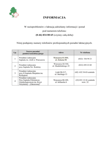 INFORMACJA W razieproblemów z laktacją udzielamy informacji i porad pod numerem telefonu: (0-46) 834 08 65 (czynny całą dobę) Niżej podajemy numery telefonów profesjonalnych poradni laktacyjnych. Lp. Nazwa poradni/ punktu konsultacyjnego 1 Poradnia Laktacyjna Szpitala św. Zofii w Warszawie 2 Poradnia Laktacyjna przy Szpitalu Św. Rodziny 3 4 Poradnia Laktacyjna przy II Szpitalu Miejskim im. Rydygiera Poradnia Laktacyjna Przy Szpitalu PołożniczoGinekologicznym im. Krysi Niżyńskiej –„Zakurzonej” Adres Nr telefonu Warszawa 01-004, ul. Żelazna 90 (022) 536 94 21 Warszawa 02-544, ul. Madalińskiego 25 (022) 450 22 68 Łódź 90-217, ul. Sterlinga 13 (42) 632 34 65-centrala Warszawa 00-189, ul. Inflancka 6 (22) 831 12 41-centrala wew. 32