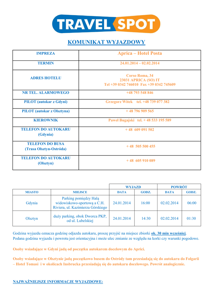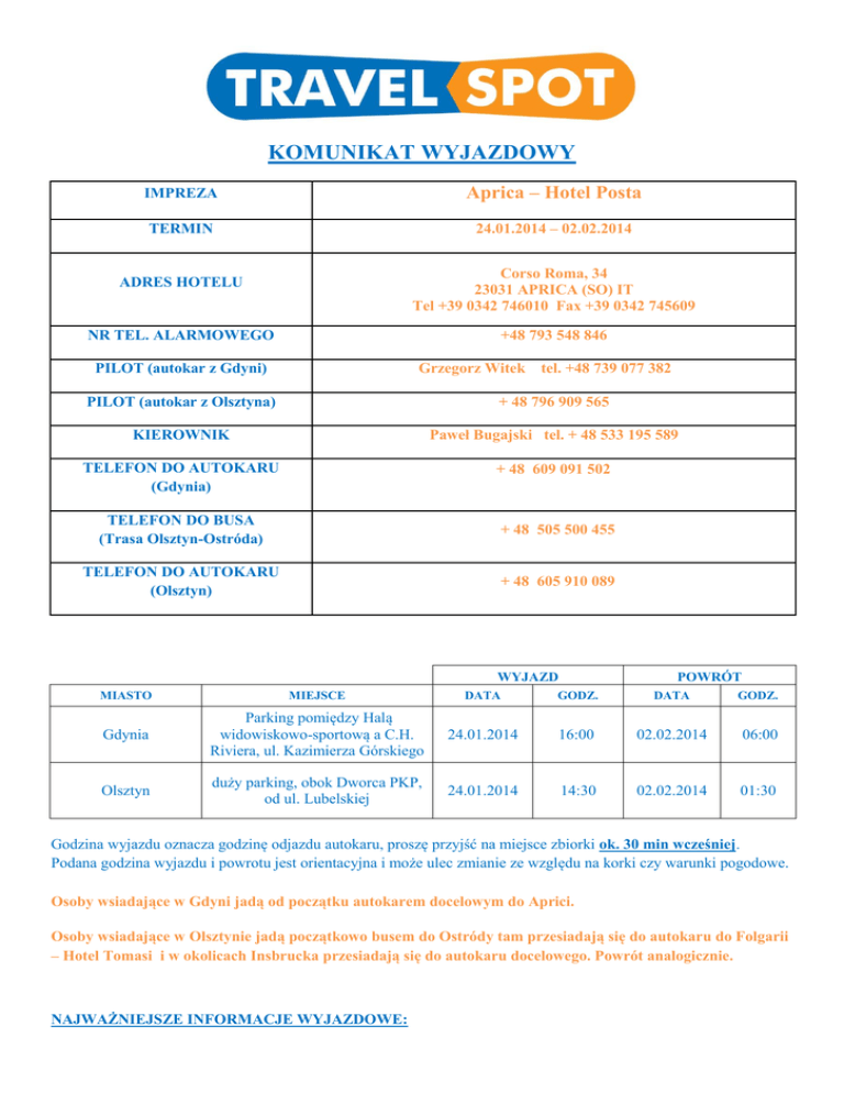 KOMUNIKAT WYJAZDOWY IMPREZA Aprica – Hotel Posta TERMIN 24.01.2014 – 02.02.2014 Corso Roma, 34 23031 APRICA (SO) IT Tel +39 0342 746010 Fax +39 0342 745609 ADRES HOTELU NR TEL. ALARMOWEGO +48 793 548 846 PILOT (autokar z Gdyni) Grzegorz Witek tel. +48 739 077 382 PILOT (autokar z Olsztyna) + 48 796 909 565 KIEROWNIK Paweł Bugajski tel. + 48 533 195 589 TELEFON DO AUTOKARU (Gdynia) + 48 609 091 502 TELEFON DO BUSA (Trasa Olsztyn-Ostróda) + 48 505 500 455 TELEFON DO AUTOKARU (Olsztyn) + 48 605 910 089 POWRÓT WYJAZD MIASTO MIEJSCE DATA GODZ. DATA GODZ. Gdynia Parking pomiędzy Halą widowiskowo-sportową a C.H. Riviera, ul. Kazimierza Górskiego 24.01.2014 16:00 02.02.2014 06:00 Olsztyn duży parking, obok Dworca PKP, od ul. Lubelskiej 24.01.2014 14:30 02.02.2014 01:30 Godzina wyjazdu oznacza godzinę odjazdu autokaru, proszę przyjść na miejsce zbiorki ok. 30 min wcześniej. Podana godzina wyjazdu i powrotu jest orientacyjna i może ulec zmianie ze względu na korki czy warunki pogodowe. Osoby wsiadające w Gdyni jadą od początku autokarem docelowym do Aprici. Osoby wsiadające w Olsztynie jadą początkowo busem do Ostródy tam przesiadają się do autokaru do Folgarii – Hotel Tomasi i w okolicach Insbrucka przesiadają się do autokaru docelowego. Powrót analogicznie. NAJWAŻNIEJSZE INFORMACJE WYJAZDOWE: - DOKUMENTY PODRÓŻY: każdy uczestnik wyjazdu powinien zabrać ze sobą umowę – zgłoszenie oraz koniecznie paszport lub dowód osobisty. Należy dopilnować aby podróżujące dziecko posiadało własny paszport lub inny dokument tożsamości. - BAGAŻ: Każdy uczestnik może zabrać ze sobą jeden bagaż główny (plecak bez stelaża zewnętrznego, walizkę lub torbę) o wadze do 20 kg, przy czym całkowita suma wymiarów (wys.+szer.+dł.) nie może przekroczyć 145 cm, plus jeden bagaż podręczny o wadze do 5 kg, który powinien być umieszczony pod fotelem pasażera, plus jedną parę nart lub deskę snowboardową, plus buty, zapakowane w pokrowcu. Ze względu na ograniczoną pojemność luków bagażowych organizator nie gwarantuje zabrania bagażu przekraczającego limit. - W AUTOKARZE: Nie prowadzimy rezerwacji miejsc w autokarze. Staramy się jednak zachować miejsca obok siebie dla osób wsiadających w jednym miejscu. Postoje autokaru organizowane są co około 4 godziny. Na większości postojów toalety są płatne (ok. 0,7 euro) - UBEZPIECZENIE: W zależności od wykupionego pakietu numery polis to: Ubezpieczenie podstawowe (zawarte w cenie wyjazdu) : 26105039 Zwiększone KL + OC wariant I : 26105040 Zwiększone KL + OC wariant II : 26105038 W przypadku wymagającym pomocy należy dzwonić pod niżej podany numer centrali alarmowej i podać swoje imię, nazwisko, numer polisy ubezpieczeniowej oraz kontaktowy numer telefonu: +48 22 505 15 95 Numer polisy a także numer centrali alarmowej znajdują się na kartach ubezpieczeniowych, które otrzymacie Państwo od kierownika wyjazdu. - KONTAKT: w dniu wyjazdu, na godzinę przed odjazdem i w trakcie przejazdu uruchomiony będzie telefon alarmowy (numer podany na górze komunikatu). Jest to numer obsługiwany przez pracownika B.T. Travelspot. Numer kierownika wyjazdu czynny będzie od 15:00 w dniu wyjazdu – 24.01.2014 do powrotu autokaru do Polski 02.02.2014. - SPÓŹNIENIA: organizator nie ponosi odpowiedzialności za niestawienie się uczestnika w miejscu zbiórki w określonym czasie. W przypadku problemów z dojazdem na miejsce zbiórki należy niezwłocznie kontaktować się dzwoniąc na numer tel. alarmowego. W razie jakichkolwiek pytań prosimy o kontakt z biurem. Życzymy udanego wyjazdu!