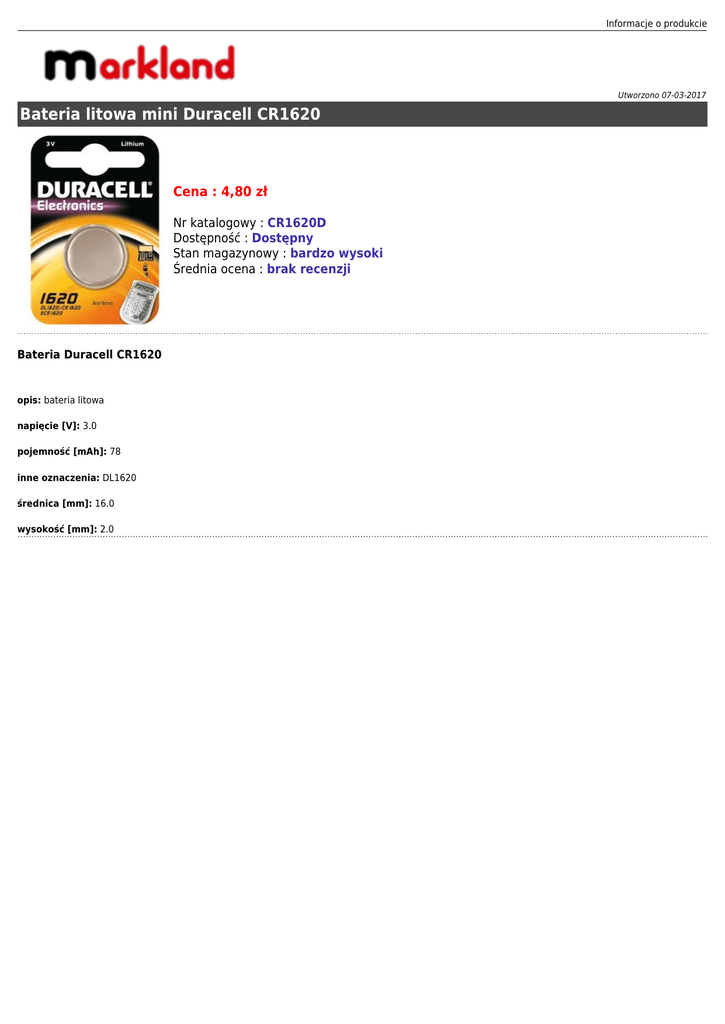 Informacje o produkcie Utworzono 07-03-2017 Bateria litowa mini Duracell CR1620 Cena : 4,80 zł Nr katalogowy : CR1620D Dostępność : Dostępny Stan magazynowy : bardzo wysoki Średnia ocena : brak recenzji Bateria Duracell CR1620 opis: bateria litowa napięcie [V]: 3.0 pojemność [mAh]: 78 inne oznaczenia: DL1620 średnica [mm]: 16.0 wysokość [mm]: 2.0