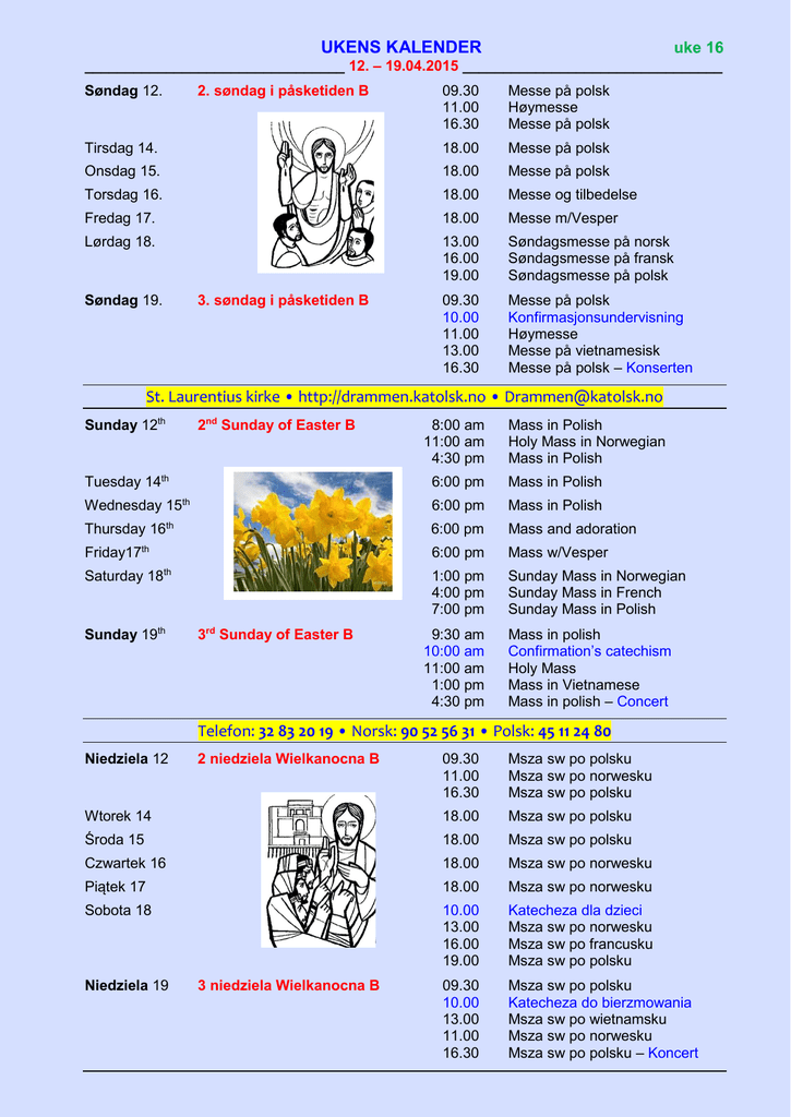 UKENS KALENDER uke 16 ________________________________ 12. – 19.04.2015 ________________________________ Søndag 12. 2. søndag i påsketiden B 09.30 11.00 16.30 Messe på polsk Høymesse Messe på polsk Tirsdag 14. 18.00 Messe på polsk Onsdag 15. 18.00 Messe på polsk Torsdag 16. 18.00 Messe og tilbedelse Fredag 17. 18.00 Messe m/Vesper Lørdag 18. 13.00 16.00 19.00 Søndagsmesse på norsk Søndagsmesse på fransk Søndagsmesse på polsk 09.30 10.00 11.00 13.00 16.30 Messe på polsk Konfirmasjonsundervisning Høymesse Messe på vietnamesisk Messe på polsk – Konserten Søndag 19. 3. søndag i påsketiden B St. Laurentius kirke • http://drammen.katolsk.no • [email protected] Sunday 12th 2nd Sunday of Easter B 8:00 am 11:00 am 4:30 pm Mass in Polish Holy Mass in Norwegian Mass in Polish Tuesday 14th 6:00 pm Mass in Polish Wednesday 15th 6:00 pm Mass in Polish Thursday 16 6:00 pm Mass and adoration Friday17th 6:00 pm Mass w/Vesper 1:00 pm 4:00 pm 7:00 pm Sunday Mass in Norwegian Sunday Mass in French Sunday Mass in Polish th Saturday 18 th Sunday 19th 3rd Sunday of Easter B 9:30 am 10:00 am 11:00 am 1:00 pm 4:30 pm Mass in polish Confirmation’s catechism Holy Mass Mass in Vietnamese Mass in polish – Concert Telefon: 32 83 20 19 • Norsk: 90 52 56 31 • Polsk: 45 11 24 80 Niedziela 12 09.30 11.00 16.30 Msza sw po polsku Msza sw po norwesku Msza sw po polsku Wtorek 14 18.00 Msza sw po polsku Środa 15 18.00 Msza sw po polsku Czwartek 16 18.00 Msza sw po norwesku Piątek 17 18.00 Msza sw po norwesku Sobota 18 10.00 13.00 16.00 19.00 Katecheza dla dzieci Msza sw po norwesku Msza sw po francusku Msza sw po polsku 09.30 10.00 13.00 11.00 16.30 Msza sw po polsku Katecheza do bierzmowania Msza sw po wietnamsku Msza sw po norwesku Msza sw po polsku – Koncert Niedziela 19 2 niedziela Wielkanocna B 3 niedziela Wielkanocna B