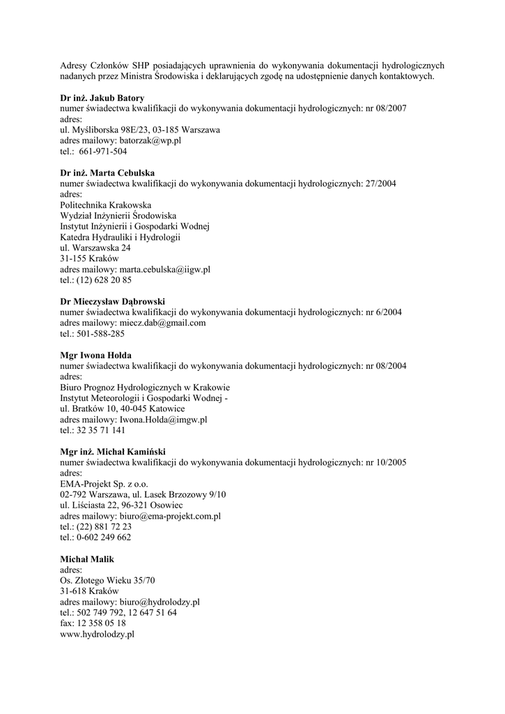 Adresy Członków SHP posiadających kwalifikacje hydrologiczne