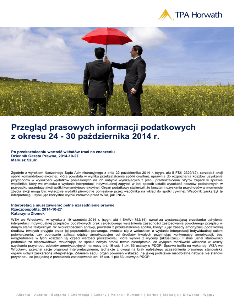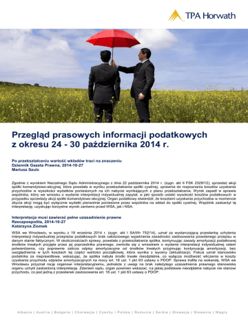 Przegląd prasowych informacji podatkowych z okresu 24 - 30 października 2014 r. Po przekształceniu wartość wkładów traci na znaczeniu Dziennik Gazeta Prawna, 2014-10-27 Mariusz Szulc Zgodnie z wyrokiem Naczelnego Sądu Administracyjnego z dnia 22 października 2014 r. (sygn. akt II FSK 2329/12), sprzedaż akcji spółki komandytowo-akcyjnej, która powstała w wyniku przekształcenia spółki cywilnej, uprawnia do rozpoznania kosztów uzyskania przychodów w wysokości wydatków poniesionych na ich nabycie wynikających z planu przekształcenia. Wyrok zapadł w sprawie wspólnika, który we wniosku o wydanie interpretacji indywidualnej zapytał, w jaki sposób ustalić wysokość kosztów podatkowych w przypadku sprzedaży akcji spółki komandytowo-akcyjnej. Organ podatkowy stwierdził, że kosztami uzyskania przychodów w momencie zbycia akcji mogą być wyłącznie wydatki pierwotnie poniesione przez wspólnika na wkład do spółki cywilnej. Wspólnik zaskarżył tę interpretację, uzyskując korzystne wyroki zarówno przed WSA, jak i NSA. Interpretacja musi zawierać pełne uzasadnienie prawne Rzeczpospolita, 2014-10-27 Katarzyna Ziomek WSA we Wrocławiu, w wyroku z 19 września 2014 r. (sygn. akt I SA/Wr 752/14), uznał za wystarczającą przesłankę uchylenia interpretacji indywidualnej przepisów podatkowych brak całościowego wyjaśnienia zasadności zastosowania powołanego przepisu w danym stanie faktycznym. W okolicznościach sprawy, powstała z przekształcenia spółka, kontynuując zasady amortyzacji podatkowej środków trwałych przyjęte przez jej poprzednika prawnego, zwróciła się z wnioskiem o wydanie interpretacji indywidualnej celem potwierdzenia, czy poprawnie zalicza odpisy amortyzacyjne od środków trwałych przyjmując kontynuację amortyzacji, bez uwzględnienia w tych kosztach tej części wartości początkowej, która wynika z wyceny (aktualizacji). Fiskus uznał stanowisko podatnika za nieprawidłowe, wskazując, że spółka nabyła środki trwałe nieodpłatnie, co wyłącza możliwość wliczenia w koszty uzyskania przychodu odpisów amortyzacyjnych na mocy art. 16 ust. 1 pkt 63 ustawy o PDOP. Sprawa trafiła na wokandę. WSA we Wrocławiu przyznał rację organowi interpretacyjnemu, jednakże z uwagi na brak należytego uzasadnienia prawnego stanowiska organu uchylił zaskarżoną interpretację. Zdaniem sądu, organ powinien wskazać, na jakiej podstawie nieodpłatne nabycie nie stanowi przychodu, co jest jedną z przesłanek zastosowania art. 16 ust. 1 pkt 63 ustawy o PDOP. Albania | Austria | Bułgaria | Chorwacja | Czechy | Polska | Rumunia | Serbia | Słowacja | Słowenia | Węgry Kontrakty odwrotne bez VAT Dziennik Gazeta Prawna, 2014-10-27 Katarzyna Rosik W wyroku z dnia 22 października 2014 r. (sygn. akt III SA/Wa 1320/14) Wojewódzki Sąd Administracyjny w Warszawie uznał, że kontrakty „wash-out”, zwane również „kontraktami odwrotnymi”, zawierane m.in. na rynku produktów rolnych, nie podlegają przepisom ustawy o VAT, ponieważ nie stanowią ani dostawy towarów ani świadczenia usług. Ich istota polega na tym, że jeśli dostawca zobowiązał się do dostarczenia nabywcy określonej ilości towaru po określonej cenie, lecz pewne okoliczności przeszkodziły mu w realizacji zobowiązania (np. mniejsze plony niż przewidywane), kontrakt „wash-out” niejako rekompensuje nabywcy różnicę pomiędzy zakontraktowaną kwotą a ceną rynkową towarów, które nabywca był zmuszony nabyć od innego dostawcy. Wyrok zapadł w sprawie spółki, która otrzymała negatywną interpretację indywidualną, uznającą takie kontrakty za podlegające przepisom ustawy o VAT. Spółka zaskarżyła interpretację, a WSA zgodził się ze spółką, że kwoty wypłacane w ramach kontraktów „wash-out” należy porównać do odszkodowania z tytułu strat, a zatem pozostają poza zakresem opodatkowania VAT. Projekty i rejestracja bez znaczenia dla opodatkowania Rzeczpospolita, 2014-10-28 Michał Roszkowski Zgodnie z wyrokiem WSA w Rzeszowie z 22 września 2014 r. (sygn. akt I SA/Rz 536/14) obowiązek podatkowy w PCC powstaje w momencie sporządzenia przez notariusza protokołu uchwały o przekształceniu lub łączeniu spółek oraz umów lub statutu spółki. Kanwą sporu była interpretacja podatkowa. Notariusz powziął wątpliwość, czy w związku ze spisaniem protokołu notarialnego z podjęcia uchwały o przekształceniu lub łączeniu spółek, w wyniku której zwiększeniu ulegnie majątek spółki osobowej lub kapitał zakładowy spółek osobowych lub kapitałowych, a następnie sporządzenia umowy lub statutu spółki przekształconej i przejmującej powstanie obowiązek obliczenia i pobrania PCC. W opinii organu interpretacyjnego, obowiązek taki powstanie w momencie sporządzenia aktu notarialnego zawierającego protokół uchwały o przekształceniu lub połączeniu spółek bądź akt notarialny zawierający umowę lub statut spółki. Sprawa trafiła na wokandę. Sąd uznając stanowisko organu podatkowego za prawidłowe, stwierdził, że momentem dokonania czynności cywilnoprawnej będzie zaprotokołowanie uchwały o przekształceniu lub połączeniu spółek oraz umów lub statutu. Zdaniem WSA bez znaczenia pozostaje data sporządzenia projektów przedmiotowych dokumentów lub rejestracji w Krajowym Rejestrze Sądowym. Nawet drobna faktura wystarczy do zwrotu VAT Dziennik Gazeta Prawna, 2014-10-28 Mariusz Szulc Wojewódzki Sąd Administracyjny w Gdańsku w wyroku z dnia 24 września 2014 r. (sygn. akt I Sa/Gd 889/14) wskazał, że zrealizowanie co najmniej jednej transakcji opodatkowanej w naszym kraju daje przedsiębiorcy zagranicznemu prawo do odliczenia VAT od zakupów dokonywanych w Polsce przez jego oddział. Wyrok zapadł w sprawie irlandzkiej spółki, która zarejestrowała oddział w Polsce, przy pomocy którego chciała świadczyć usługi księgowe. Od momentu rejestracji ponosiła koszty, natomiast p