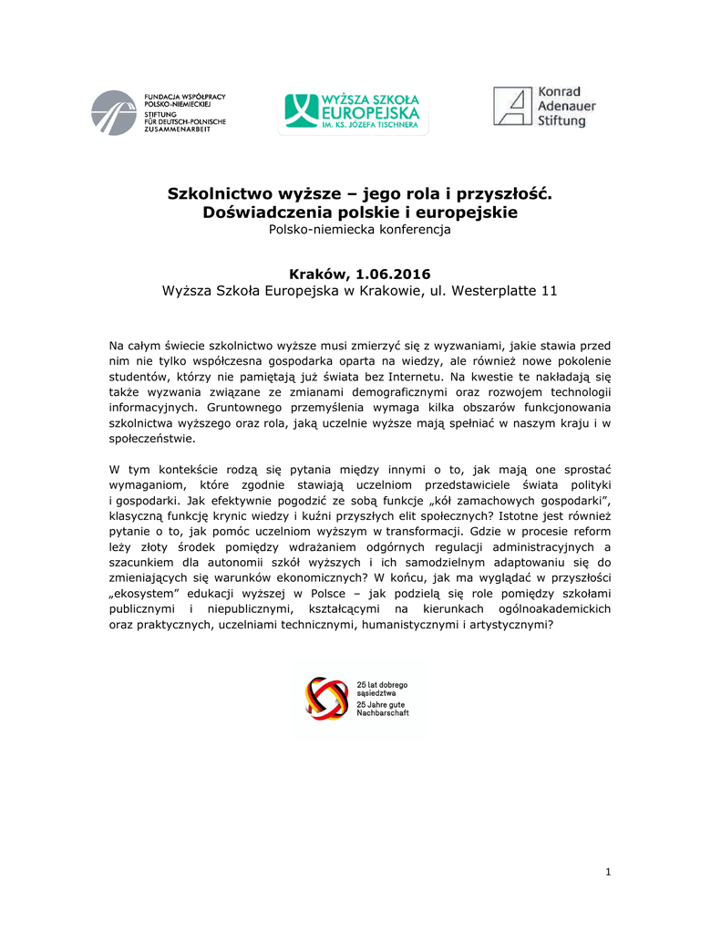 Szkolnictwo wyższe – jego rola i przyszłość. Doświadczenia polskie i europejskie Polsko-niemiecka konferencja Kraków, 1.06.2016 Wyższa Szkoła Europejska w Krakowie, ul. Westerplatte 11 Na całym świecie szkolnictwo wyższe musi zmierzyć się z wyzwaniami, jakie stawia przed nim nie tylko współczesna gospodarka oparta na wiedzy, ale również nowe pokolenie studentów, którzy nie pamiętają już świata bez Internetu. Na kwestie te nakładają się także wyzwania związane ze zmianami demograficznymi oraz rozwojem technologii informacyjnych. Gruntownego przemyślenia wymaga kilka obszarów funkcjonowania szkolnictwa wyższego oraz rola, jaką uczelnie wyższe mają spełniać w naszym kraju i w społeczeństwie. W tym kontekście rodzą się pytania między innymi o to, jak mają one sprostać wymaganiom, które zgodnie stawiają uczelniom przedstawiciele świata polityki i gospodarki. Jak efektywnie pogodzić ze sobą funkcje „kół zamachowych gospodarki”, klasyczną funkcję krynic wiedzy i kuźni przyszłych elit społecznych? Istotne jest również pytanie o to, jak pomóc uczelniom wyższym w transformacji. Gdzie w procesie reform leży złoty środek pomiędzy wdrażaniem odgórnych regulacji administracyjnych a szacunkiem dla autonomii szkół wyższych i ich samodzielnym adaptowaniu się do zmieniających się warunków ekonomicznych? W końcu, jak ma wyglądać w przyszłości „ekosystem” edukacji wyższej w Polsce – jak podzielą się role pomiędzy szkołami publicznymi i niepublicznymi, kształcącymi na kierunkach ogólnoakademickich oraz praktycznych, uczelniami technicznymi, humanistycznymi i artystycznymi? 1 08.30-09.00 Rejestracja 09.00-09.15 Otwarcie i wprowadzenie Prof. nadzw. dr hab. Piotr Kłodkowski, Rektor Wyższej Szkoły Europejskiej im. ks. Józefa Tischnera w Krakowie Dr Błażej Sajduk, Prorektor Wyższej Szkoły Europejskiej im. ks. Józefa Tischnera w Krakowie 09.15-10.00 Wystąpienie Dr Jarosław Gowin, Wicepremier, Minister Nauki i Szkolnictwa Wyższego 10.00-12.00 Dyskusja panelowa I Wyzwania stojące przed przyszłością szkół wyższych Prof. dr hab. Jarosław Górniak, Centrum Ewaluacji i Analiz Polityk Publicznych Uniwersytetu Jagiellońskiego Prof. dr hab. Jan Hartman, Uniwersytet Jagielloński Prof. dr hab. Tomasz Jasiński Uniwersytet Adama Mickiewicza w Poznaniu Prof. dr hab. Lorenz Peiffer, Gottfried Wilhelm Leibniz Universität Hannover Moderacja: Prof. nadzw. dr hab. Krzysztof Miszczak, Dyrektor Fundacji Współpracy Polsko-Niemieckiej 12.00-14.00 Lunch 14.00–16.00 Dyskusja panelowa II Rola szkół wyższych w gospodarce opartej na wiedzy Prof. dr hab. Witold Orłowski, Rektor Akademii Finansów i Biznesu Vistula Prof. dr hab. Arkadiusz Stempin, Albert-Ludwigs-Universität Freiburg, Wyższa Szkoła Europejska im. ks. Józefa Tischnera Prof. nadzw. dr hab. Robert Kozielski, Uniwersytet Łódzki Dr Jadwiga Emilewicz, Podsekretarz Stanu, Ministerstwo Rozwoju Dr Marcin Kędzierski, Ekspert Centrum Analiz Klubu Jagiellońskiego ds. edukacji Moderacja: Wojciech Przybylski, Prezes Zarządu Krakowskiego Parku Technologicznego 2 Koncepcja naukowa i koordynacja: Dr Błażej Sajduk, Wyższa Szkoła Europejska im. ks. Józefa Tischnera w Krakowie Prof. dr hab. Arkadiusz Stempin, Albert-Ludwigs-Universität Freiburg, Wyższa Szkoła Europejska im. ks. Józefa Tischnera w Krakowie Tel.: +48/661 505 494; e-mail: [email protected] Organizacja: Judyta Mutwil-Grodecka, Wyższa Szkoła Europejska im. ks. Józefa Tischnera w Krakowie Tel.: +48/12/683 24 82; e-mail: [email protected] Falk Altenberger, Konrad-Adenauer-Stiftung, Polen Tel.: +48/22/845 93 33 lub 30; e-mail: [email protected] 3