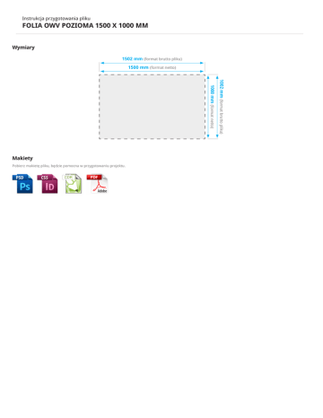 Instrukcja przygotowania pliku FOLIA OWV POZIOMA 1500 X 1000 MM Wymiary 1502 mm (format brutto pliku) 1500 mm (format netto) Pobierz makietę pliku, będzie pomocna w przygotowaniu projektu. 1002 mm (format brutto pliku) 1000 mm (format netto) Makiety Instrukcja przygotowania pliku FOLIA OWV PIONOWA 1000 X 1500 MM Wymiary 1002 mm (format brutto pliku) 1000 mm (format netto) Pobierz makietę pliku, będzie pomocna w przygotowaniu projektu. 1502 mm (format brutto pliku) 1500 mm (format netto) Makiety