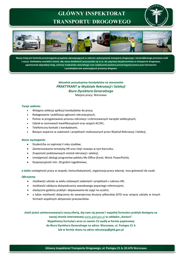 GŁÓWNY INSPEKTORAT TRANSPORTU DROGOWEGO Naszą misją jest kontrola przestrzegania przepisów obowiązujących w zakresie wykonywania transportu drogowego i niezarobkowego przewozu osób i rzeczy. Dokładamy wszelkich starań, aby nasza działalność przyczyniała się m.in. do: poprawy bezpieczeństwa w transporcie drogowym, ograniczenia degradacji dróg, ochrony środowiska naturalnego oraz zwiększenia poziomu przestrzegania prawa przez kierowców i przedsiębiorców wykonujących przewozy drogowe. Aktualnie poszukujemy kandydatów na stanowisko PRAKTYKANT w Wydziale Rekrutacji i Selekcji Biuro Dyrektora Generalnego Miejsce pracy: Warszawa Twoje zadania: Wstępna selekcja aplikacji kandydatów do pracy; Redagowanie i publikacja ogłoszeń rekrutacyjnych; Pomoc w przygotowaniu procesu rekrutacji i zróżnicowanych narzędzi selekcyjnych; Udział w rozmowach kwalifikacyjnych oraz sesjach AC/DC; Telefoniczny kontakt z kandydatami; Bieżące wsparcie w zadaniach i projektach realizowanych przez Wydział Rekrutacji i Selekcji. Nasze wymagania: Student/ka co najmniej II roku studiów; Zainteresowanie tematyką HR oraz chęć rozwoju w tym kierunku; Znajomość podstawowych metod rekrutacji i selekcji; Umiejętność obsługi programów pakietu Ms Office (Excel, Word, PowerPoint); Dyspozycyjność min. 20 godzin tygodniowo; a także umiejętność pracy w zespole, komunikatywność, organizacja pracy własnej oraz gotowość do nauki. Oferujemy: możliwość udziału w wielu ciekawych zadaniach i projektach z zakresu HR; możliwość zdobycia doświadczenia zawodowego popartego referencjami; elastyczne godziny praktyk i dopasowanie do zajęć na uczelni; a także możliwość dołączenia do wewnętrznej drużyny piłkarskiej GITD oraz wzięcia udziału w innych formach wspólnych aktywności pracowników. Jeżeli jesteś zainteresowany/a naszą ofertą, daj nam się poznać i wypełnij formularz praktyk dostępny na naszej stronie internetowej www.gitd.gov.pl w zakładce „Kariera”. Wypełniony formularz wraz ze swoim CV wyślij w formie papierowej do Biura Dyrektora Generalnego na adres: Warszawa, ul. Postępu 21 A lub w formie skanu na adres [email protected] Główny Inspektorat Transportu Drogowego, ul. Postępu 21 A, 02-676 Warszawa