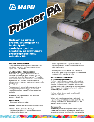 A P r e m i r P Gotowy do użycia środek gruntujący na bazie żywic syntetycznych w alkoholu, poprawiający przyczepność kleju Adesilex PA ZAKRES STOSOWANIA Gruntowanie podłoży wewnątrz budynku przed montażem parkietu i podłogi drewnianej przy użyciu kleju Adesilex PA. WŁAŚCIWOŚCI TECHNICZNE Primer PA jest szybkoschnącym środkiem gruntującym na bazie żywic syntetycznych z zawartością alkoholu. Niska lepkość Primer PA pozwala na doskonałe wchłanianie przez podłoże, a zawarty w nim alkohol, dzięki szybkiemu odparowaniu gwarantuje szybkie schnięcie środka gruntującego. Po odparowaniu alkoholu żywice syntetyczne tworzą powłokę wzmacniającą ewentualne pozostałości pyłów obecnych na powierzchni podłoża. Primer PA nie zawiera wody, jest środkiem gotowym do użycia. ZALECENIA • Stosować tylko wewnątrz. • Zaleca się nanoszenie w pomieszczeniu z otwartymi oknami, unikać źródeł zapłonu, nie palić papierosów. • Środek gruntujący powinien być całkowicie wchłonięty przez podłoże: unikać formowania się na powierzchni warstwy gruntu. WYTYCZNE STOSOWANIA Przygotowanie podłoża Podłoże musi być suche, czyste, odpowiednio równe, wytrzymałe i przeznaczone do montażu parkietu, pozbawione odprysków, resztek farb, wosków, olejów, rdzy, gipsu lub innych substancji, które mogłyby zmniejszyć wchłanianie środka Primer PA przez podłoże. Podłoża anhydrytowe należy zeszlifować i dokładnie odkurzyć. Wilgotność resztkowa podłoża musi mieć odpowiednią wartość do montażu parkietu: dla podłoży cementowych maksymalnie 2%, dla podłoży anhydrytowych 0,5%. • Primer PA stosować tylko na chłonne podłoża. • Primer PA nie jest kompatybilny z dwuskładnikowymi czy jednoskładnikowymi klejami poliuretanowymi. Nanoszenie Primer PA jest środkiem gotowym do użycia. Primer PA wymieszać dokładnie w pojemniku i nanosić za pomocą pędzla, wałka lub szpachlą. [sche2] 276 Polacco - 1 (PRIMER PA) (22.03.2005 - 2ª Bozza/Ciano Digitale/PDF/CD) A P r e m Pri DANE TECHNICZNE I WŁASNOŚCI PRODUKTU CHARAKTERYSTYKA PRODUKTU Konsystencja: płynna Kolor: czerwony Ciężar właściwy (g/cm3): 0,85 Zawartość ciał stałych (%): 10 Lepkość wg Brookfield’a (mPa•s): 30 Przechowywanie: 24 miesiące Szkodliwość wg normy 99/45/CE: tak. Produkt wysoce łatwopalny. Przed użyciem zapoznać się z punktem “Środki bezpieczeństwa” na opakowaniu i w karcie bezpieczeństwa Kod celny: 3208 90 91 PARAMETRY UŻYTKOWE ZAPRAWY Temperatura nanoszenia: od +10°C do +35°C Rozcieńczenie: nie potrzebne. Produkt gotowy do użycia Czas oczekiwania przed klejeniem parkietu: kiedy powierzchnia jest sucha i nie czuć już rozpuszczalnika (przynajmniej po 20-30 minutach) Przed nałożeniem kleju odczekać do odparowania alkoholu ze środka gruntującego Primer PA (przynajmniej 20-30 minut). Czyszczenie Narzędzia i pojemniki można łatwo umyć przy pomocy alkoholu. OPAKOWANIA Primer PA jest dostępny w puszkach 10 kg. PRZECHOWYWANIE Primer PA może być przechowywany przez 24 miesiące w oryginalnie zamkniętych opakowaniach i w suchym miejscu. WSKAZÓWKI DOTYCZĄCE BEZPIECZEŃSTWA PRACY Produkt zawiera łatwopalne alkohole. Nie przechowywać w pobliżu źródeł zapłonu. Nie palić tytoniu i unikać wdychania oparów. Unikać kontaktu ze skórą podczas nakładania kleju, stosować rękawiczki i odzież ochronną. Zaleca się stosowanie w miejscach dobrze wietrzonych. Przed użyciem zapoznać się z informacjami zawartymi w karcie bezpieczeństwa produktu. PRODUKT DLA PROFESJONALISTÓW. UWAGI Powyższe dane 10 należy traktować wyłącznie jako ogólne wskazówki. Niezależne od nas warunki pracy i różnorodność materiałów wykluczają jakiekolwiek roszczenia wynikające z tych danych. W przypadku wątpliwości zalecane jest przeprowadzenie badań własnych. MAPEI udziela gwarancji jedynie co do nie zmienionej jakości swoich produktów. Referencje produktu są dostępne na życzenie Przetwarzanie, powielanie, kopiowanie zamieszczonych w tej ulotce materiałów jest zabronione.La ri (PL) A.G. BETA A P r e m Pri ® ŚWIATOWY PARTNER W BUDOWNICTWIE CERTIQUALITY No. 250 CERTIQUALITY No. 6853 CERTIQUALITY No. 1517 QMI No. 004157 MAPEI FRANCE MAPEI INC - CANADA CERTIQUALITY No. 3358 ITC No. 03 0063 SJ MAPEI FAR EAST Pte Ltd MAPEI MALAYSIA SDN BHD MAPEI s.r.o.- CZECH REP. MAPEI S.p.A. - ITALY MAPEI CORP - U.S.A. DNV No. 94-OSL-AQ-6236 DNV No. 12026-2002 AQ-BUD-TGA IRAM No. AR-QS-688 CERTIQUALITY No. 5776 MAPEI Kft. - HUNGARY MAPEI ARGENTINA S.A. MAPEI SUISSE SA RESCON MAPEI AS - NORWAY www.mapei.com 276-3-2005 CERTYFIKATY GRUPY MAPEI (Jakości, Środowiska i Bezpieczeństwa)