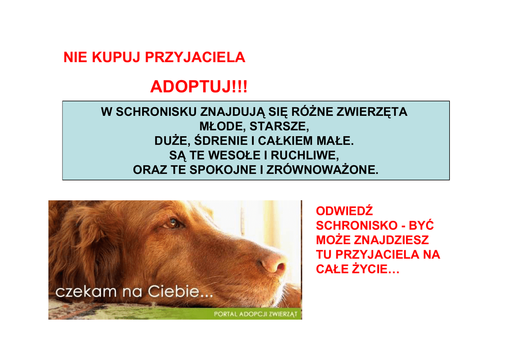 NIE KUPUJ PRZYJACIELA ADOPTUJ!!! W SCHRONISKU ZNAJDUJĄ SIĘ RÓŻNE ZWIERZĘTA MŁODE, STARSZE, DUŻE, ŚDRENIE I CAŁKIEM MAŁE. SĄ TE WESOŁE I RUCHLIWE, ORAZ TE SPOKOJNE I ZRÓWNOWAŻONE. ODWIEDŹ SCHRONISKO - BYĆ MOŻE ZNAJDZIESZ TU PRZYJACIELA NA CAŁE ŻYCIE… SZCZENIAKI DO ADOPCJI PONIŻSZA PREZENTACJA ZAWIERA ZDJĘCIA I OPISY SZCZENIACZKÓW, KTÓRE MOŻNA AODPTOWAĆ W TORUŃSKIM SCHRONISKU Pies poz. 89/11 płeć: pies wiek: 10 miesięcy rasa: mieszaniec boks: 50 numer: 275 opis: Młoda, bardzo energiczna psina. Mimo swojego wieku, jest bardzo grzeczny i posłuszny. Bardzo domaga się kontaktu, głaskania i zabawy. Toleruje inne psy, może zamieszkać w domu, gdzie jest już pies. Pies poz. 33/szcz płeć: pies wiek: 3 miesiące rasa: mieszaniec boks: 56 numer: 83 Ta mała, pocieszna psina została wyrzucona z domu jako dwumiesięczny szczeniak. Znaleźliśmy ją błąkającą się po Podgórzu. Jest rezolutnym i energicznym psiakiem. Może znajdzie się ktoś, kto odmieni jego los. Ten młody psiak został znaleziony przy trasie Toruń- Bydgoszcz. Musiał wiele przejść, jest bowiem trochę nieufny. Potrzebuje więcej czasu, by przyzwyczaić się do opiekuna. Jeśli jednak znajdzie się ktoś, kto z cierpliwością poświęci mu swój czas, zyska najwierniejszego przyjaciela. Pies poz. 29/szcz płeć: pies wiek: 8 miesięcy rasa: mieszaniec boks: 37 numer: 54 Tego młodego psiaka znaleźli studenci nocą w największe mrozy. Przeżył wypadek komunikacyjny lub był brutalnie potraktowany przez właściciela, ma bowiem bardzo szpetnie i krzywo zrośniętą przednią łapę. Czeka go operacja, której podjął się najlepszy toruński specjalista. Pilnie szukamy domu, również tymczasowego, by psiak po operacji mógł mieć zapewnioną opiekę. Pies poz. 35/11 płeć: pies wiek: 11 miesięcy rasa: mieszaniec boks: 50 numer: 19 Nie znamy przeszłości tego pieska, ale najprawdopodobniej przeszedł już wiele. Jest lękliwy, boi się wyciągniętej ręki. Przy psiakach "rozkręca się", bawi, dokazuje, szaleje. Gdy tylko pojawi się opiekun, psiak tuli się w kącie. Powoli zaczyna nabierać do nas zaufania, ale wymaga to czasu i cierpliwości. Szukamy dla niego osoby, która przywróci mu wiarę w człowieka. Pies poz. 49/szcz płeć: pies wiek: 4 miesiące rasa: mieszaniec boks: 56 numer: 175 Ten wesoły i ciekawski psiak trafił do schroniska w grudniu 2010 roku. Z początku był trochę wystraszony i wylękniony, ale bardzo szybko przyzwyczaił się do nowej sytuacji. Jest bardzo inteligentny, karny i rezolutny. Lubi ciekawe zabawy, szybko uczy się komend. Sprawi z pewnością wiele radości. Pies poz. 218/szcz płeć: pies wiek: 10 miesięcy rasa: mieszaniec boks: 44 numer: 291 Właścicielka Buni oddała ją znajomej pod czasową opiekę i już po nią nie wróciła. Bunia to bardzo kontaktowa i zaczepna suczka. Jest grzeczna i bardzo czysta, może zamieszkać w mieszkaniu. Świetny towarzysz zabaw dla całej rodziny. Bunia poz. 1081/10 płeć: suka wiek: 11 miesięcy rasa: mieszaniec boks: 9 numer: 94 Ta sympatyczna sunia to wulkan energii. Jest straszną przylepą. Trochę niezdarną, ale bardzo pocieszną. Nowy właściciel musi zapewnić jej odpowiednią dawkę ruchu i zabawy. Z pewnością sprawi rodzinie wiele radości. Suczka poz. 24/szcz płeć: suka wiek: 4 miesiące rasa: mieszaniec boks: 37 numer: 276 JEŚLI SZUKASZ CZWORONOŻNEGO PRZYJACIELA, PAMIETAJ ŻE W SCHRONISKU JEST MNÓSTWO ZWIERZĄT KTÓRE CZEKAJĄ WŁAŚNIE NA CIEBIE!!!