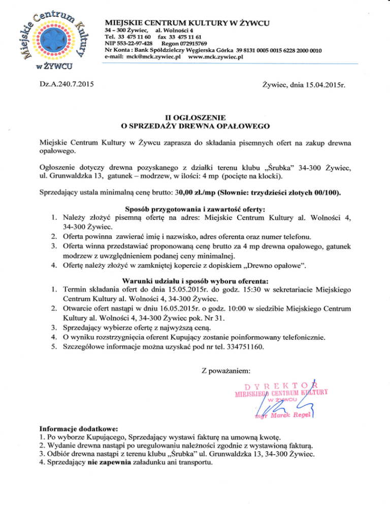 MIEISKIE CENTRUM KULTURY W ZYV1iCU - M Żywiec, al. Wolności4 34 Tel. 33 4751160 fax 33 4751161 NIP55}22_97428 Regonf72915769 Nr Konta: Bank Spółdńelczy Węgierska Górka 39 8131 e-maik [email protected] www.mck.zywiec.pl 0005 0015 6228 20m 0010 WŻnpeu Dz.A.240.7.2015 Zywiec, dnia 1 5.04. żaI 5r. II OGŁOSZENIE O SPRZED XŻV DREWNA OPAŁOWEGO Miejskie Centrum Kulfury w Żywcu żaprasza do składania pi§emnych ofert na zakw drewna opałowego. Ogłoszenie dotyczy drewna pozyskanego ul. Grunwaldzka13, gatunek z działlą terenu klubu ,,Śrubka" 34-300 Żywiec, - modrzęw, w ilości: 4 mp (pocięte na klocki). Sprzedający u§tala minimalną cenę brutto: 30,00 ńJmp (Slownie: trrydzieści ztoĘch 00/100). Sposób przygotowania i zawartośćoferty: 1. Nale:f złoĘćpisemną ofertę na adr§§: Miejskie Centrum Kultury al. Wolności4, 34-300 Zywiec. ż. Oferta powinna zańerać imię i nazwisko, adres oferenta araz nrrmer telefonu. 3. Oferta winna przedstawiać proponowaną cenę brutto za 4 mp drewna opałowego, gafunek modrzęw z uwzględnieniem podanej ceny minimalnej. 4. Ofertę należy ńoĘó w zamkniętej kopercie z dopiskiem ,,Drewno opałowe". Warunki udziału i sposób wyboru oferenta: 1. Termin składania ofert do dnia 15.05.2015r. do godz. 15:30 w sekretariacie Miejskiego Centrum Kultury al. Wolności4,344a0 Żywec. 2. Otwarcie ofert nasĘli w dniu 16.05.2015r. o godz. 10:00 w siedzibie Miejskiego Centrum Kuttury al. Wolności4,343a0 Zywiec pok. Nr 31. Sprzedający wybierze ofertę znajwyższą ceną. O wyniku tozstrzygńęcia oferent Kupujący zostanie poinformowany telęfonicznie. 5. Szczegółowe informacje moalauzyskać pod nr tel. 334751160. 3. 4. Zpoważariem: D Y R li I( T oń__. c E;\ T tttj[t łtprunt l w żY\tJcu ,/ lunTsrrincrn l{,^K,l Informacje dodatkowe: 1. Po wyborze Kupującego, Sprzedający wystawi fakturę na rrmowną kwotę. 2. Wydarrie drewna nasĘpi po uregulowaniu należnościzgodnie z wystawioną fakturą. 3- Odbiór drełvna nastąli z terenu klubu,,Śrubka" ul. Grunwaldzkal3,34-3}} Żywiec. 4. Sprzedający nie zapewnia załadunku ani transportu.