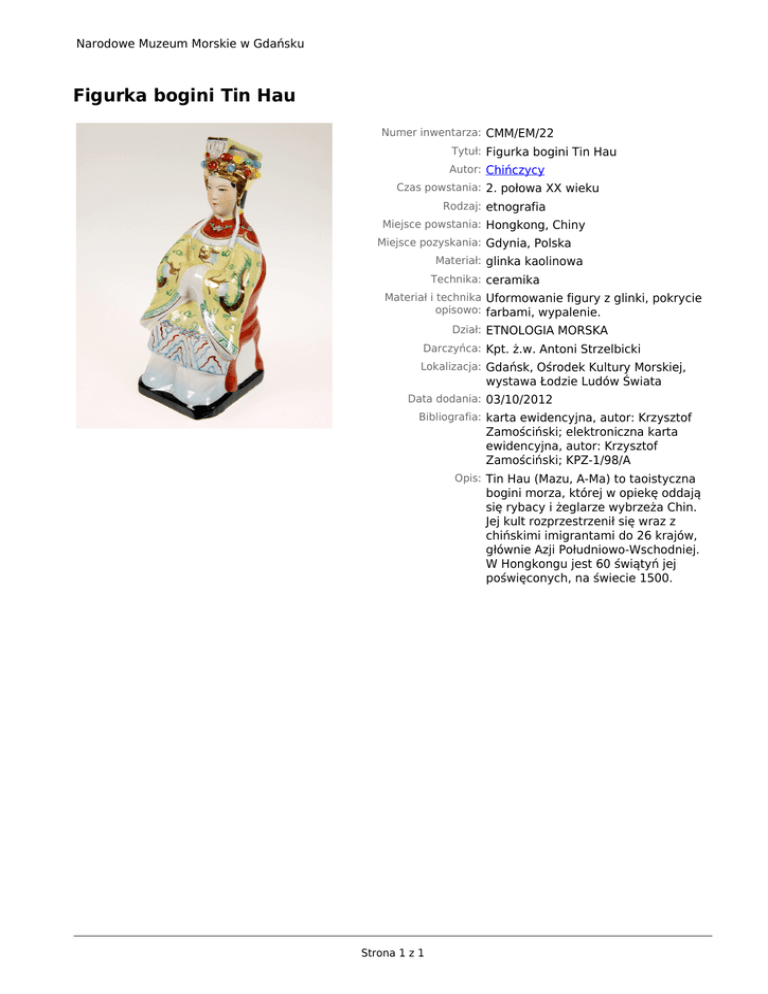 Narodowe Muzeum Morskie w Gdańsku Figurka bogini Tin Hau Numer inwentarza: CMM/EM/22 Tytuł: Figurka bogini Tin Hau Autor: Chińczycy Czas powstania: 2. połowa XX wieku Rodzaj: etnografia Miejsce powstania: Hongkong, Chiny Miejsce pozyskania: Gdynia, Polska Materiał: glinka kaolinowa Technika: ceramika Materiał i technika Uformowanie figury z glinki, pokrycie opisowo: farbami, wypalenie. Dział: ETNOLOGIA MORSKA Darczyńca: Kpt. ż.w. Antoni Strzelbicki Lokalizacja: Gdańsk, Ośrodek Kultury Morskiej, wystawa Łodzie Ludów Świata Data dodania: 03/10/2012 Bibliografia: karta ewidencyjna, autor: Krzysztof Zamościński; elektroniczna karta ewidencyjna, autor: Krzysztof Zamościński; KPZ-1/98/A Opis: Tin Hau (Mazu, A-Ma) to taoistyczna bogini morza, której w opiekę oddają się rybacy i żeglarze wybrzeża Chin. Jej kult rozprzestrzenił się wraz z chińskimi imigrantami do 26 krajów, głównie Azji Południowo-Wschodniej. W Hongkongu jest 60 świątyń jej poświęconych, na świecie 1500. Strona 1 z 1
