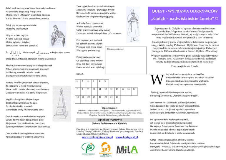 Skłoń wędrowcze głowę przed tym świętym Janem Na puławską drogę nogi niosą same. Mijasz z lewej „Michałki” dość starą dzielnicę Stał tu dworek i szkoła, przedszkole, piwnice. Niby nic – taka zagroda A różne cudeńka chowa Można oglądać, dotykać, dziwacznymi rowerami pomykać _ 2 15 5 QUEST - WYPRAWA ODKRYWCÓW „Gołąb – nadwiślańskie Loreto” © Jeśli cały Quest rozwiązałeś Ważne hasło już poznałeś Spójrz jeszcze na lewą ulicy stronę Zobaczysz wśród zielonych liter „o” czerwone. Dalej, gdy się acan przemieścisz Muzealny szyld ujrzysz To _ Tworzą jakoby okno przez które turysto Zobaczysz łabędzie – pływające bystro Bo ta nasza Gruszka ma przyjazne wody, Gdzie piękne łabędzie odbywają gody. _ Nietypowych _ _ _ _ _ _ w kraju całym znane 13 przez dzieci, młodzież, starszych mocno uwielbiane Akrobacji rowerowych syty oraz niespodzianek Zobacz jeszcze kolekcję opakowań szklanych Na likwory, nalewki, miody i araki Z całego świata kształty i przeróżne smaki. Kustosz Józef Majewski tak bardzo się stara, Że zobaczysz u niego wyroby kowala Wiele rzeźb i ozdób, obrazów, starych rzeczy Ciekawe to miejsce, nikt temu nie przeczy. Pod napisem jest budynek Na półkach dużo tu szynek Przestąp jego niskie progi Wyciągając prężnie nogi Gruszka rzeka stara od wieków tu płynie Dawne koryto Wisły dziś porasta, ginie Ale jeszcze choć ptaki miłe tu mieszkają Śpiewnym trelem i ćwierkaniem życie umilają Dwa młode drzewa splecione w uścisku Rosną nieopodal w wodnym uroczysku Gołąb położony jest w województwie lubelskim, na prawym brzegu Wisły między Puławami i Dęblinem. Dojechać tu można bezpośrednio autobusem komunikacji miejskiej z Puław lub pociągiem, PKS-em albo busem z Puław, Dęblina i Warszawy. Miejsce na pieczęć: Wyprawa zaczyna się na rynku, przy kościele parafialnym pw. św. Floriana i św. Katarzyny. Podczas wędrówki zadaniem turysty będzie ułożenie hasła z ukrytych na trasie liter. Podaj hasło szynkarzowi On spod lady skarb wyłowi Choć żeś dalej człek ubogi Pakiet wrażeń wart był drogi Czas przejścia: ok. 1 godz. HASŁO: 1 2 3 4 5 6 7 8 9 10 11 12 18 Wyjdź za furtę Pana Majewskiego Bież ku Wiśle 20 kroków Kolego Po obydwu traktu stronach Starorzecze Wisły zwane Gruszką kona Zapraszamy do Gołębia na spacer z hetmanem Stefanem Czarnieckim. Wyprawa po skarb umożliwi poznanie miejscowości o 1000-letniej historii, jej wyjątkowych zabytków oraz wydarzeń i postaci związanych z tym miejscem. 19 20 21 22 23 13 24 14 15 16 17 25 Opracowanie: Wiesława Dobrowolska-Łuszczyńska, Dorota Jabłońska, Agnieszka Kozak, Dariusz Lipka, Sławomir Łowczak, Józef Konstanty Majewski, Jarosław Osiak, Zbigniew Pacholik, Sabina Seroczyńska-Kozuba, Opiekun wyprawy: Szkoła Podstawowa w Gołębiu Questing jest rozwijany na Bursztynowym Szlaku Greenways przez Lokalną Grupę Działania „Zielony Pierścień” przy wsparciu Fundacji Miejsc i Ludzi Aktywnych MiLA www.zielonypierscien.pl W itaj wędrowcze spragniony zachwytów Nadwiślańskie Loreto – perła wszelkich szczytów Uniesień i zadziwień czeka na Cię w chwale. Historii starej karty poznasz tu wspaniałe. Fantazji, wyobraźni śmiało popuść wodze, Bo opiekę sprawuje tu „Patronka ludzi w drodze”. Jam hetman jest Czarniecki, dziś twój cicerone, Co ze Szwedem bój toczył po Wisły prawej stronie. Jestem rycerz, o boju najchętniej rozprawiam Szczęku oręża, skrzydłach husarskich. Namawiam, By z pamiętników Paskowych wyłowić, Jak ciężko było braci szlachciców sposobić Na wojnę z Tatarzynem, Szwedem czy Rusinem. Prawie nie zsiadać z konia, popasać po lasach Zapomnieć na dni długie o wielu wywczasach. www.bestquest.pl Gołąb – miejsce szczególne, obfite w talenta I rozum wielu ludzi. Dziatwa tu pamięta imiona znaczne: Dantyszka i Hozjusza, króla Korybuta, Kossaków familiję i Ossolińskiego, A dziś także konstruktora, Józia Majewskiego. Chroniąc głowę od chaosu albo od frasunku, Rozpocznij więc turysto wędrówkę od rynku Co jest sercem miejscowości, kształtem dziwi człeka Więc wnikliwie obserwuj. Twa przygoda czeka. Stań przed murem okalającym kościół po zachodniej stronie Przed nim znajdziesz obelisk i orła w koronie Co ma _ i skrzydło postrzelone z sowieckiej pepeszy 22 16 11 bo swym dumnym widokiem najeźdźcę złościł i peszył. Odszukaj słowa bohaterom dedykowane W obecności Marszałka w 1930 r. uroczyście odczytane Choć dzieło było jeszcze nie skończone Przy samym Piłsudskim zostało poświęcone Obejdź wkoło obelisk i sprawdź z drugiej strony Kiedy tak naprawdę został ukończony (Zanotuj z daty dwie cyfry ostatnie Wpisz je słowami w pustych polach poniżej A na końcu wyprawy hasło odgadniesz) __ _ 7 __ 4 20 _ 1 12 24 ___ 8 Za spółdzielnią skręcisz w lewo, Nie wpadnij przy tym na drzewo Idź prosto, śladami uczniów wesołych, Trafisz wprost do zadedykowanej mi szkoły. Skręć teraz w prawo na południe Tam Dom Świętej Rodziny wyłania się cudnie Zupełnie jak w Loreto poczujesz się z nagła Identyczna budowla we Włoszech osiadła. Ta szkoła nosi moje sławne w świecie imię, Dzięki temu ono przetrwa i nie zginie Jak wiesz, jestem Stefan Czarniecki Hetman wielki i waleczny Podejdź bliżej do jednego z pięknych wejść od frontu przywitają Cię dwaj święci w niebiańskim rynsztunku Zobacz, jakie są atrybuty odźwiernego niebieskiego I czym pozbawiono życia drugiego świętego? Oglądasz _ Przed wiekami tu walczyłem Z innowiercą Szwedem się biłem Choć za Wieprz się wycofałem Wroga dotkliwie wciąż nękałem _ Loretański 17 Przed wiekami i teraz - Dom Pański Ma masywne i podwójne, dość wysokie ściany Na oryginale spod Ankony włoskiej wzorowany A taktykę moją autorską, nową Zwano odtąd wojną podjazdową Sześć posągów patrzy na Ciebie z wysoka Być może wygląda śladów zaginionego proroka Cz