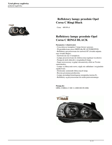 Tytuł główny nagłówka podtytuł nagłówka Reflektory lampy przednie Opel Corsa C Ringi Black Cena: 489.99 zł Reflektory lampy przednie Opel Corsa C RINGI BLACK Parametry i właściwości: - Cena dotyczy kompletu 2 lamp (lewej i prawej). - Wyprodukowane przez DEPO dla FK AUTOMOTIVE. - Reflektory przystosowane do żarówek H7 (światła mijania oraz światła długie). - Żarówek nie ma w komplecie. - Lampy przystosowane do elektrycznej regulacji wysokości. - Pasują do nich silniczki z oryginalnych lamp. - Super-nowoczesny wygląd, niesamowity efekt na Twoim samochodzie. - Lampy są fabrycznie nowe, nigdy nie zakładane i oryginalnie zapakowane. - Doskonały zamiennik fabrycznych lamp. - Roczna gwarancja producenta. - Lampy posiadają homologację europejską (norma E). - Reflektory są przystosowane do ruchu prawostronnego. Pasują do: OPEL CORSA C OD 11.2000 DO 09.2006 1/2 Tytuł główny nagłówka podtytuł nagłówka 2/2 Powered by TCPDF (www.tcpdf.org)