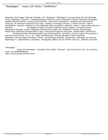 Związek Ukraińców w Polsce "Nostalgia" - nowy CD Chóru "ZURAWLI" Ukraiński Chór Męski "Żurawli" – CD "Nostalgia" "Nostalgia" to trzecia płyta CD Ukraińskiego Chóru męskiego "Żurawli". Zaprezentowane utwory to perły ukraińskiej muzyki chóralnej ukazujące bogatą historię Ukrainy, obrazy jej przeszłości. Motywem przewodnim wydania jest tęsknota za ojczyzną. W utworach wspomina się czasy wielkiej i kwitnącej Ukrainy, a także niewoli i walki o wyzwolenie ojczyzny. Słychać w nich oddźwięk sławy kozaków i żołnierzy, którzy przez wieki walczyli o wolność. Szczególne miejsce na płycie zajmują utwory oparte na poezji Tarasa Szewczenki – poety mającego przeogromny wpływ na tożsamość narodu ukraińskiego. Niezliczone pokolenia odnajdywały w jego twórczości bogactwo duchowe, wielkie idee i patriotyzm. Muzykę do pieśni skomponowali znani kompozytorzy ukraińscy, twórcy kultury muzycznej w patriotycznym duchu, m.in.: ks. Sydir Worobkewycz, Kyryło Stecenko, Iwan Łewyćkyj. Repertuar odzwierciedla charakter narodu ukraińskiego – odważnego i silŹnego, ale również łagodnego w usposobieniu, wesołego, umiejącego zdobyć się na wielkie uczucia i oddanie ojczyźnie. "Nostalgia" płyta CD "Nostalgia", Ukraiński Chór Męski "Żurawli", czas trwania 40 min, 12 utworów; cena: 30 złZAMÓWIENIA: http://tyrsa.pl/zamowienia.html http://www.zup.ukraina.com.pl Kreator PDF Utworzono 7 March, 2017, 19:12