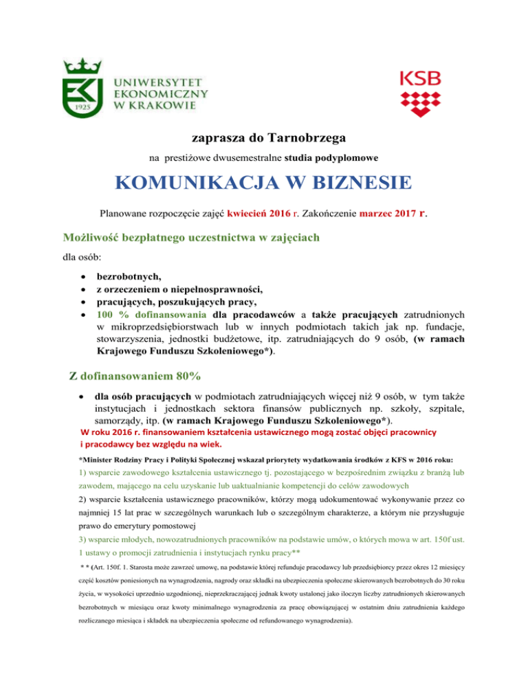 zaprasza do Tarnobrzega na prestiżowe dwusemestralne studia podyplomowe KOMUNIKACJA W BIZNESIE Planowane rozpoczęcie zajęć kwiecień 2016 r. Zakończenie marzec 2017 r. Możliwość bezpłatnego uczestnictwa w zajęciach dla osób: bezrobotnych, z orzeczeniem o niepełnosprawności, pracujących, poszukujących pracy, 100 % dofinansowania dla pracodawców a także pracujących zatrudnionych w mikroprzedsiębiorstwach lub w innych podmiotach takich jak np. fundacje, stowarzyszenia, jednostki budżetowe, itp. zatrudniających do 9 osób, (w ramach Krajowego Funduszu Szkoleniowego*). Z dofinansowaniem 80% dla osób pracujących w podmiotach zatrudniających więcej niż 9 osób, w tym także instytucjach i jednostkach sektora finansów publicznych np. szkoły, szpitale, samorządy, itp. (w ramach Krajowego Funduszu Szkoleniowego*). W roku 2016 r. finansowaniem kształcenia ustawicznego mogą zostać objęci pracownicy i pracodawcy bez względu na wiek. *Minister Rodziny Pracy i Polityki Społecznej wskazał priorytety wydatkowania środków z KFS w 2016 roku: 1) wsparcie zawodowego kształcenia ustawicznego tj. pozostającego w bezpośrednim związku z branżą lub zawodem, mającego na celu uzyskanie lub uaktualnianie kompetencji do celów zawodowych 2) wsparcie kształcenia ustawicznego pracowników, którzy mogą udokumentować wykonywanie przez co najmniej 15 lat prac w szczególnych warunkach lub o szczególnym charakterze, a którym nie przysługuje prawo do emerytury pomostowej 3) wsparcie młodych, nowozatrudnionych pracowników na podstawie umów, o których mowa w art. 150f ust. 1 ustawy o promocji zatrudnienia i instytucjach rynku pracy** * * (Art. 150f. 1. Starosta może zawrzeć umowę, na podstawie której refunduje pracodawcy lub przedsiębiorcy przez okres 12 miesięcy część kosztów poniesionych na wynagrodzenia, nagrody oraz składki na ubezpieczenia społeczne skierowanych bezrobotnych do 30 roku życia, w wysokości uprzednio uzgodnionej, nieprzekraczającej jednak kwoty ustalonej jako iloczyn liczby zatrudnionych skierowanych bezrobotnych w miesiącu oraz kwoty minimalnego wynagrodzenia za pracę obowiązującej w ostatnim dniu zatrudnienia każdego rozliczanego miesiąca i składek na ubezpieczenia społeczne od refundowanego wynagrodzenia). Dofinansowanie dla MŚP w Podkarpaciu w ramach Działania 7.5 RPO WP 2014-2020. samozatrudnieni oraz mikroprzedsiębiorstwa 70% (1-9 osób zatrudnionych) małe przedsiębiorstwa 60% (10-50 osób zatrudnionych) średnie przedsiębiorstwa 50% (51-250 osób zatrudnionych) dodatkowa preferencja 10% dla osób lub przedsiębiorstw spełniających jeden z poniższych warunków; (osoba w wieku powyżej 50 r. życia oraz osoby o niskich kwalifikacjach) oraz przedsiębiorstwa wysokiego wzrostu (generujących w ostatnich latach stały wzrost zatrudnienia oraz obrotów). Cel studiów Celem studiów jest przekazanie wiedzy oraz umiejętności w zakresie technik komunikacji, wywierania wpływu na jednostki i grupy, budowania autorytetu zarówno w kontaktach z partnerem zewnętrznym - Klientem jak i współpracownikami wewnątrz organizacji. Uczestnicy zapoznają się i przećwiczą kluczowe elementy komunikacji interpersonalnej wpływającej na jakość relacji biznesowych oraz na efekty codziennej pracy, Absolwenci uzyskają praktyczne umiejętności w zakresie wykorzystania reguł i narzędzi wywierania wpływu na ludzi w biznesie, stosowania wybranych technik NLP w komunikacji biznesowej, wykorzystania reguł, zasad oraz standardów komunikacji w biznesie. Profil słuchacza: absolwenci wyższych uczelni kadra zarządzające i specjalistyczna w firmie osoby odpowiedzialne za proces komunikacji w firmie osoby wykorzystujące zasady sprawnej komunikacji zarówno w procesie sprzedaży, jak i w negocjacjach i rozwiązywaniu konfliktów. Studia realizowane są we współpracy z firma szkoleniowo doradczą Brainstorm. Więcej informacji o firmie znajdziesz na www.brainstorm.biz.pl. Blok I – Wyzwania współczesnego rynku Rynek wysokiej konkurencyjności. Celem zajęć będzie wprowadzenie uczestników w zagadnienia współczesnego biznesu i uświadomienie, że obecna, zglobalizowana gospodarka oparta na wiedzy oraz niespotykanym dotychczas przepływie produktów i usług stworzyła szereg nowych wyzwań. Jednym z najważniejszych jest profesjonalna komunikacja na każdym z etapów współpracy z Klientem. Komunikacja i obsługa jako element strategii firmy. Współczesne przedsiębiorstwa mają coraz częściej świadomość tego, że kluczem do rynkowego sukcesu firmy jest profesjonalna obsługa Klientów oparta o efektywną komunikację, pełną realizację oczekiwań, a nawet ich przekraczanie. Dzisiejszy Klient to osoba o dużych wymaganiach, zwłaszcza dotyczących jakości produktu i poziomu obsługi. Aby firma nie „wypadła z gry” zarówno menadżerów jak i pracowników powinna cechować fachowość i jednocześnie umiejętność mówienia językiem dopasowanym do odbiorcy, szybkość reakcji na problem, przy jednoczesnej uprzejmości, empatii i indywidualnym podejściu do każdego Klienta. Nowa perspektywa - współodpowiedzialność za biznes Klienta. Walkę konkurencyjną wygrywają jedynie te firmy które kontakt z Klientem nie pozostawiają przypadkowi. Tworzą kompleksowe rozwiązania związane z zarządzaniem Komunikacją, traktują obsługą jako bardzo ważną umiejętność, stawiają na długofalowe relacje z Klientami, tworzą sieć powiązań zarówno z Klientem jak i partnerami biznesowymi pozwalającymi zaoferować pełne, kompleksowe rozwiązanie. Blok II – Psychologiczne aspekty budowania efektywnej komunikacji w Biznesie Podstawy dobrego kontaktu w relacjach biznesowych – blok będzie wprowadzał uczestników w narzędzia skutecznej komunikacji. Wielu osobom wydaje się, że komunikacja jest prostą czynnością i polega na przekazywaniu informacji przy pomocy słów. Jest to jednak tylko niewielki fragment