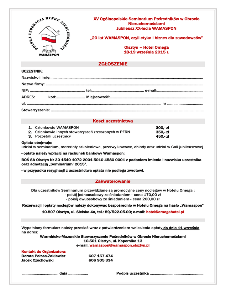 XV Ogólnopolskie Seminarium Pośredników w Obrocie Nieruchomościami Jubileusz XX-lecia WAMASPON „20 lat WAMASPON, czyli etyka i biznes dla zawodowców” Olsztyn – Hotel Omega 18-19 września 2015 r. ZGŁOSZENIE UCZESTNIK: Nazwisko i imię: ....................................................................................................................................................... Nazwa firmy: ............................................................................................................................................................. NIP: ....................................................... tel:.................................................... e-mail:.............................................. ADRES: kod:............................. Miejscowość:............................................................................................. ul. ...................................................................................................................................... nr …………………………….. Stowarzyszenie: ........................................................................................................................................................ Koszt uczestnictwa 1. Członkowie WAMASPON 2. Członkowie innych stowarzyszeń zrzeszonych w PFRN 3. Pozostali uczestnicy 300,- zł 350,- zł 450,- zł Opłata obejmuje: udział w seminarium, materiały szkoleniowe, przerwy kawowe, obiady oraz udział w Gali jubileuszowej - opłatę należy wpłacić na rachunek bankowy Wamaspon: BOŚ SA Olsztyn Nr 30 1540 1072 2001 5010 4580 0001 z podaniem imienia i nazwiska uczestnika oraz adnotacją „Seminarium’ 2015”. - w przypadku rezygnacji z uczestnictwa opłata nie podlega zwrotowi. Zakwaterowanie Dla uczestników Seminarium przewidziane są promocyjne ceny noclegów w Hotelu Omega : - pokój jednoosobowy ze śniadaniem– cena 170,00 zł - pokój dwuosobowy ze śniadaniem– cena 200,00 zł Rezerwacji i opłaty noclegów należy dokonywać bezpośrednio w Hotelu Omega na hasło „Wamaspon” 10-807 Olsztyn, ul. Sielska 4a, tel.: 89/522-05-00; e-mail: [email protected] Wypełniony formularz należy przesłać wraz z potwierdzeniem wniesienia opłaty do dnia 11 września na adres: Warmińsko-Mazurskie Stowarzyszenie Pośredników w Obrocie Nieruchomościami 10-501 Olsztyn, ul. Kopernika 13 e-mail: [email protected] Kontakt do Organizatora: Dorota Połosa-Żakiewicz Jacek Czechowski …………………………..… dnia ………………. 607 157 474 606 905 334 Podpis uczestnika …………………………………………….