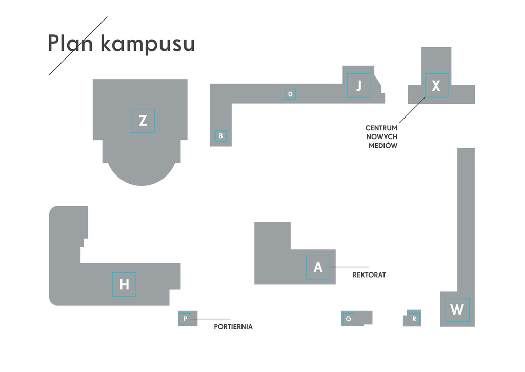Plan kampusu J D Z CENTRUM NOWYCH MEDIÓW B A REKTORAT H P PORTIERNIA X G R W Plan kampusu A B Rektorat Dziekanat Wydziału Reżyserii Filmoweji Telewizyjnej Dziekanat Wydziału Operatorskiego i Realizacji TV Animacja i Efekty Specjalne - Sekretariat Dział Dźwięku Sala Senatu Pracownia Multimedialna Magazyn Kostiumów Hala Filmowa Sala Projekcyjna - Kino Szkolne Sala Projekcyjna Stołówka Siłownia Kanclerz Kwestor Dział Księgowości Dział Kadr i Spraw Pracowniczych Dział Płac Kasa Dział Techniki Zdjęciowej Dział Zaopatrzenia BHP D G H Wydział Aktorski Realizacja Telewizyjna – Sekretariat Biblioteka i Ośrodek Informacji Filmowej Dział Oświetlenia Biuro Promocji i Współpracy z Zagranicą Wydawnictwo X P R W Zakład Produkcji Filmów Szkolnych Zakład Plastyki Portiernia Sekcja Środków Pozabudżetowych Dziekanat Wydziału Organizacji Produkcji Filmowej i Telewizyjnej Montaż Filmowy – Sekretariat Fotografia – Sekretariat Archiwum Filmowe Samorząd Studencki Koło Naukowe Nowych Mediów Galeria Szklarnia Z J Centrum Nowych Mediów Scenariopisarstwo – Sekretariat Hala Filmowa Hala Telewizyjna Księgarnia Wydawnictwa Ksero Pracownia Komputerowa Bufet ZET Cafe