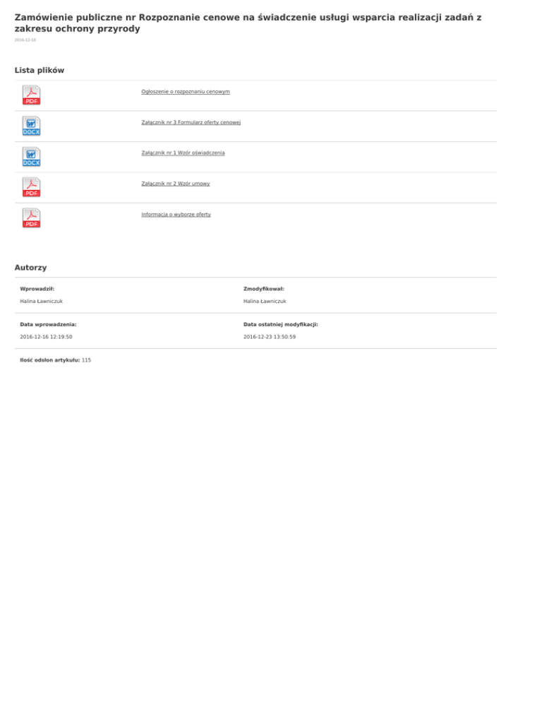 Zamówienie publiczne nr Rozpoznanie cenowe na świadczenie usługi wsparcia realizacji zadań z zakresu ochrony przyrody 2016-12-16 Lista plików Ogłoszenie o rozpoznaniu cenowym Załącznik nr 3 Formularz oferty cenowej Załącznik nr 1 Wzór oświadczenia Załącznik nr 2 Wzór umowy Informacja o wyborze oferty Autorzy Wprowadził: Zmodyfikował: Halina Ławniczuk Halina Ławniczuk Data wprowadzenia: Data ostatniej modyfikacji: 2016-12-16 12:19:50 2016-12-23 13:50:59 Ilość odsłon artykułu: 115