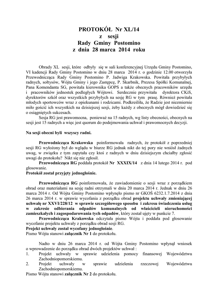 PROTOKÓŁ Nr XL/14 z sesji Rady Gminy Postomino z dnia 28