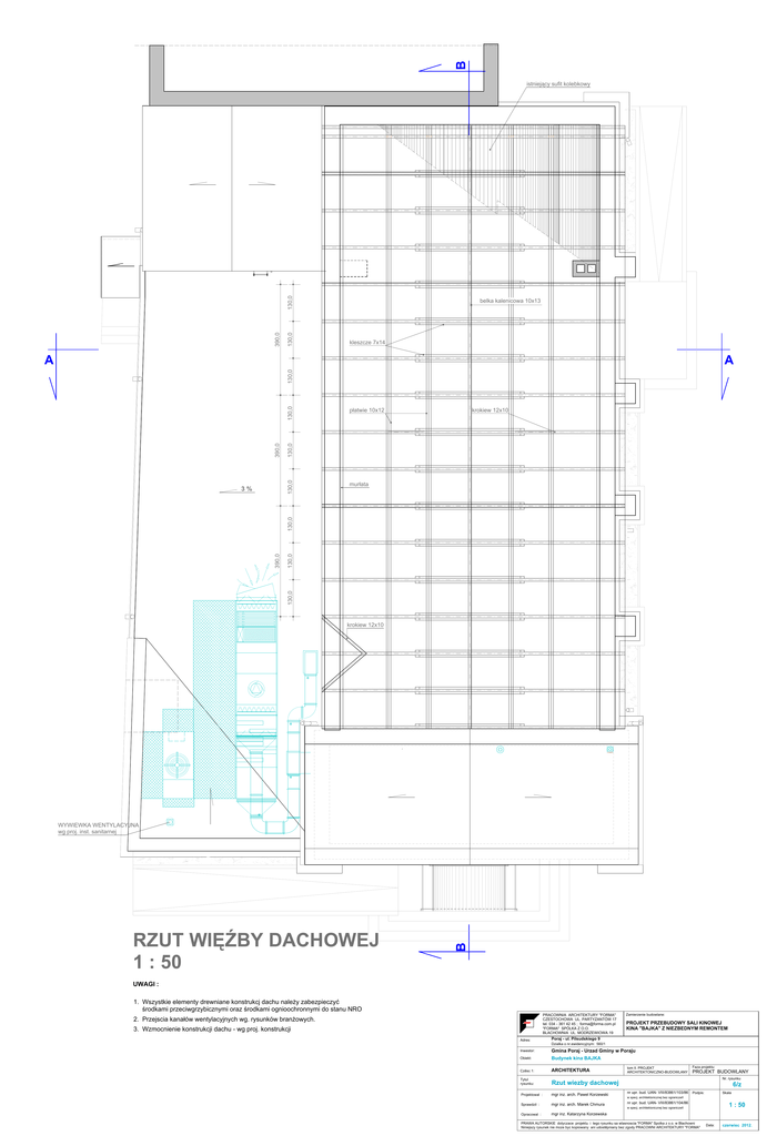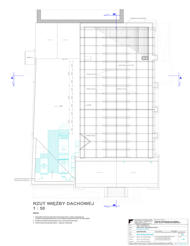 B 130,0 390,0 130,0 istniejący sufit kolebkowy belka kalenicowa 10x13 kleszcze 7x14 A krokiew 12x10 murłata 130,0 130,0 390,0 130,0 3% płatwie 10x12 130,0 130,0 390,0 130,0 130,0 A krokiew 12x10 RZUT WIĘŹBY DACHOWEJ 1 : 50 B WYWIEWKA WENTYLACYJNA wg proj. inst. sanitarnej UWAGI : 1. Wszystkie elementy drewniane konstrukcj dachu należy zabezpieczyć środkami przeciwgrzybicznymi oraz środkami ognioochronnymi do stanu NRO PRACOWNIA ARCHITEKTURY "FORMA" CZESTOCHOWA UL. PARTYZANTÓW 17 tel. 034 - 361 42 45 ; [email protected] "FORMA" SPÓLKA Z O.O. BLACHOWNIA UL. MODRZEWIOWA 19 2. Przejscia kanałów wentylacyjnych wg. rysunków branżowych. 3. Wzmocnienie konstrukcji dachu - wg proj. konstrukcji Adres: Zamierzenie budowlane: PROJEKT PRZEBUDOWY SALI KINOWEJ KINA "BAJKA" Z NIEZBEDNYM REMONTEM Poraj - ul. Pilsudskiego 9 Dzialka o nr.ewidencyjnym: 560/1 Inwestor: Gmina Poraj - Urzad Gminy w Poraju Obiekt: Budynek kina BAJKA Czêsc 1: ARCHITEKTURA Tytul rysunku: Rzut wiezby dachowej Projektowal : mgr inz. arch. Pawel Korzewski Sprawdzil : mgr inz. arch. Marek Chmura tom II. PROJEKT ARCHITEKTONICZNO-BUDOWLANY Faza projektu: PROJEKT BUDOWLANY Nr. rysunku 6/z nr upr. bud. UAN- VIII/83861/103/86 Skala Podpis: w specj. architektonicznej bez ograniczeñ nr upr. bud. UAN- VIII/83861/104/86 1 : 50 w specj. architektonicznej bez ograniczeñ Opracowal : mgr inz. Katarzyna Korzewska PRAWA AUTORSKIE dotyczace projektu i tego rysunku sa wlasnoscia "FORMA" Spolka z o.o. w Blachowni Niniejszy rysunek nie moze byc kopiowany ani udostêpniany bez zgody PRACOWNI ARCHITEKTURY "FORMA" Data: czerwiec 2012.